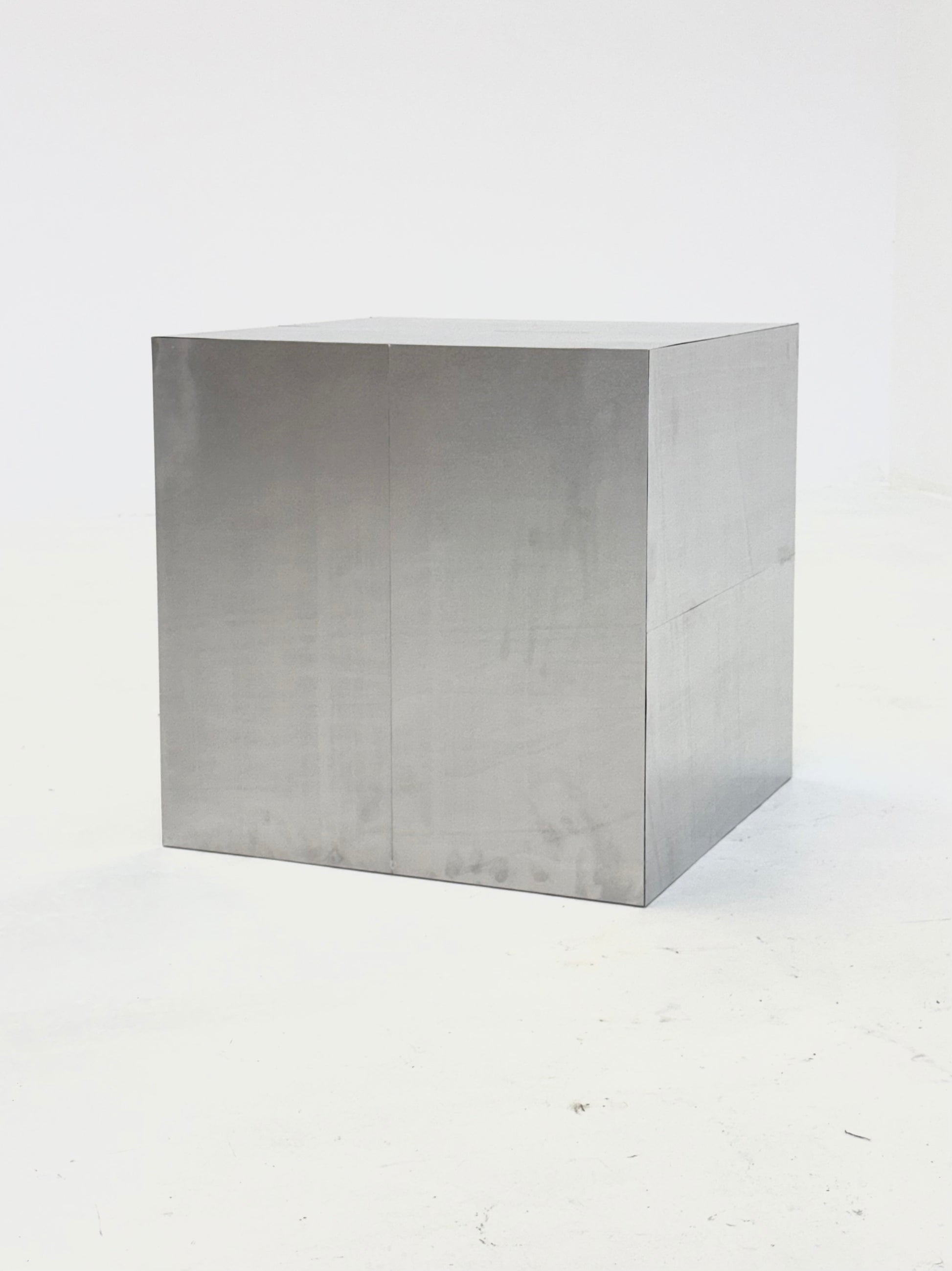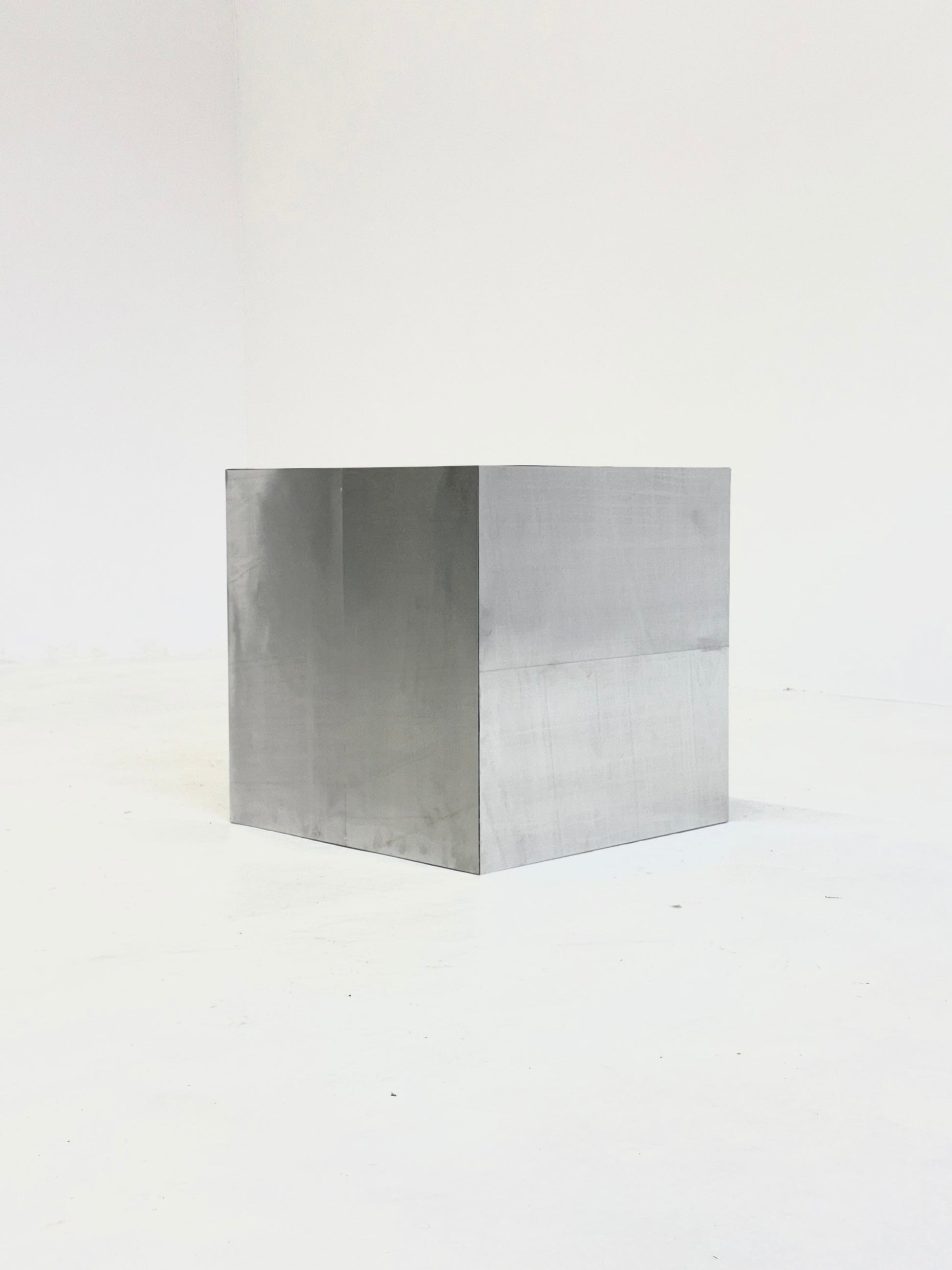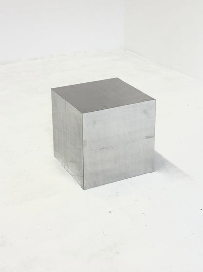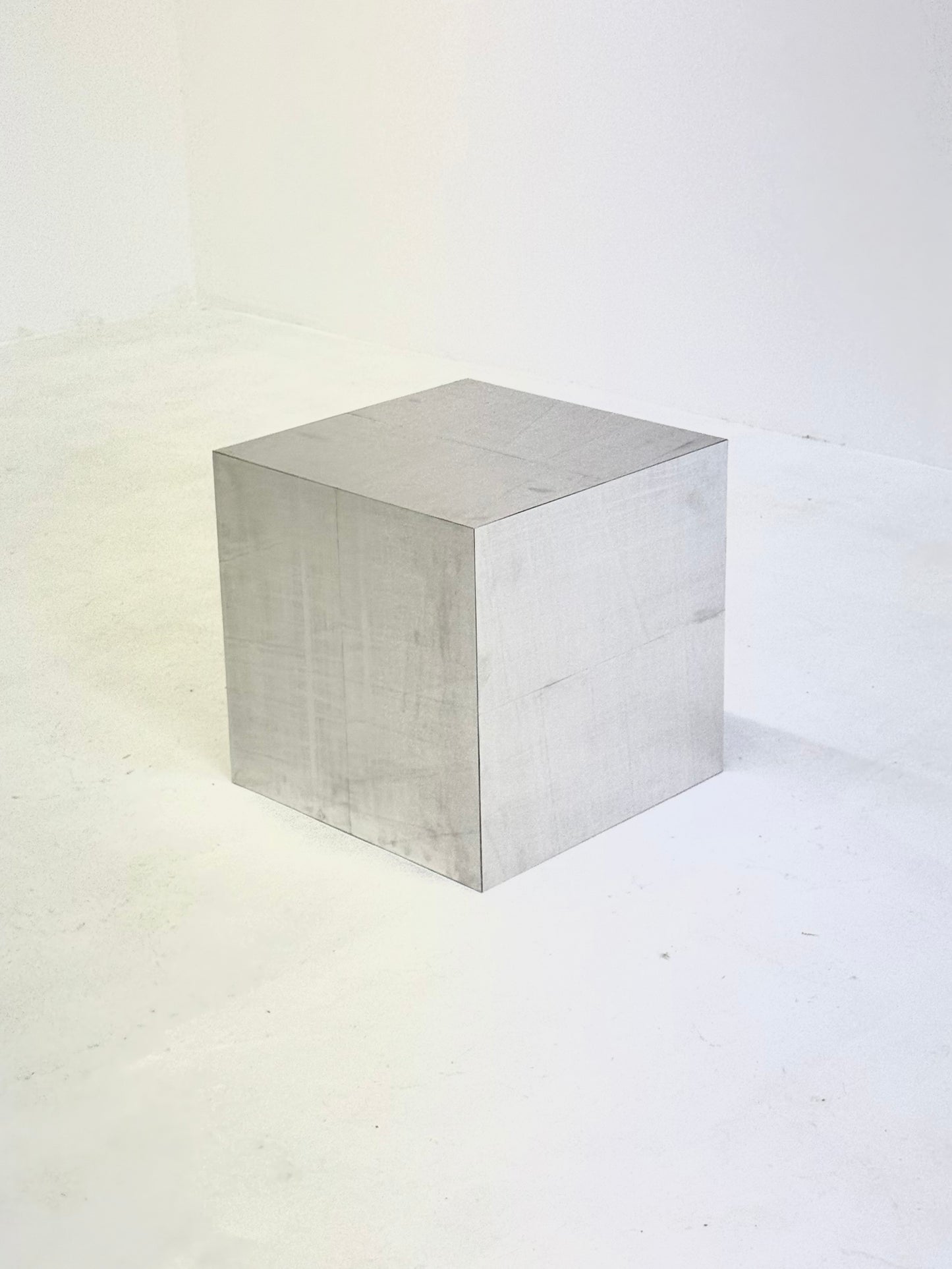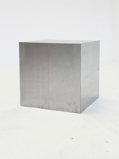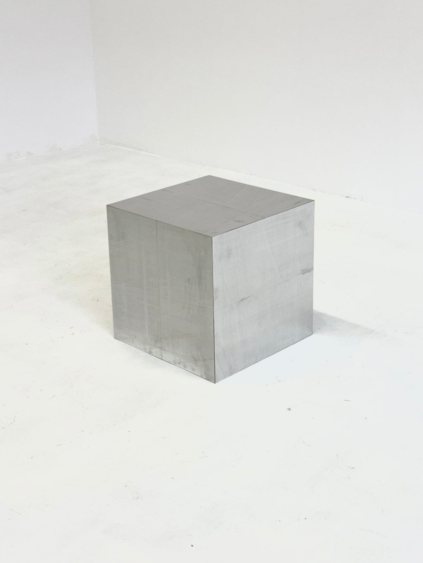 Strakke kubusvorm bekleed met aluminium platen. Dit blok kan worden gebruikt als bijzettafel, sokkel of presentatieblok. Dankzij het ingetogen ontwerp en het gebruik van metaal past het object moeiteloos in verschillende interieurs — van modern tot eclectisch.