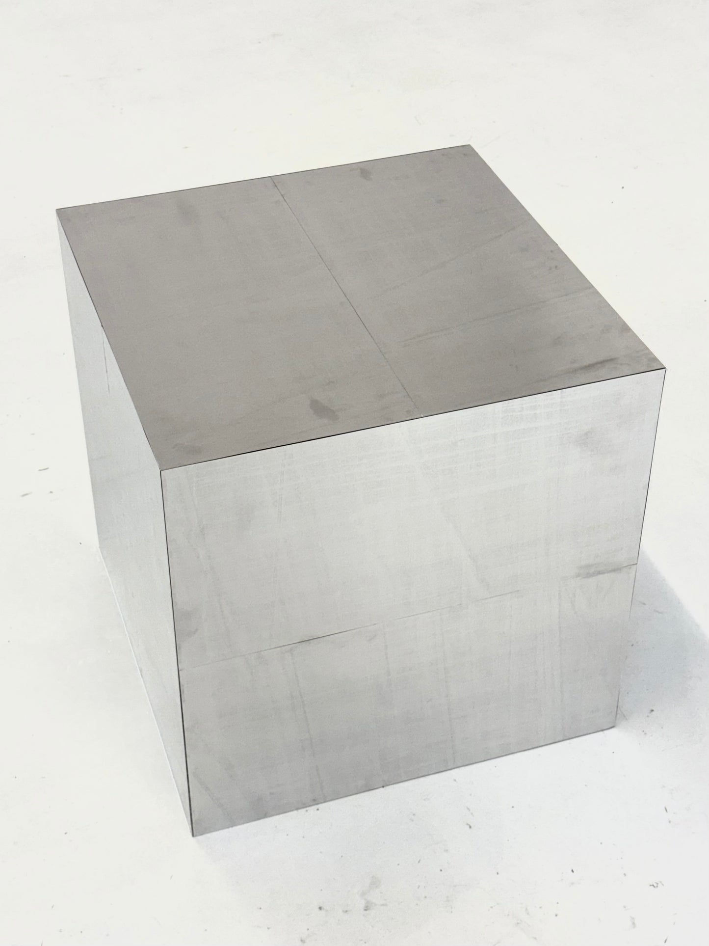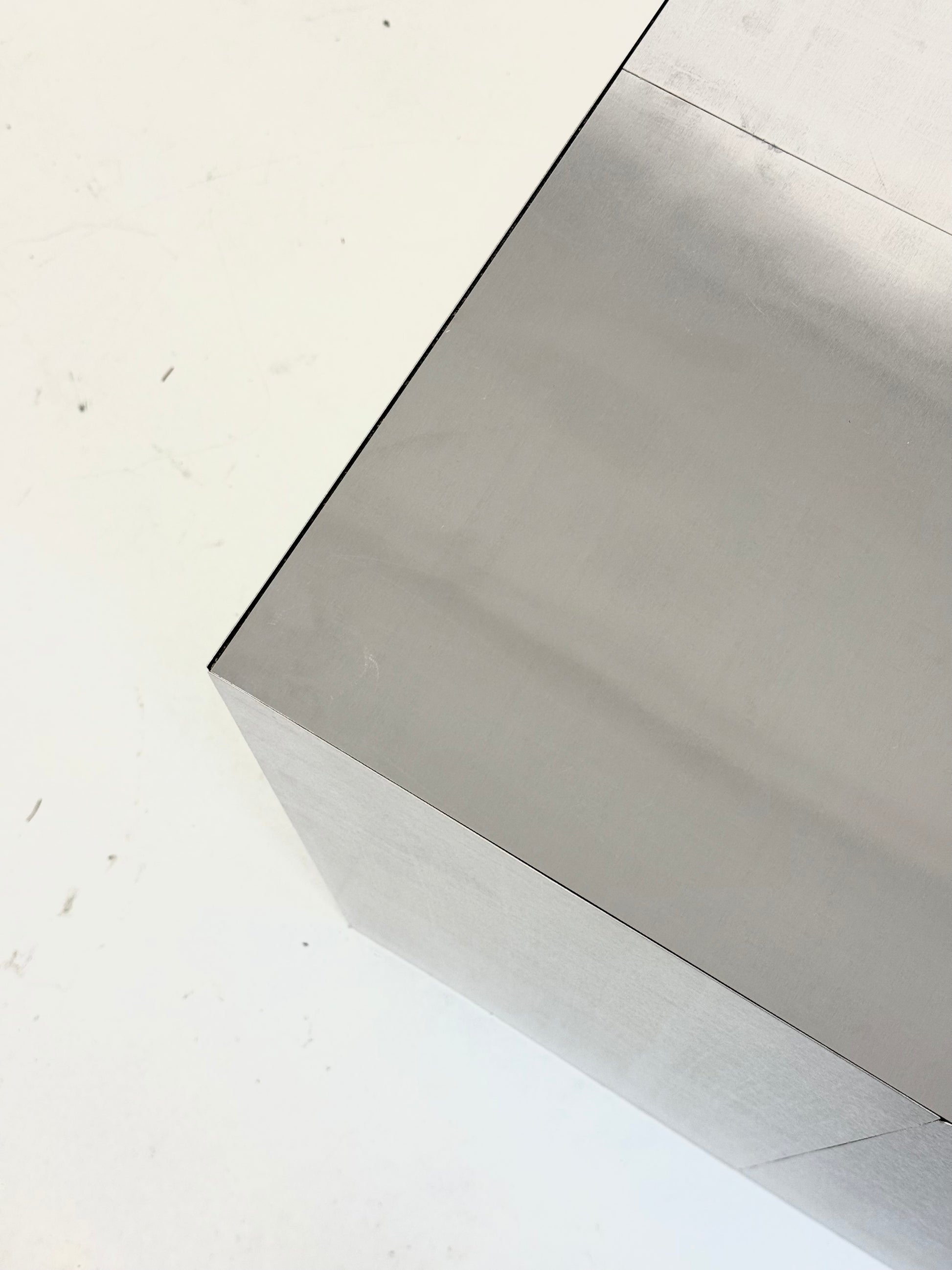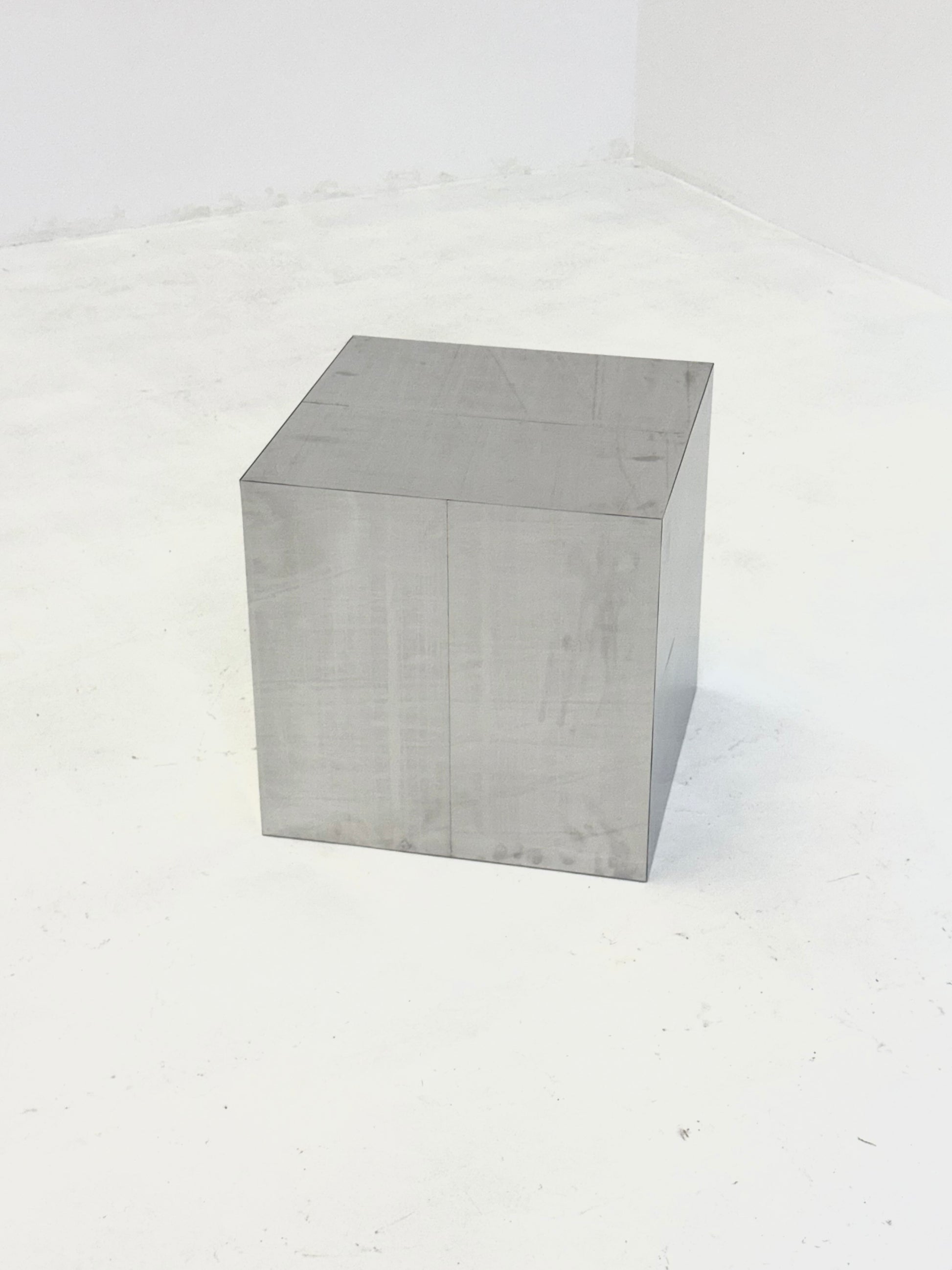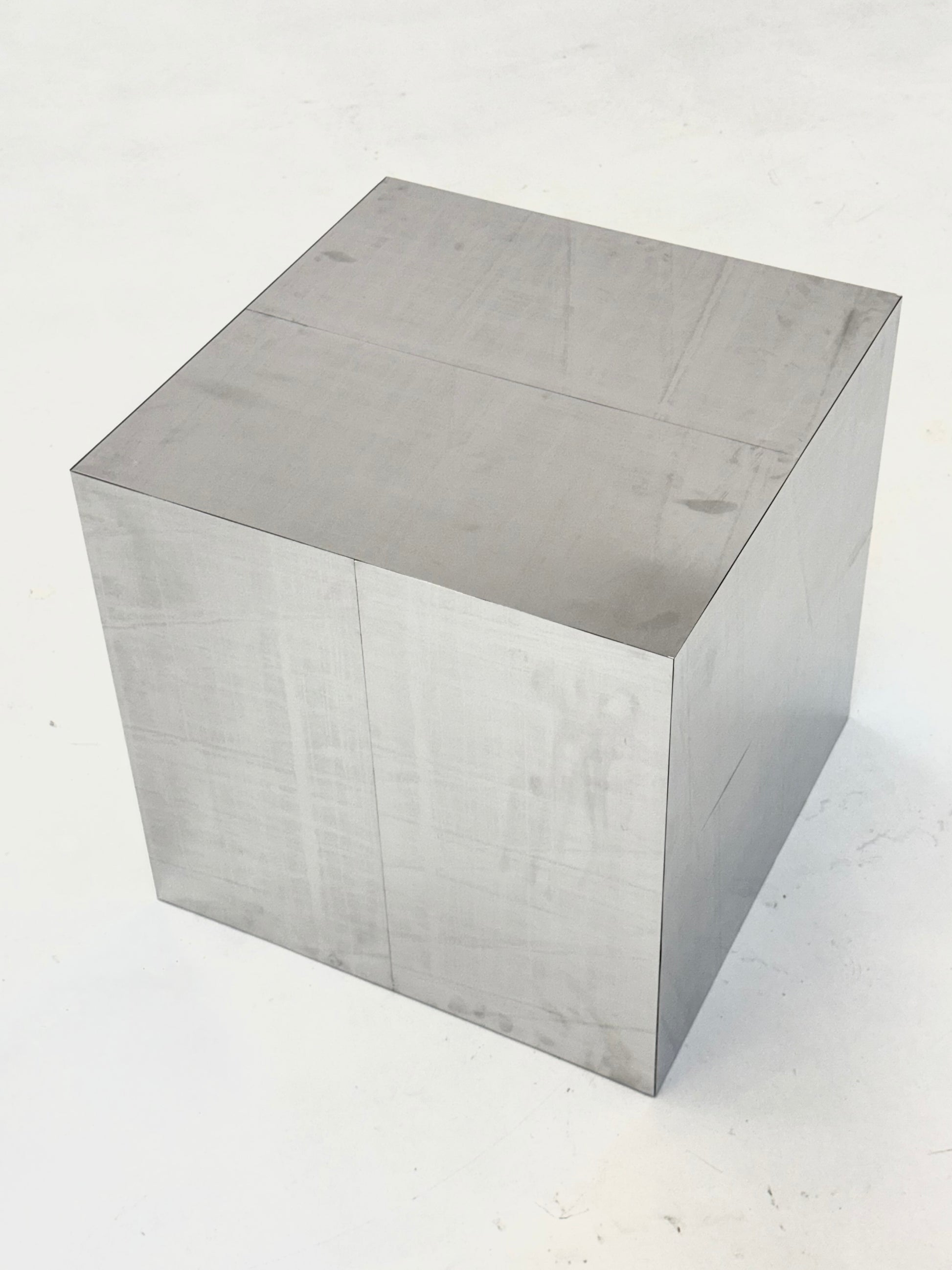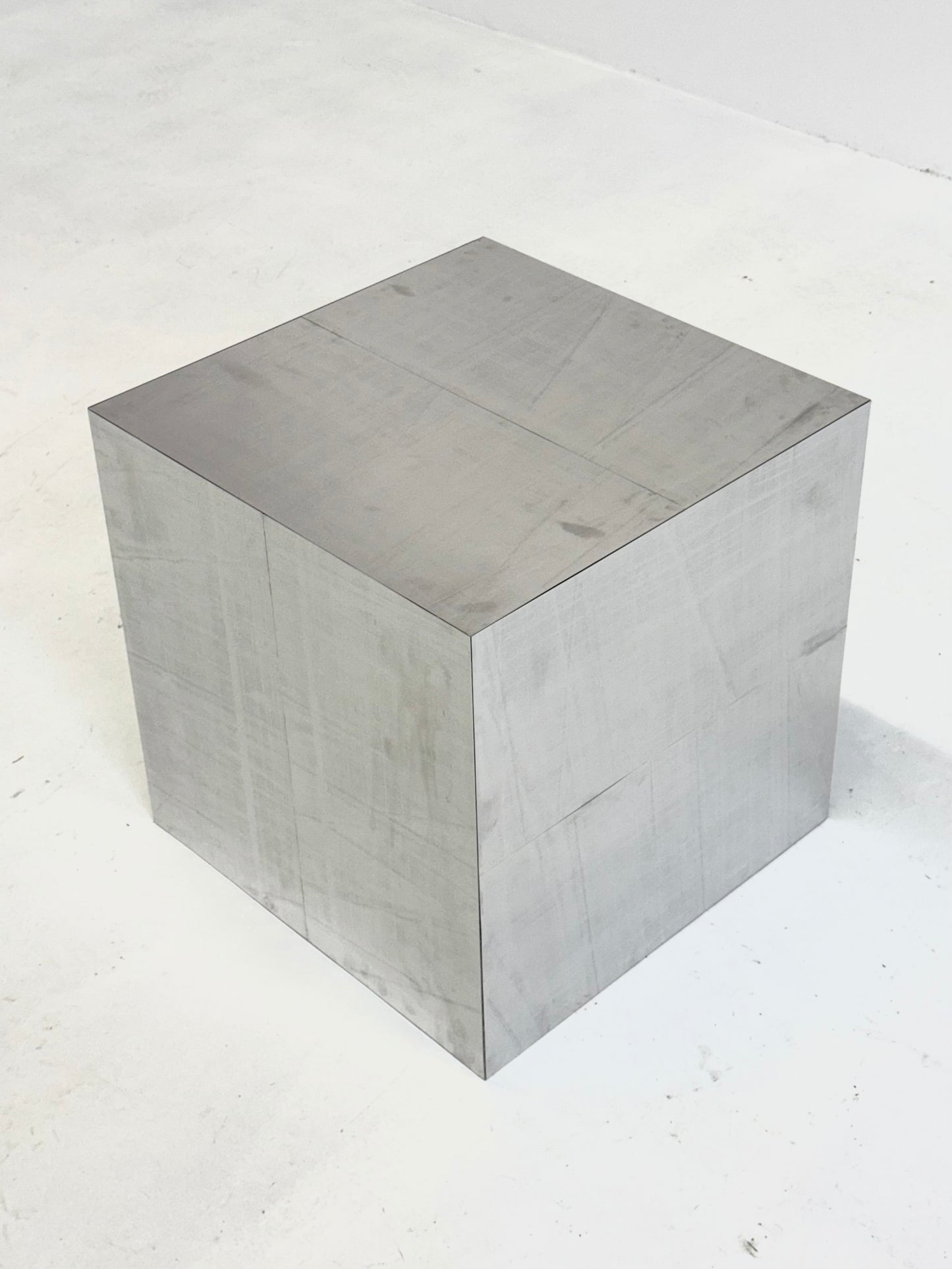 Strakke kubusvorm bekleed met aluminium platen. Dit blok kan worden gebruikt als bijzettafel, sokkel of presentatieblok. Dankzij het ingetogen ontwerp en het gebruik van metaal past het object moeiteloos in verschillende interieurs — van modern tot eclectisch.