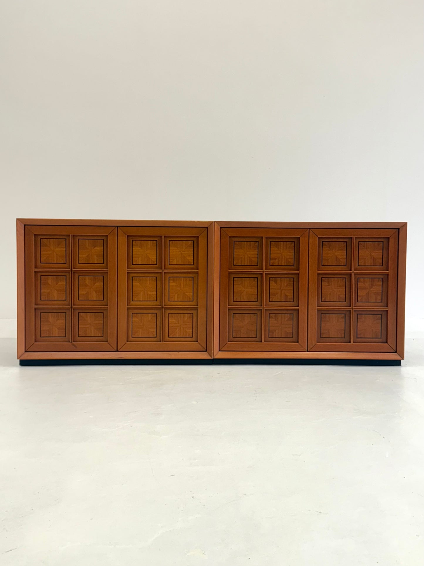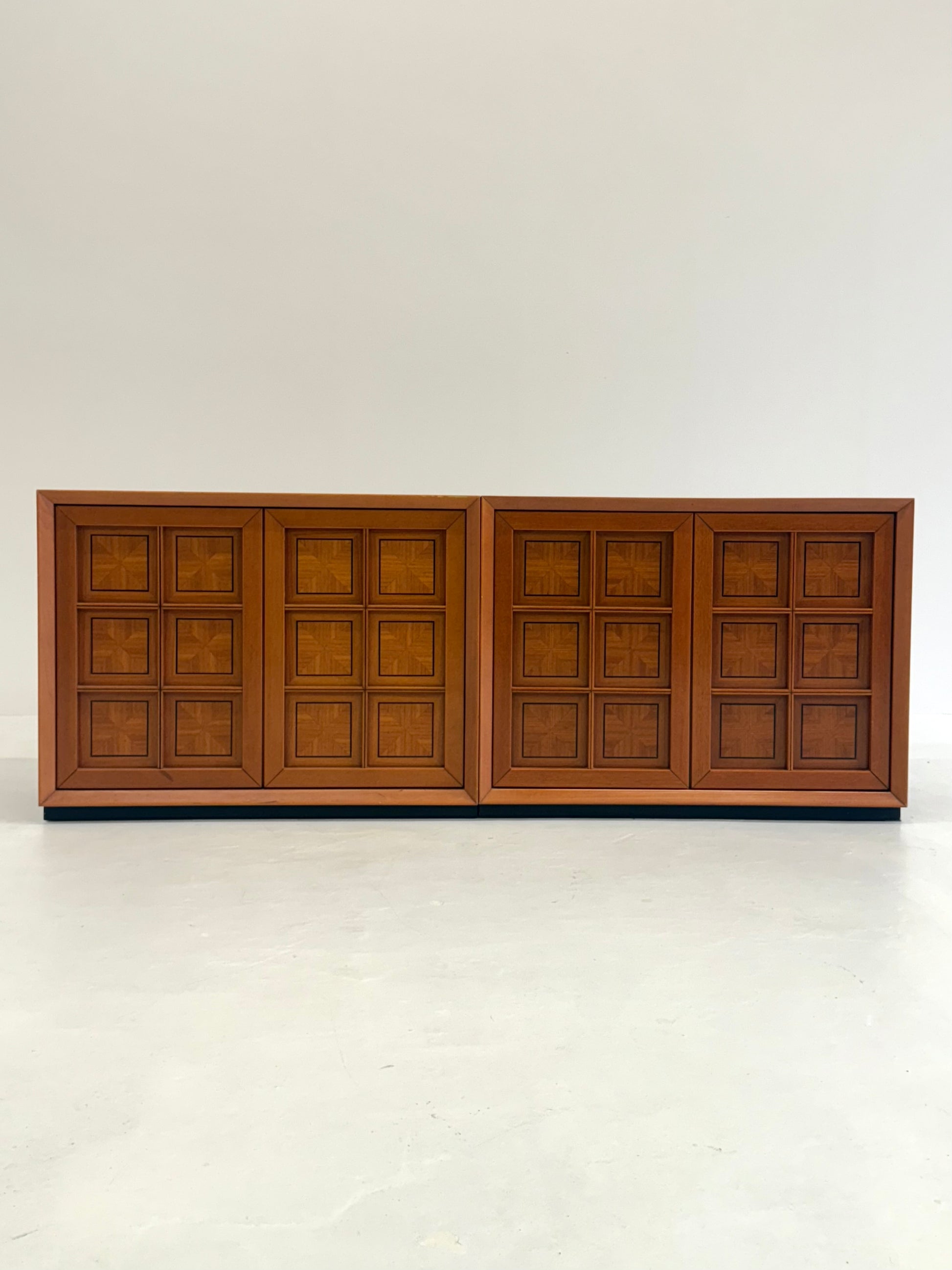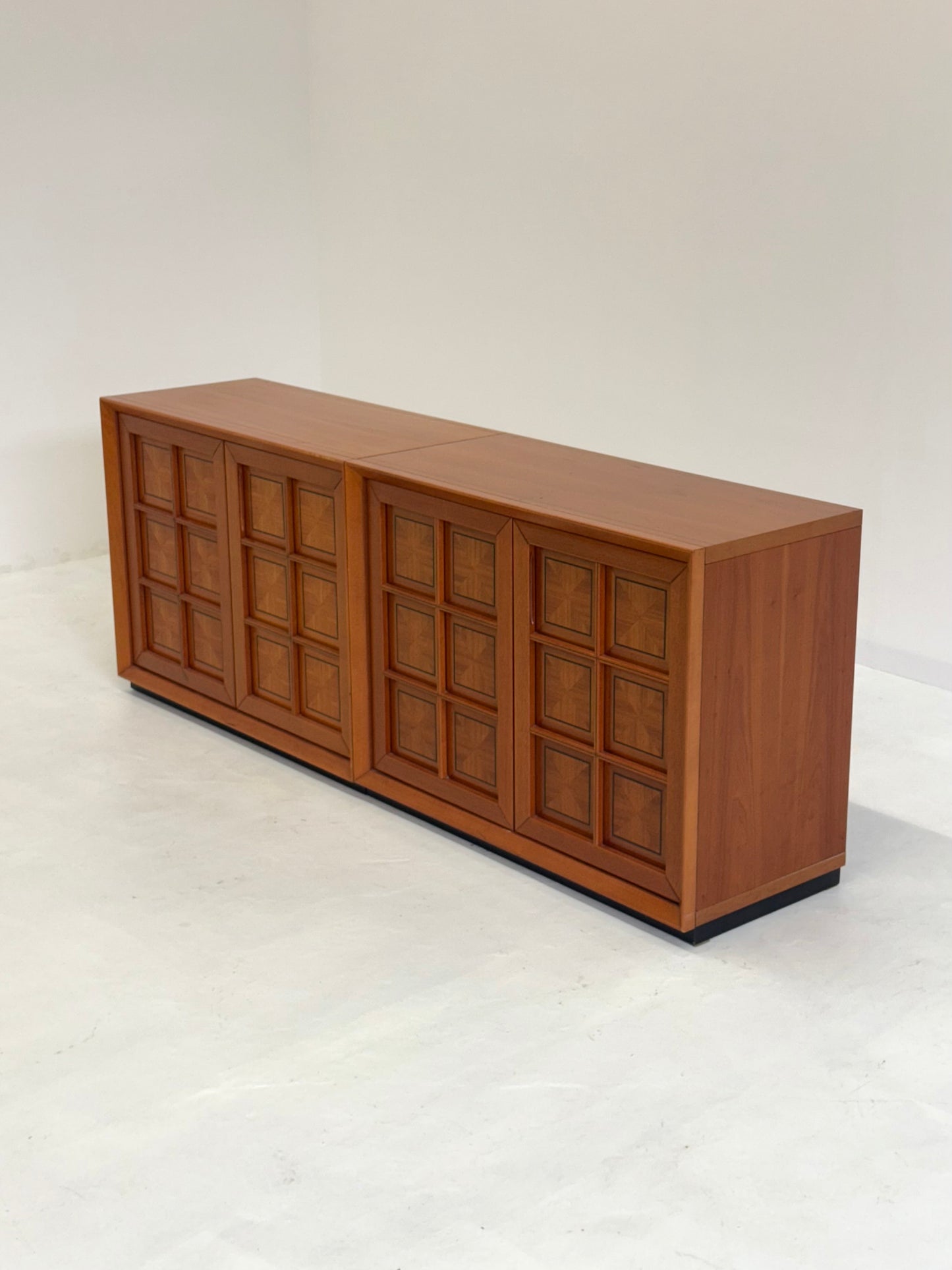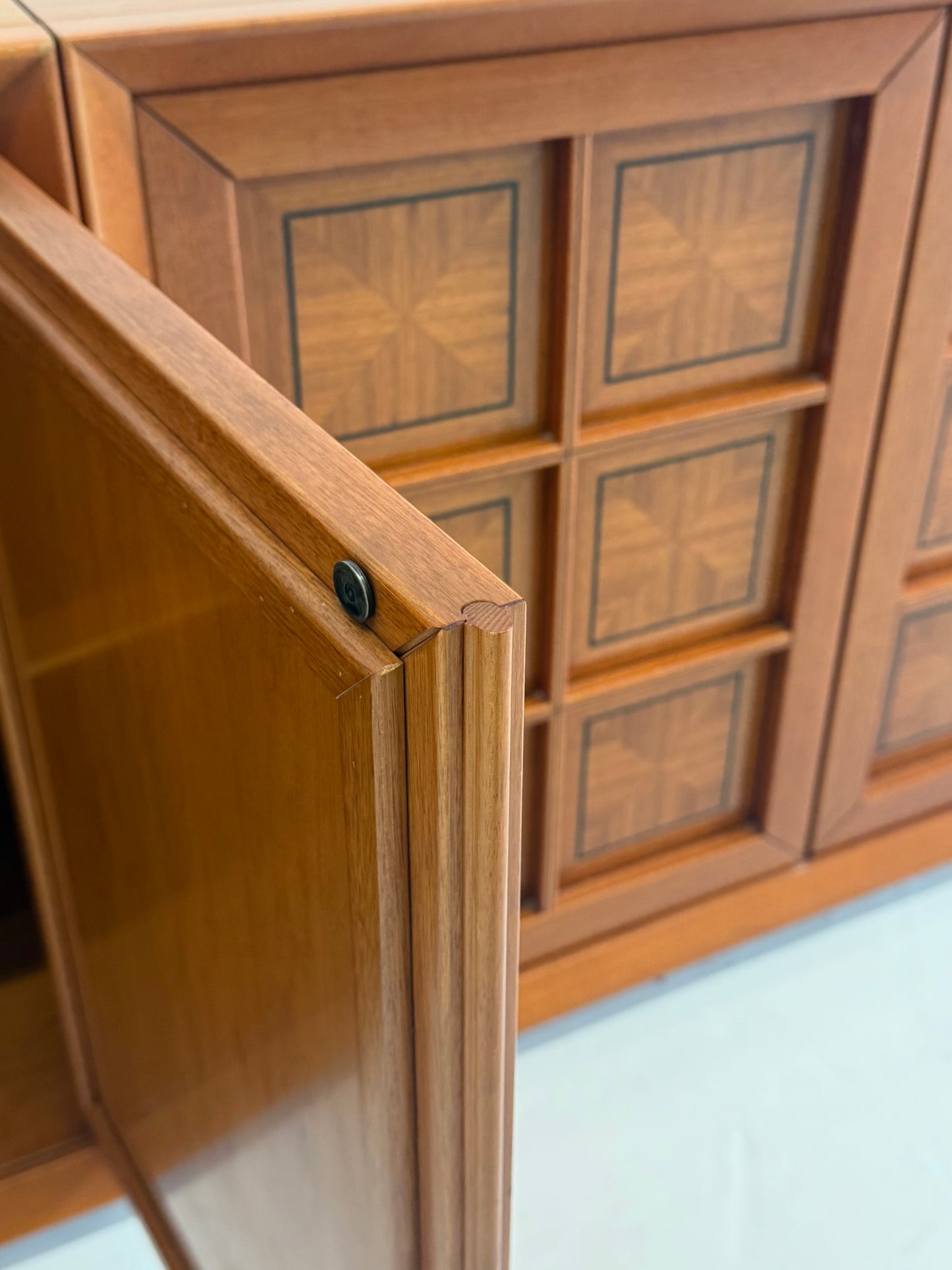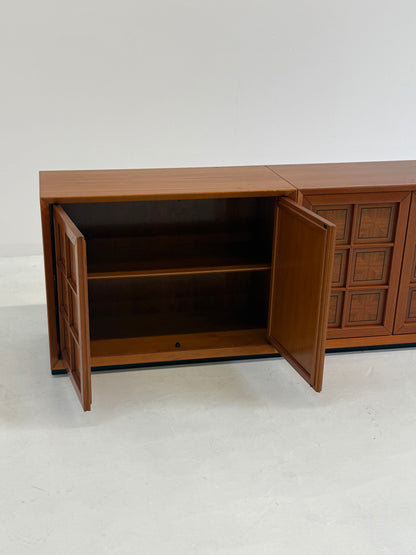 Imposant vintage brutalist sideboard uit Italië, ontworpen door Caccia alla Volpe voor Linea Arredo. Het meubel valt op door het geometrische reliëfpatroon en de rijke houttekening – een uitgesproken ontwerp dat kracht en karakter toevoegt aan ieder interieur.
