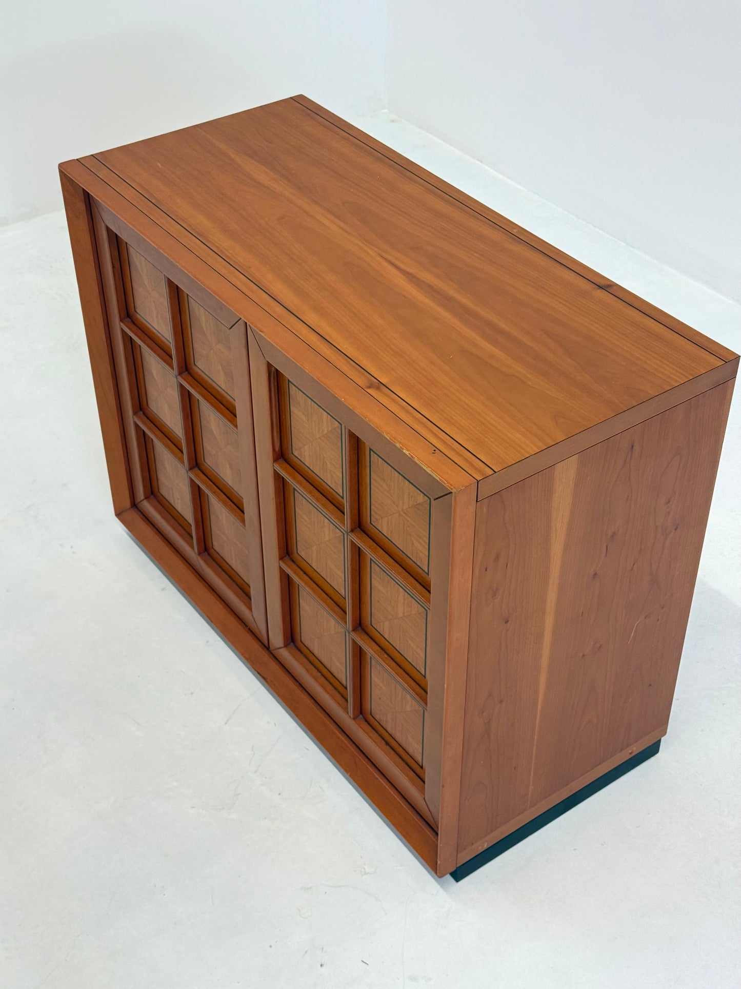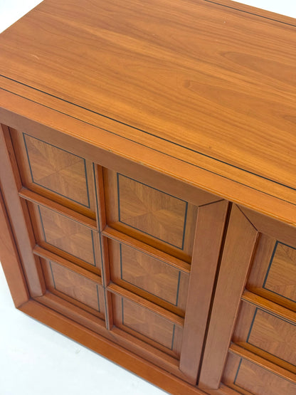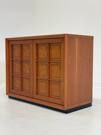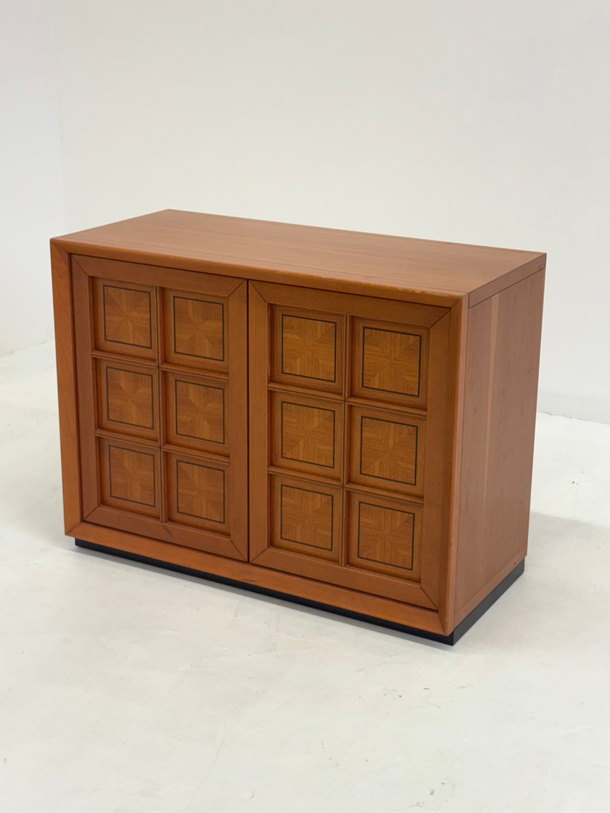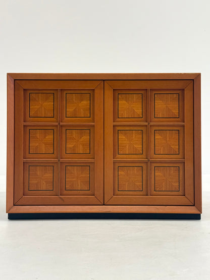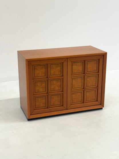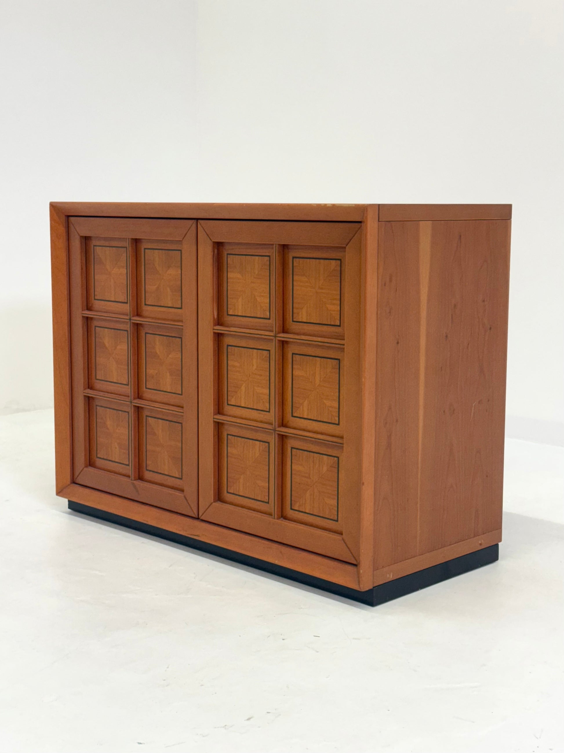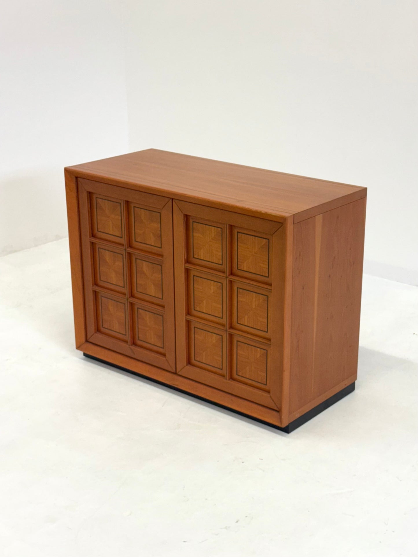 Imposant vintage brutalist sideboard uit Italië, ontworpen door Caccia alla Volpe voor Linea Arredo. Het meubel valt op door het geometrische reliëfpatroon en de rijke houttekening – een uitgesproken ontwerp dat kracht en karakter toevoegt aan ieder interieur.