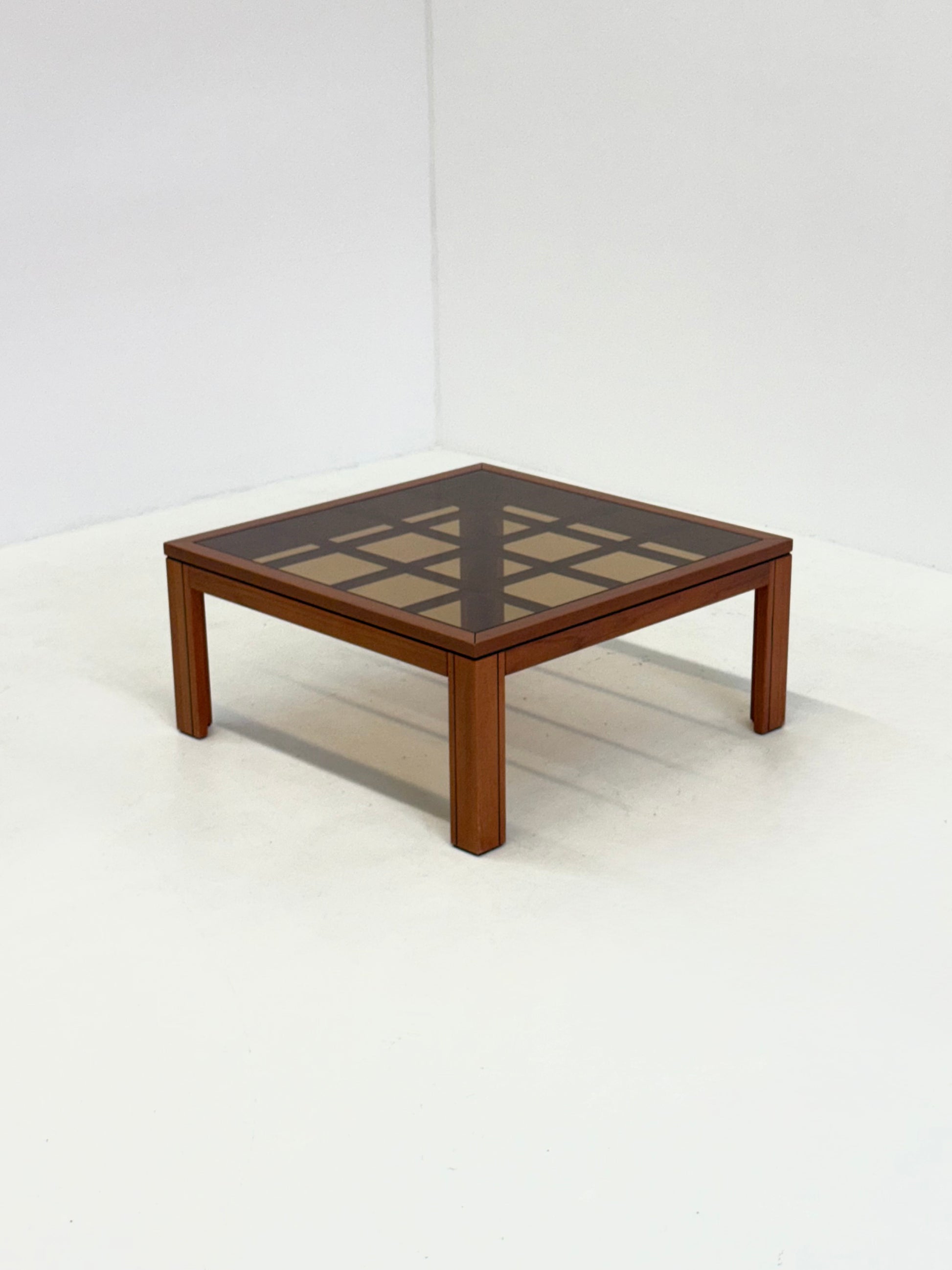 De brutalist salontafel uit Italië, ontworpen door Caccia alla Volpe voor Linea Arredo. Het houten frame is voorzien van een geometrisch reliëfpatroon wat de tafel een krachtig en karaktervol uiterlijk geeft.