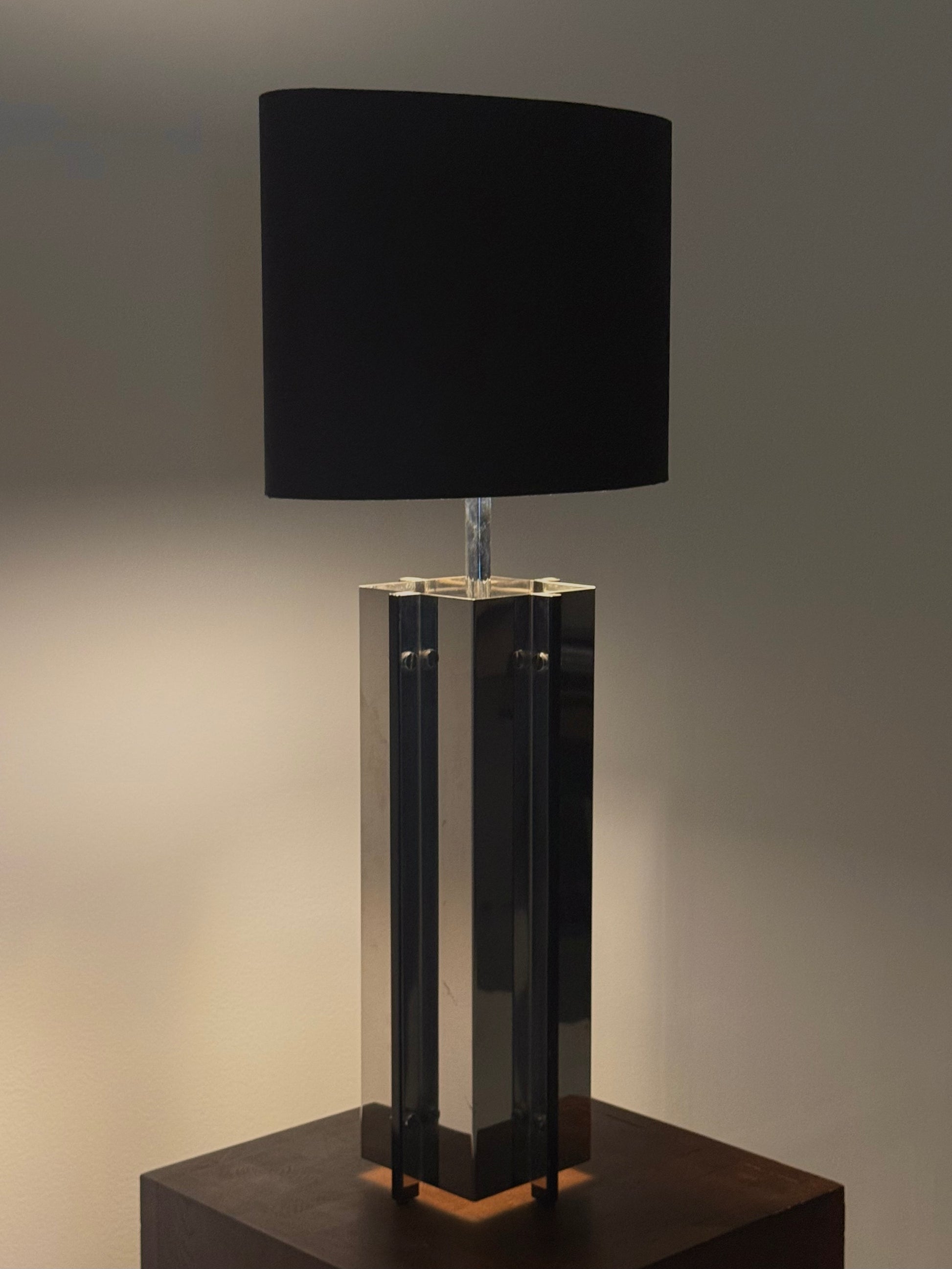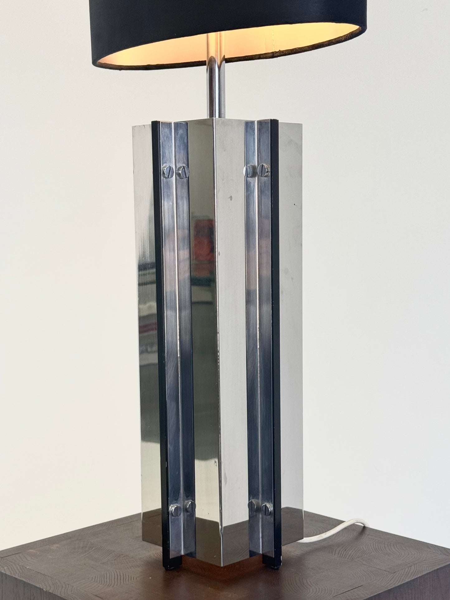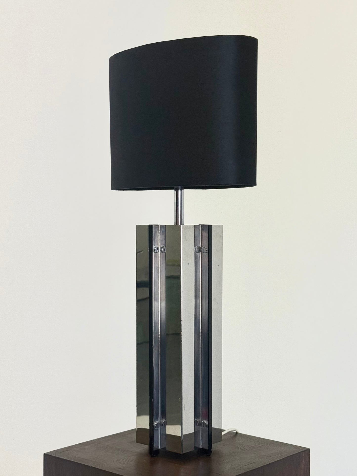 Deze tafellamp is ontworpen door Goffredo Reggiani en vervaardigd uit verchroomd staal, wat een strakke en glanzende uitstraling geeft. Het ontwerp kenmerkt zich door langwerpige en strakke lijnen die een minimalistische maar krachtige esthetiek uitstralen. De lamp heeft een verfijnde, eigentijdse uitstraling die perfect past binnen het Italiaanse design uit de jaren '70.