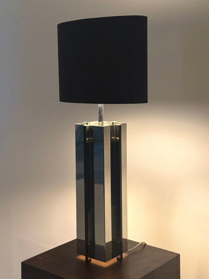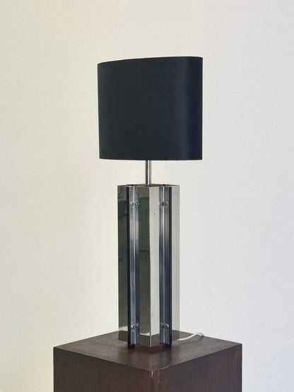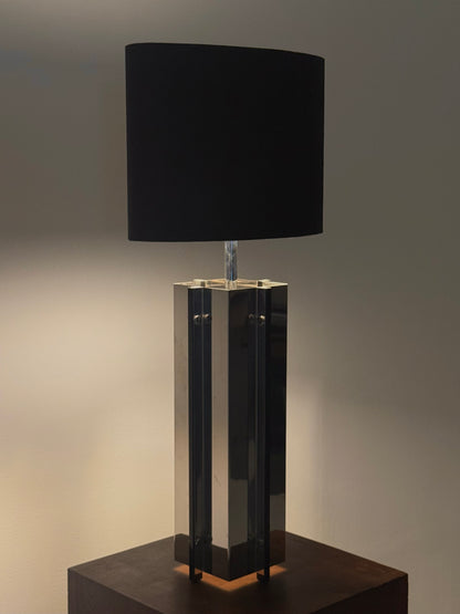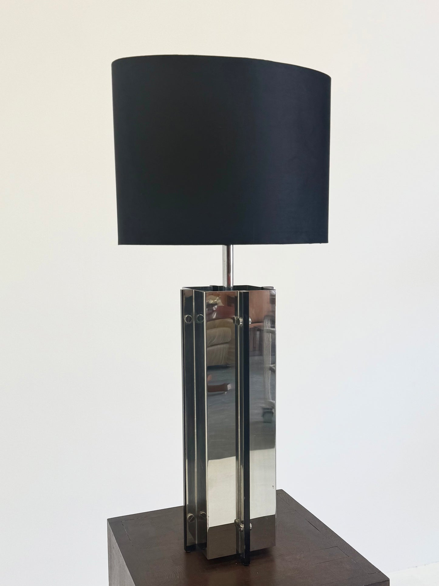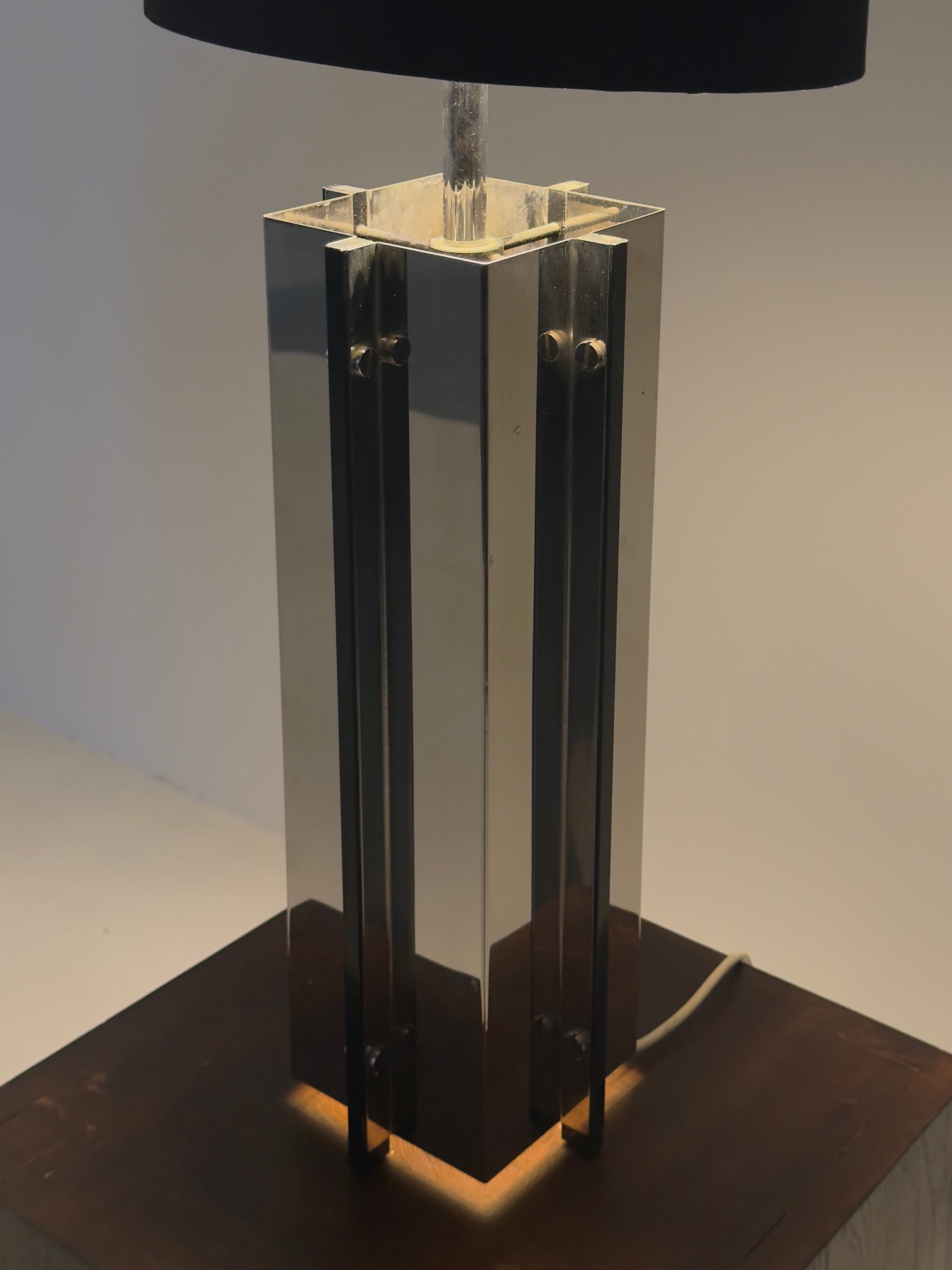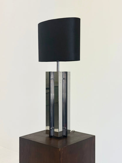 Deze tafellamp is ontworpen door Goffredo Reggiani en vervaardigd uit verchroomd staal, wat een strakke en glanzende uitstraling geeft. Het ontwerp kenmerkt zich door langwerpige en strakke lijnen die een minimalistische maar krachtige esthetiek uitstralen. De lamp heeft een verfijnde, eigentijdse uitstraling die perfect past binnen het Italiaanse design uit de jaren '70.