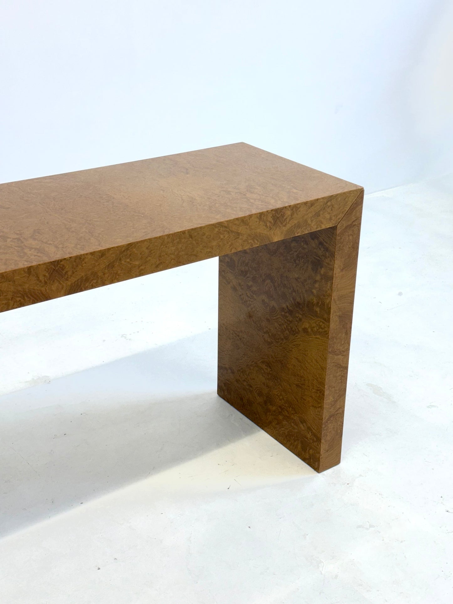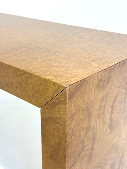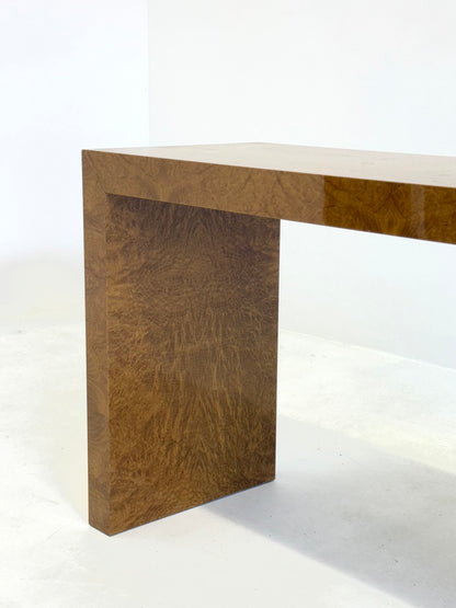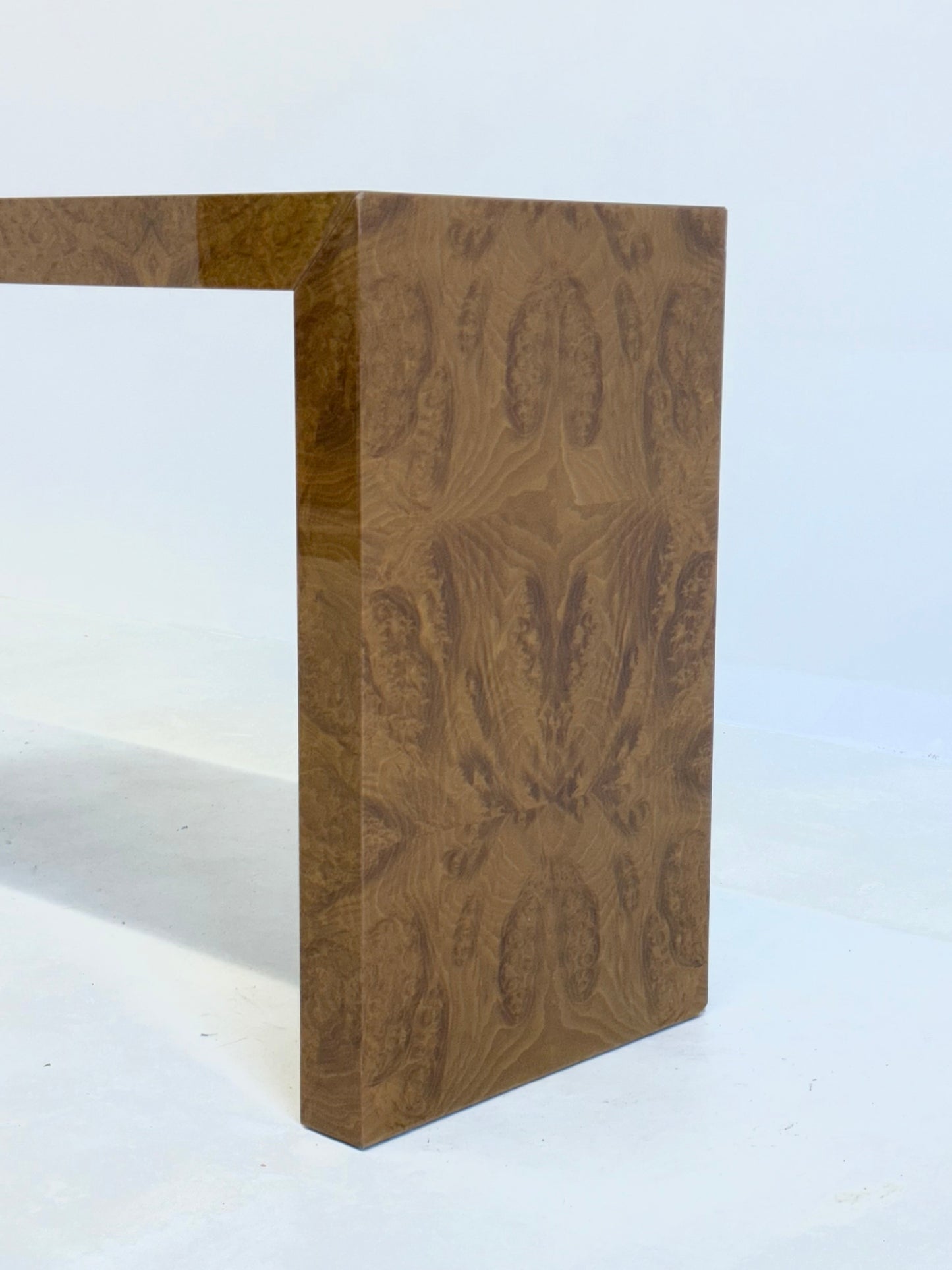 Deze console tafel of wandmeubel is een prachtig voorbeeld van Italiaans design van Selva, uitgevoerd in burlwood / walnoot. Het meubel heeft een verfijnde uitstraling en biedt een stijlvolle toevoeging aan elke ruimte, perfect voor het plaatsen van decoratieve items of als praktische opbergruimte.