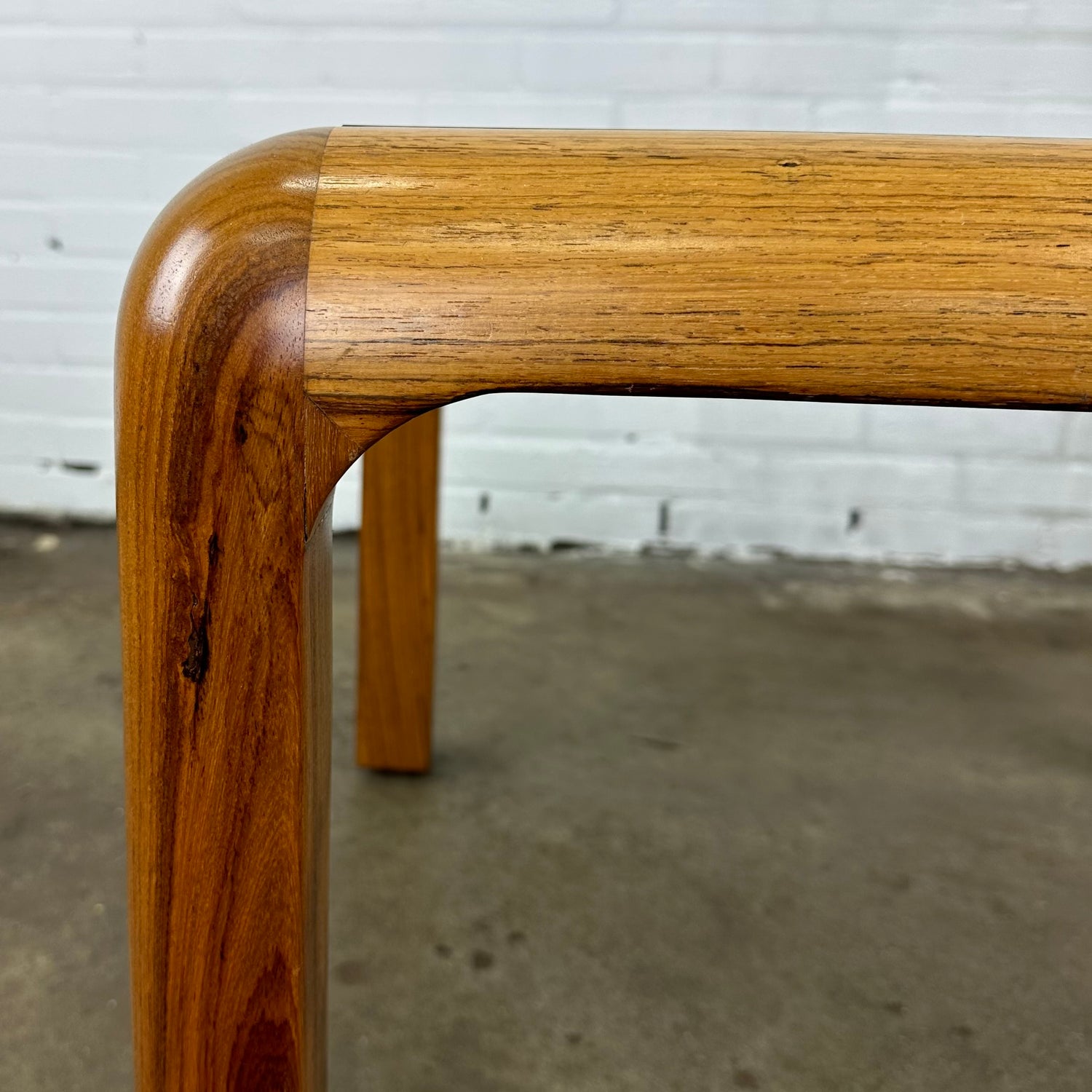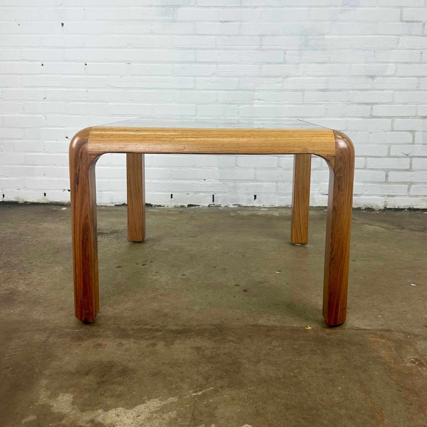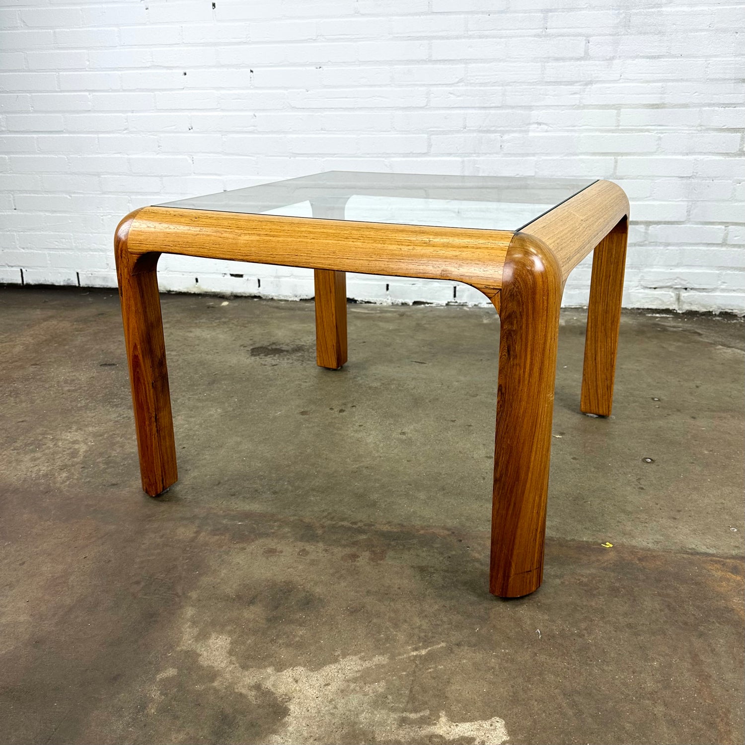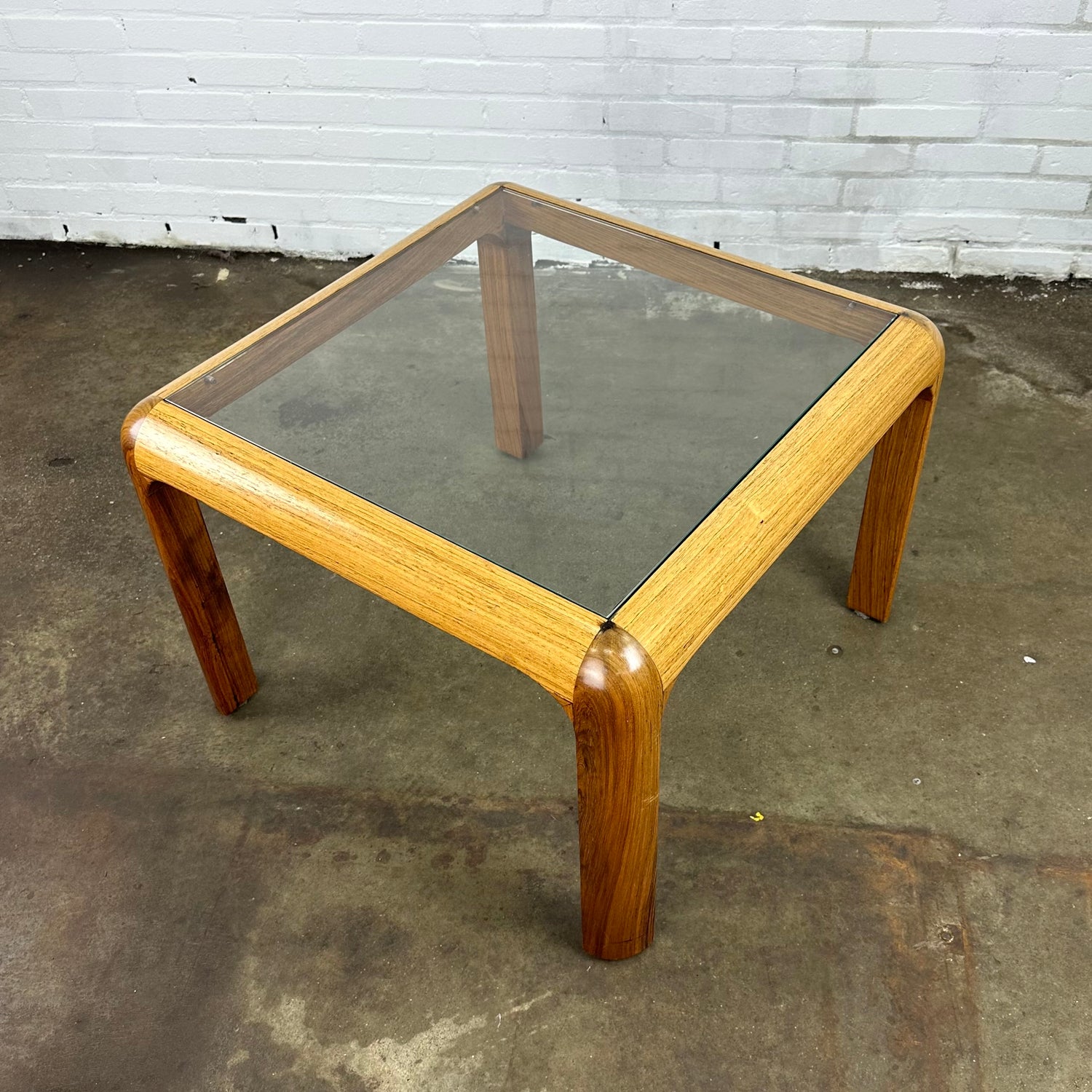 Omschrijving: Vintage salontafel met houten frame en glazen blad in Deens design