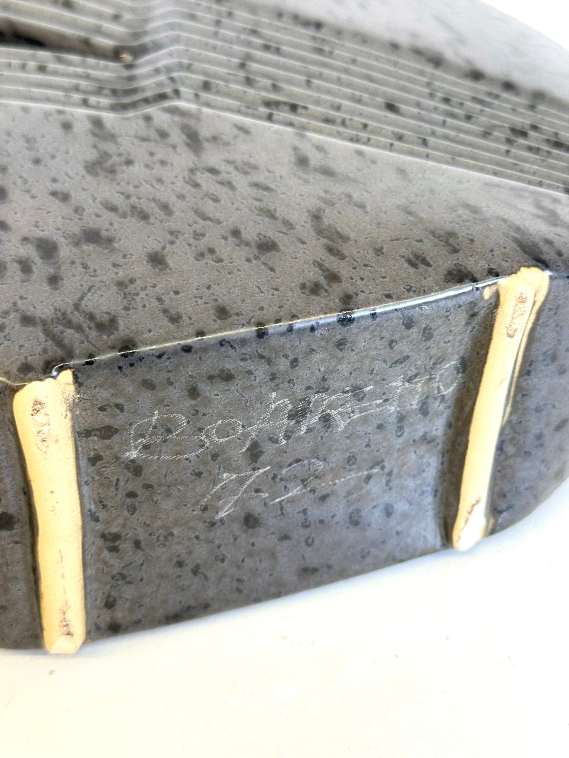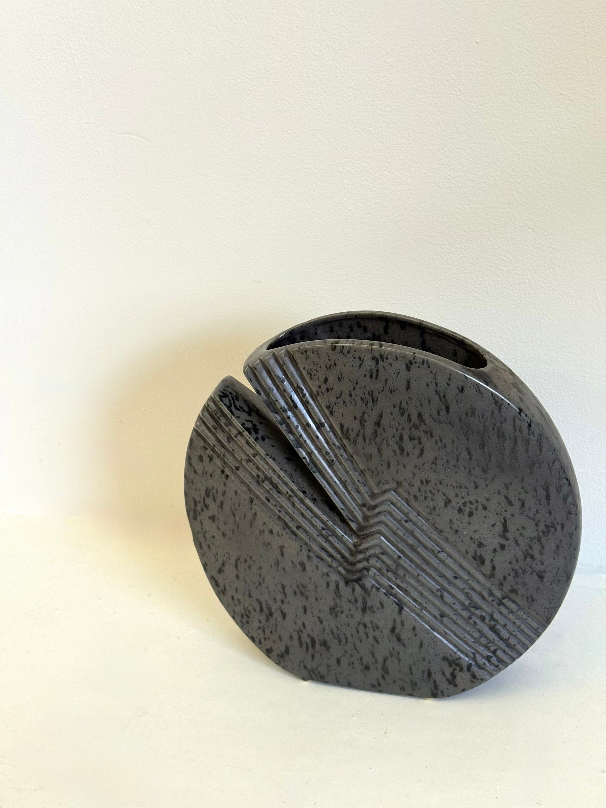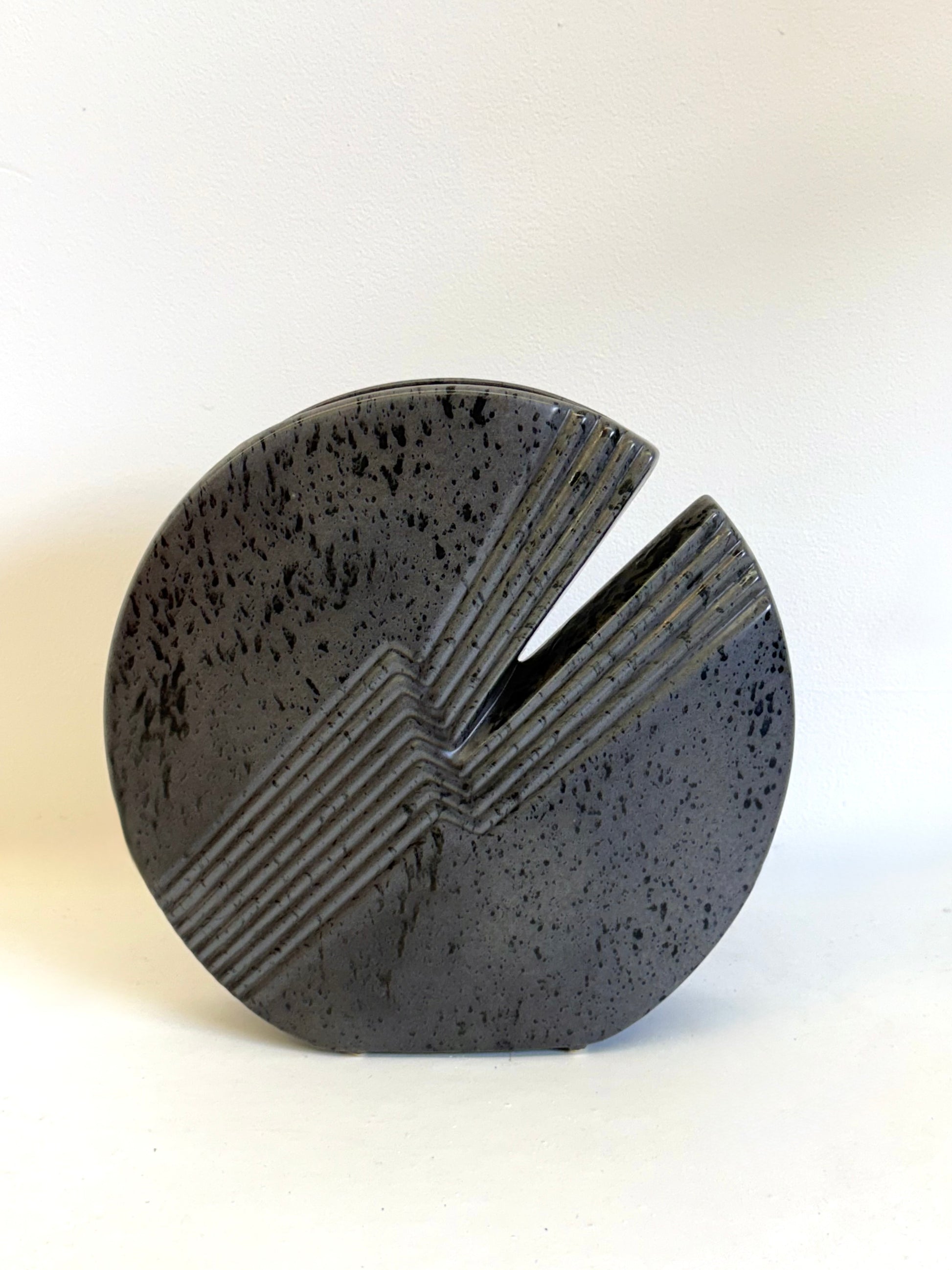 Deze donkergrijze keramische vaas van Nereo Boaretto uit 1972 heeft een bijzondere lenticulaire vorm met een smalle opening en een diepe, concave inkeping die het design een sculpturale uitstraling geeft. De vaas combineert ambachtelijke precisie met de expressieve, bijna primitieve stijl die Boaretto kenmerkt. Een opvallend kunstwerk voor in elk interieur.