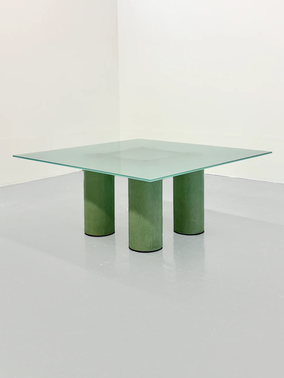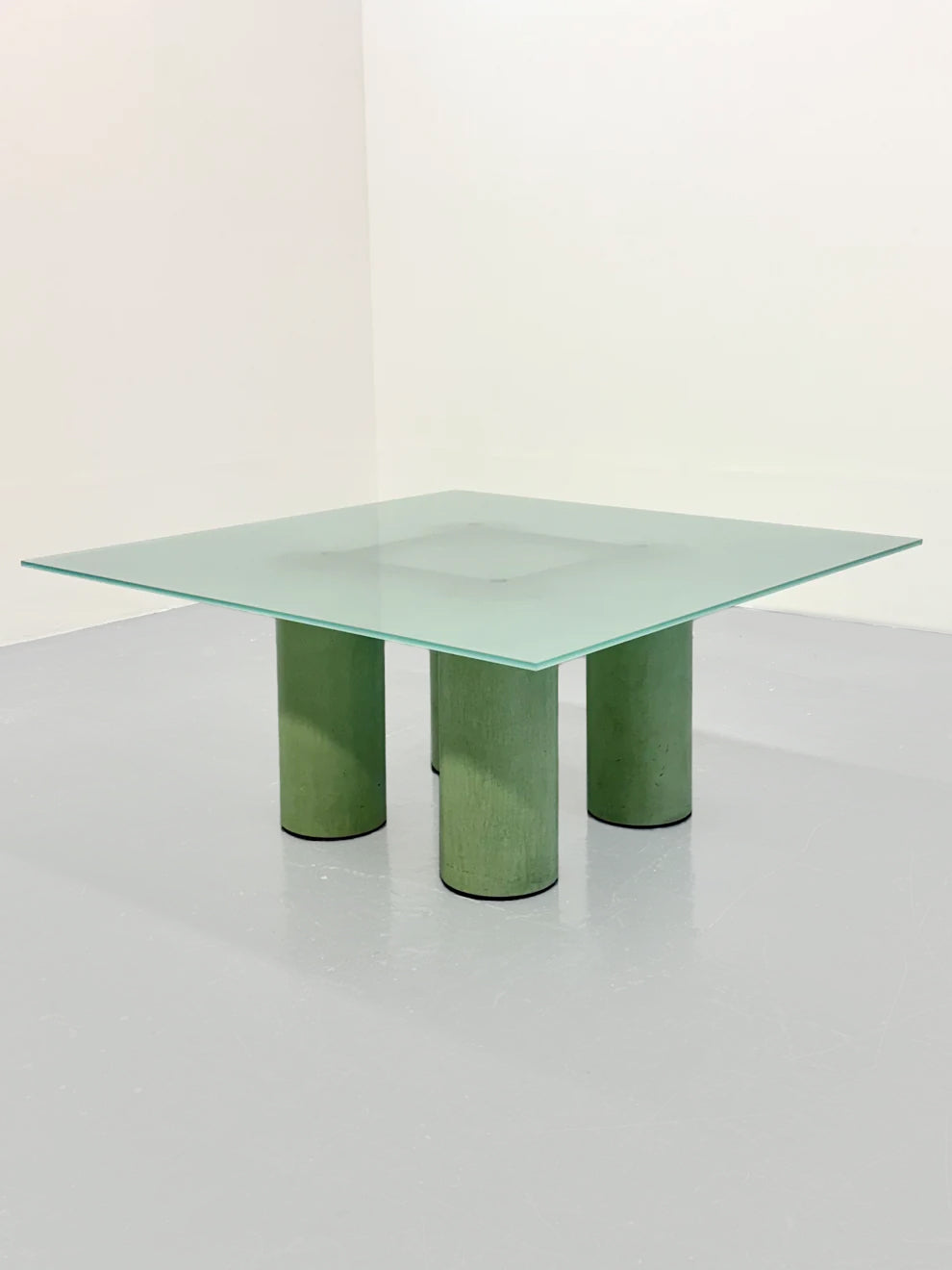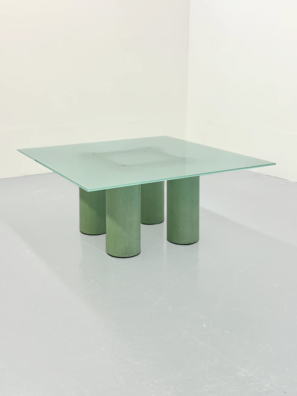 De 'Serenissimo' eettafel, ontworpen door Massimo Vignelli voor Acerbis in de jaren 70-80, is een stijlvol ontwerp dat opvalt door zijn vierkante tafelblad in een opvallende turquoise kleur, wat zorgt voor een levendige en moderne uitstraling. De cilindervormige poten in dezelfde kleur geven de tafel een strakke en eigentijdse look. Het minimalistische ontwerp en de robuuste uitstraling maken deze tafel een prachtige aanvulling op zowel moderne als retro interieurs.