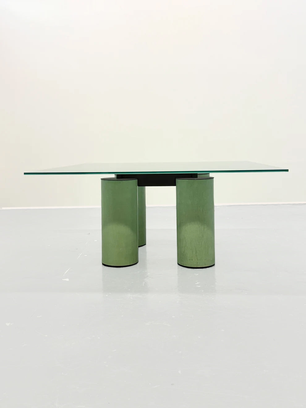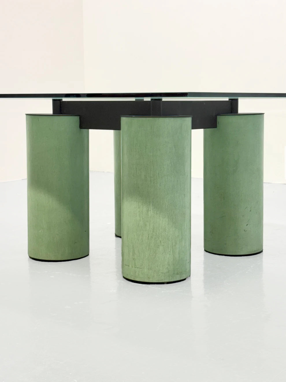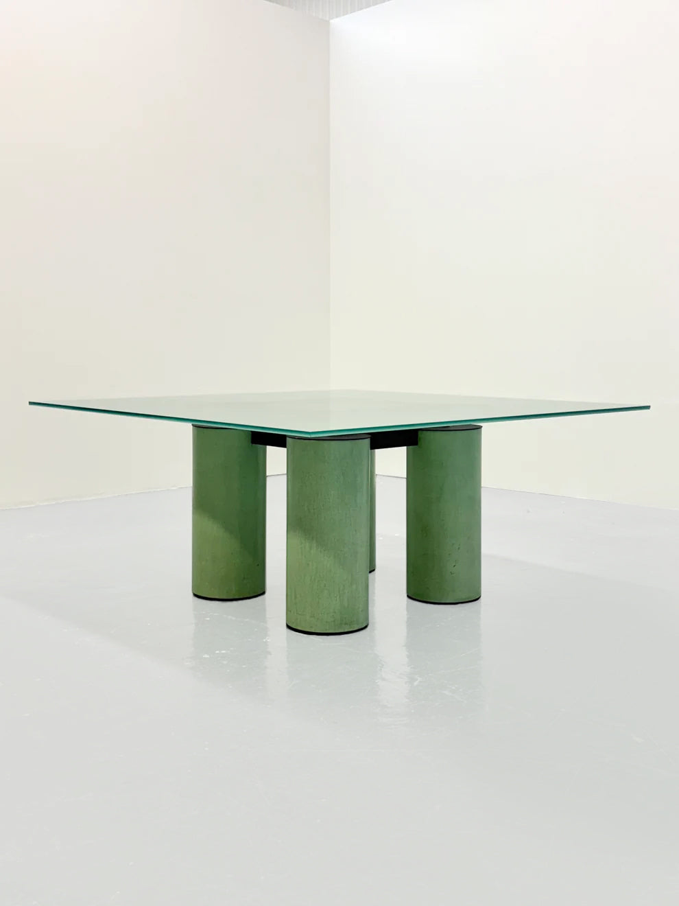 De 'Serenissimo' eettafel, ontworpen door Massimo Vignelli voor Acerbis in de jaren 70-80, is een stijlvol ontwerp dat opvalt door zijn vierkante tafelblad in een opvallende turquoise kleur, wat zorgt voor een levendige en moderne uitstraling. De cilindervormige poten in dezelfde kleur geven de tafel een strakke en eigentijdse look. Het minimalistische ontwerp en de robuuste uitstraling maken deze tafel een prachtige aanvulling op zowel moderne als retro interieurs.