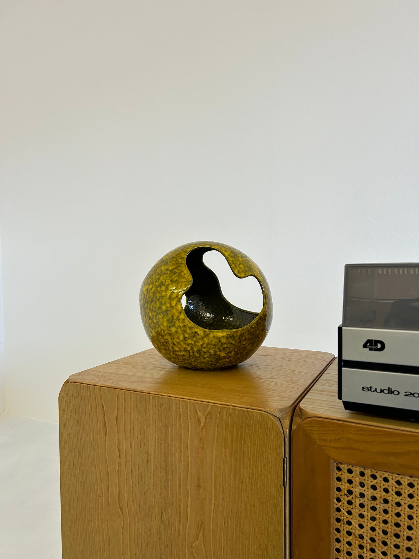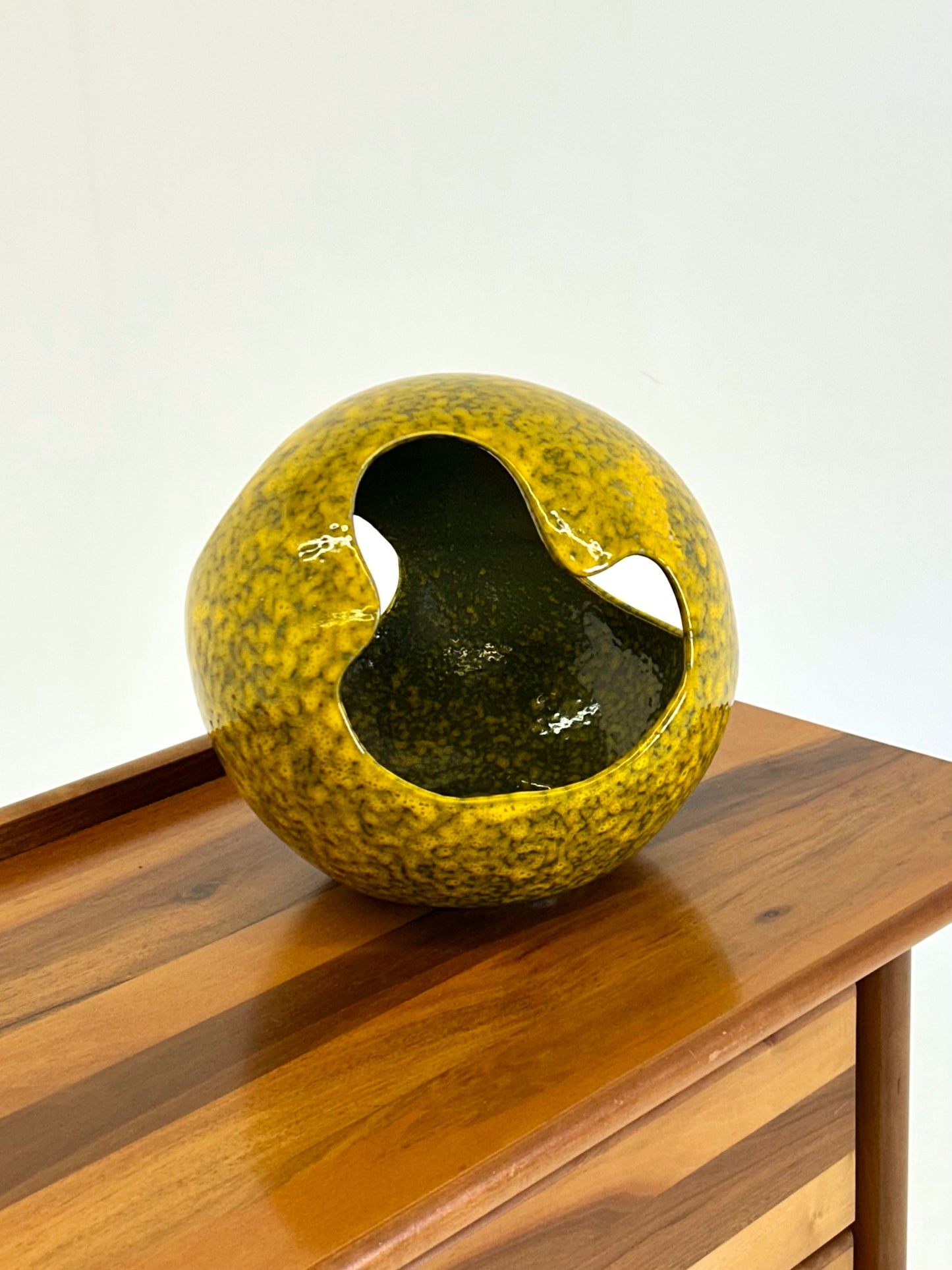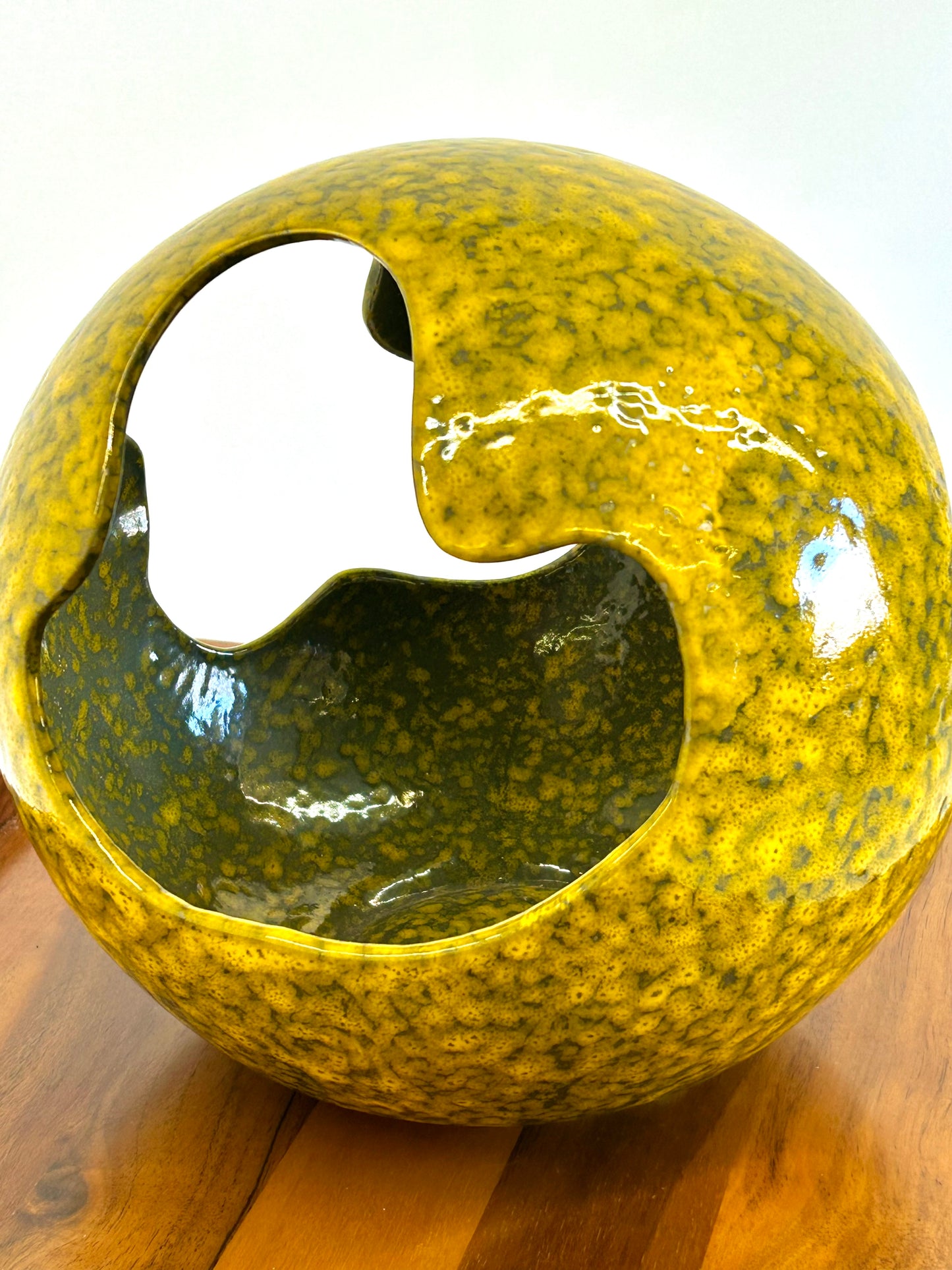 Bijzonder kunstobject van Capodimonte porselein in mosterdgele kleur. Dit Italiaanse object is uitgevoerd in een organische bolvorm met openingen, waardoor je er vanuit verschillende hoeken doorheen kunt kijken.