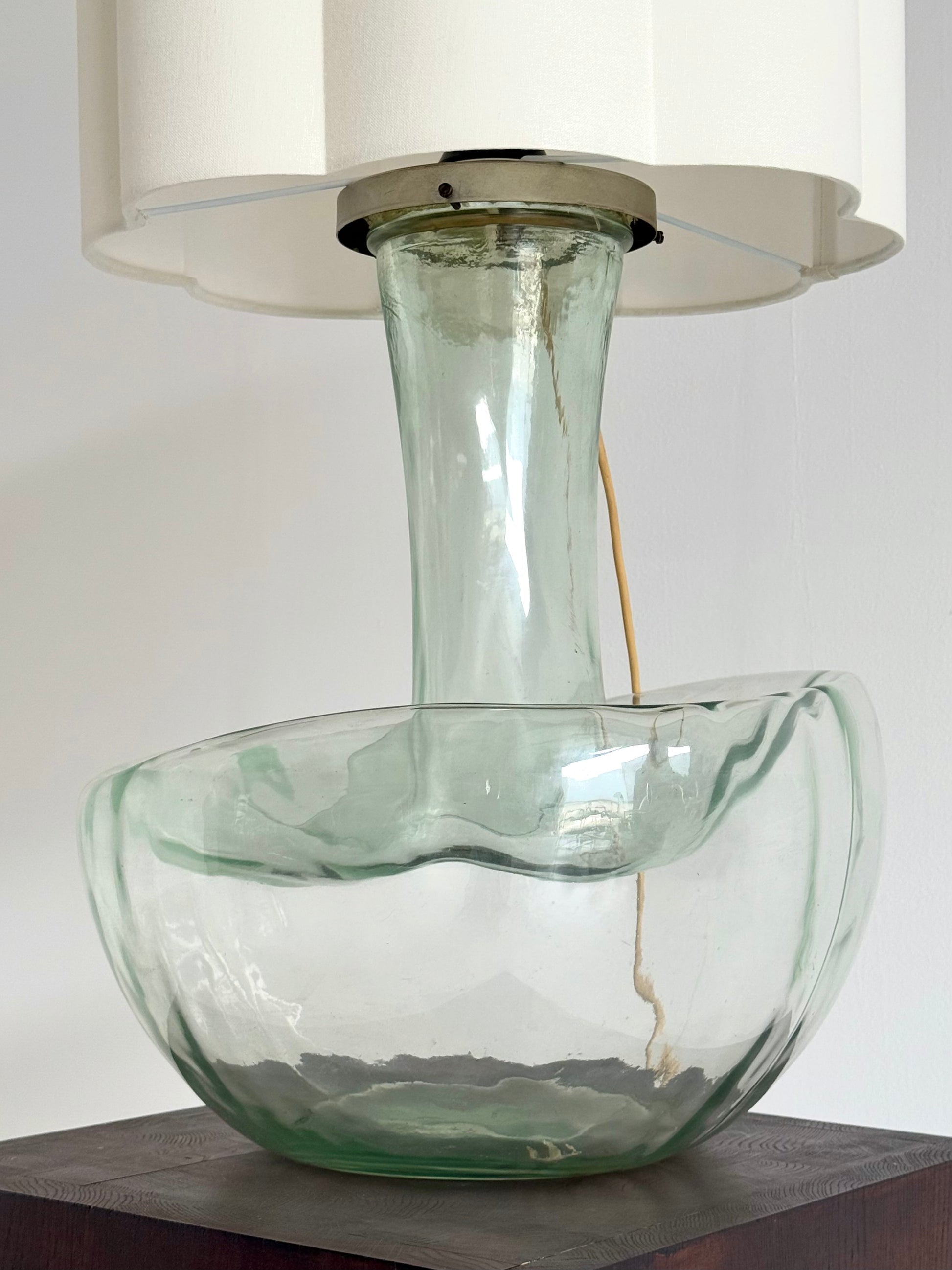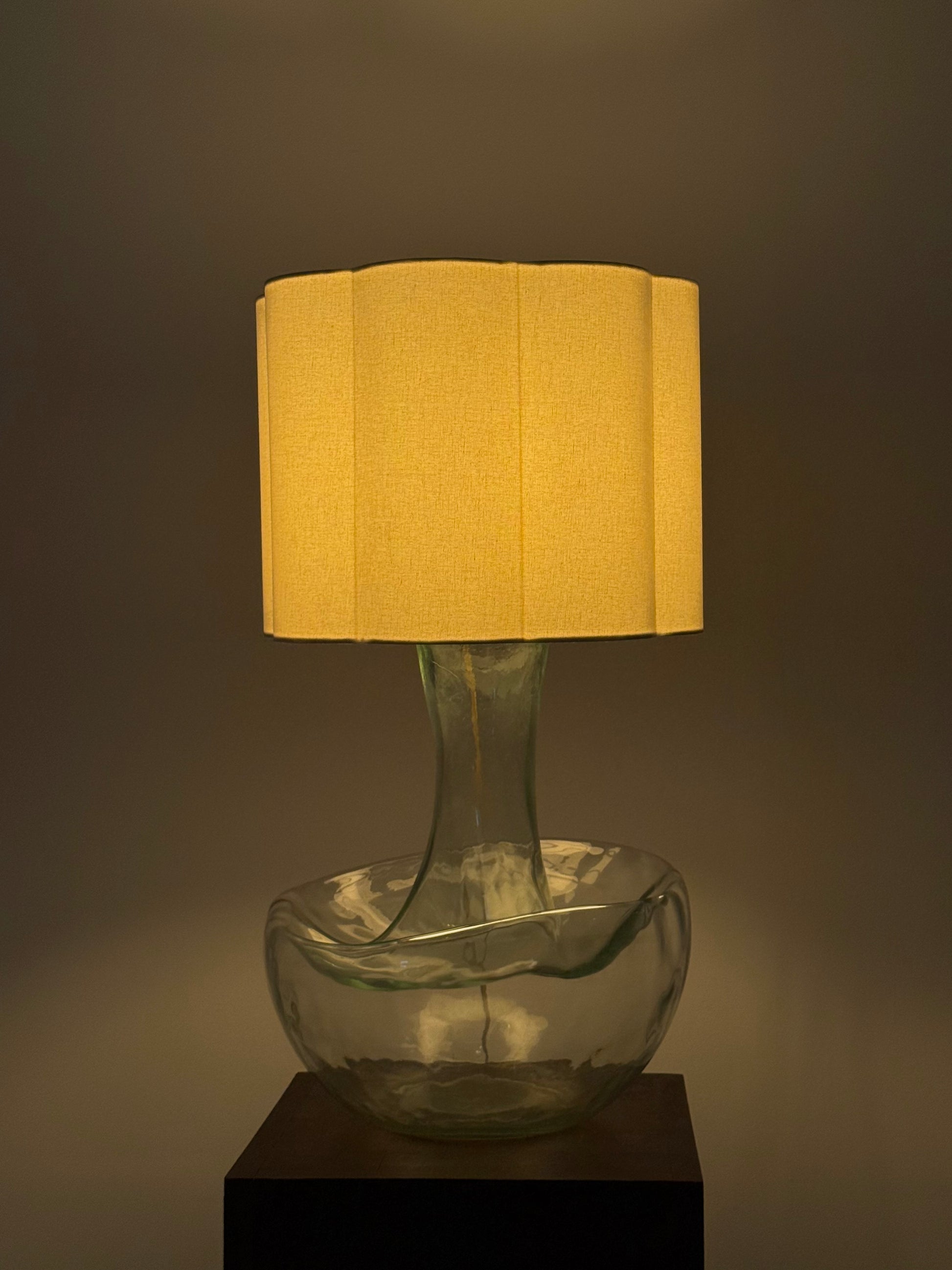 Deze indrukwekkende tafellamp heeft een mondgeblazen glazen voet met een prachtige organische vorm, die een sculpturaal en elegant karakter toevoegt aan het ontwerp. De voet vormt een kunstwerk op zich en vangt het licht op een subtiele manier, waardoor de lamp vanuit elke hoek iets bijzonders uitstraalt. De lamp is voorzien van een nieuwe witte katoenen kap met een golvend design, die het geheel een frisse en tijdloze uitstraling geeft.
