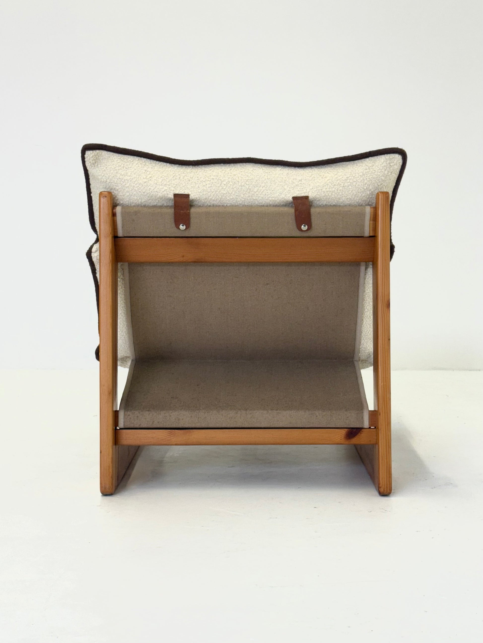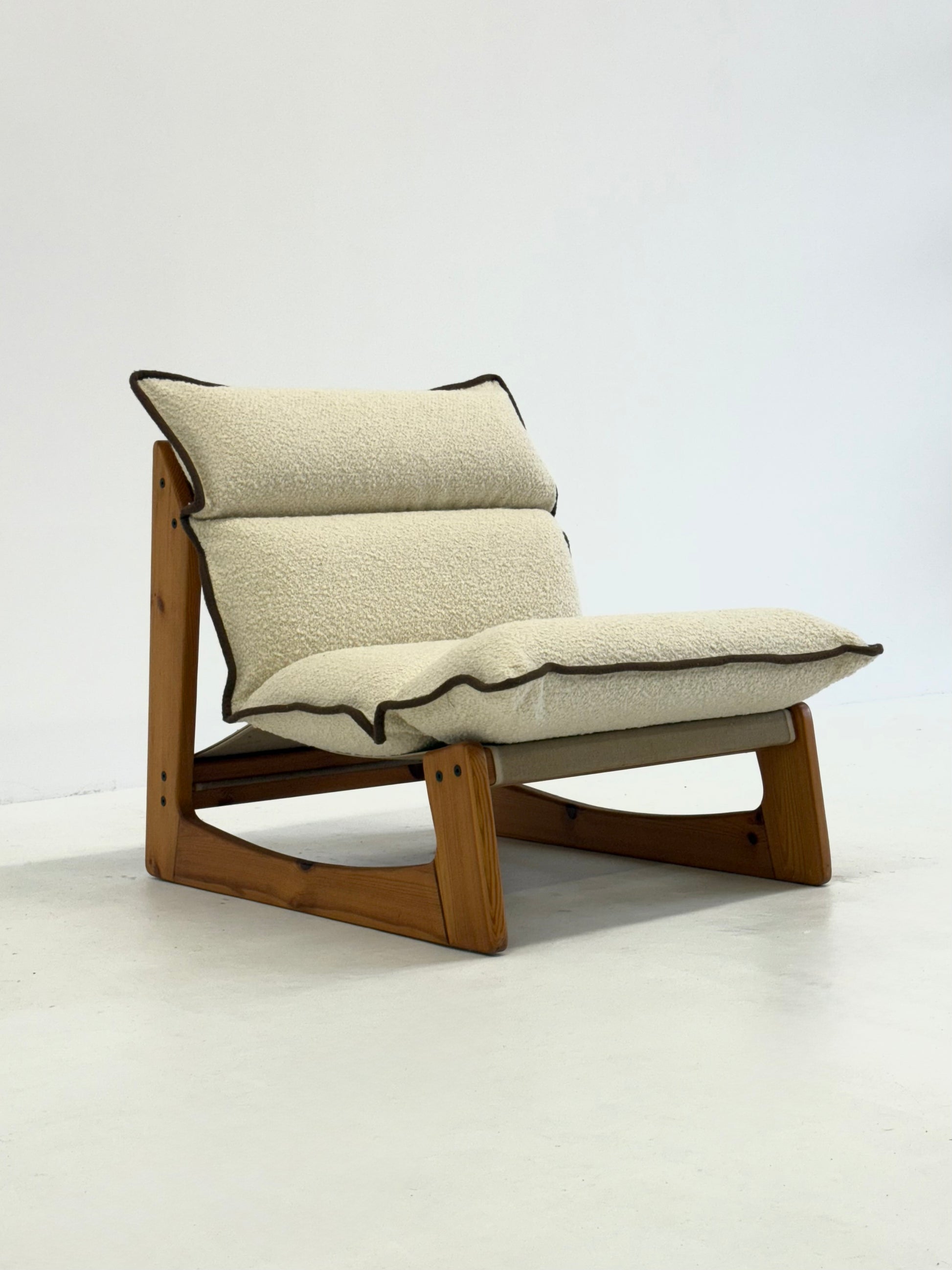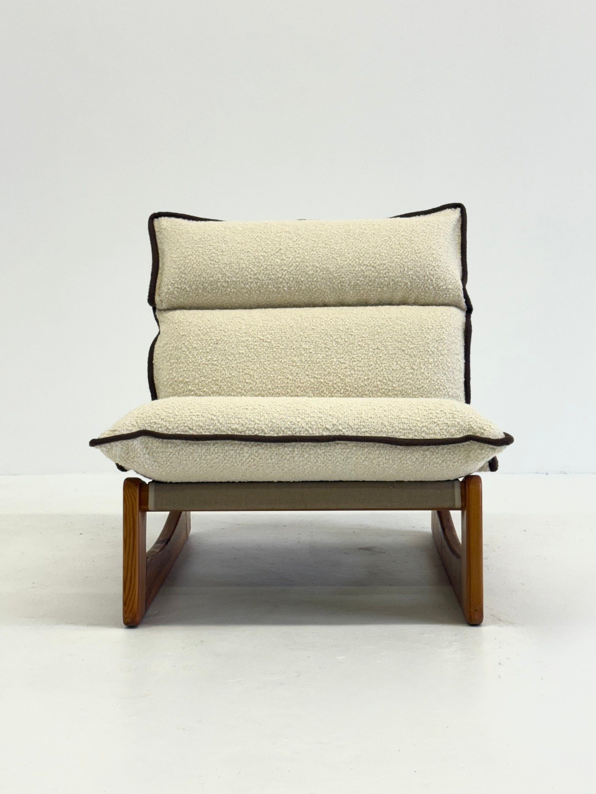 De fauteuil heeft een massief houten frame met vloeiende lijnen en een warme uitstraling. De zitting is bekleed met witte bouclé stof, wat zorgt voor een luxueuze, zachte textuur en een moderne look die perfect past in zowel vintage als eigentijdse interieurs.