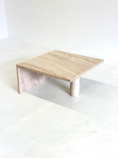 Deze Italiaanse salontafel is vervaardigd uit Palissandro marmer, een luxe marmer met subtiele aderen in warme tinten. Het ontwerp is elegant en innovatief, waarbij het tafelblad aan één kant doorloopt als poot, terwijl de andere kant wordt ondersteund door een cilindervormige poot. Dit asymmetrische ontwerp geeft de tafel een moderne uitstraling met een artistieke flair, terwijl het marmeren blad de luxe en tijdloze schoonheid van het materiaal benadrukt. Deze salontafel is een perfect statement piece voor een eigentijds interieur.