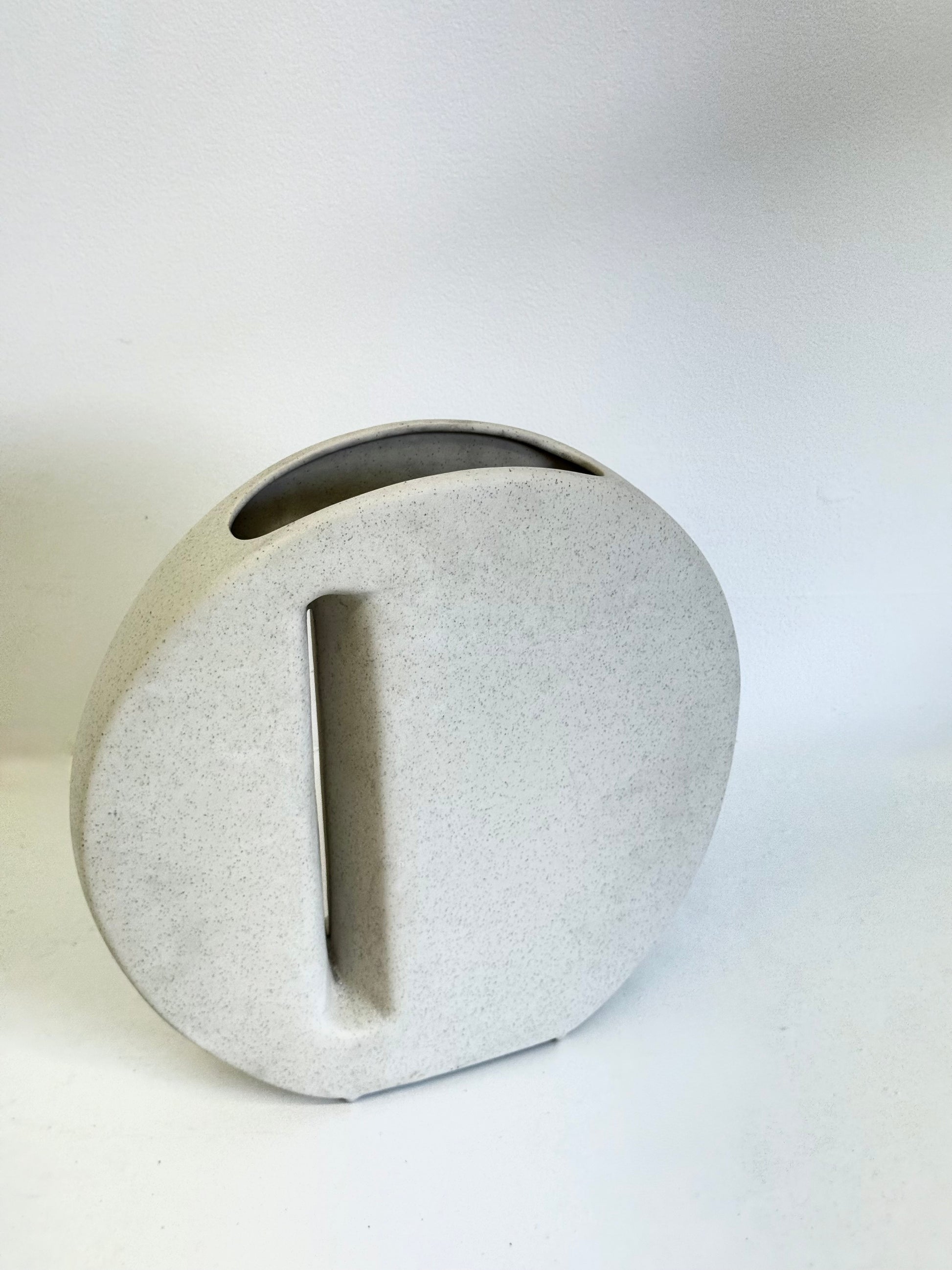 Deze gebroken witte keramische vaas van Nereo Boaretto uit 1972 onderscheidt zich door zijn lenticulaire vorm met smalle opening en een diepe concave inkeping. Het design straalt ambachtelijke finesse uit en toont Boaretto’s kenmerkende fusie van instinctieve, folkloristische vormen en moderne elegantie. Perfect als sculpturaal statement in elk interieur.