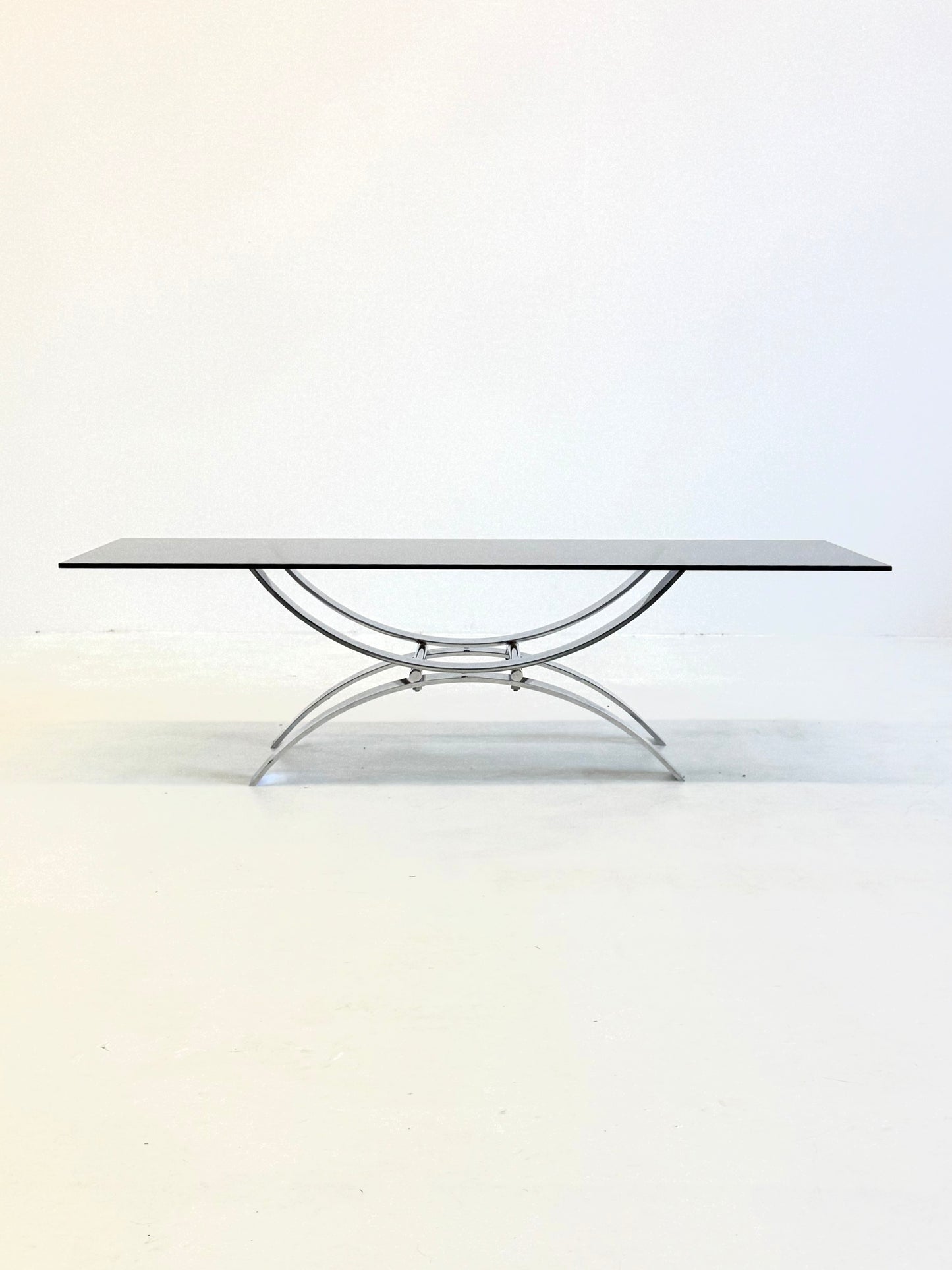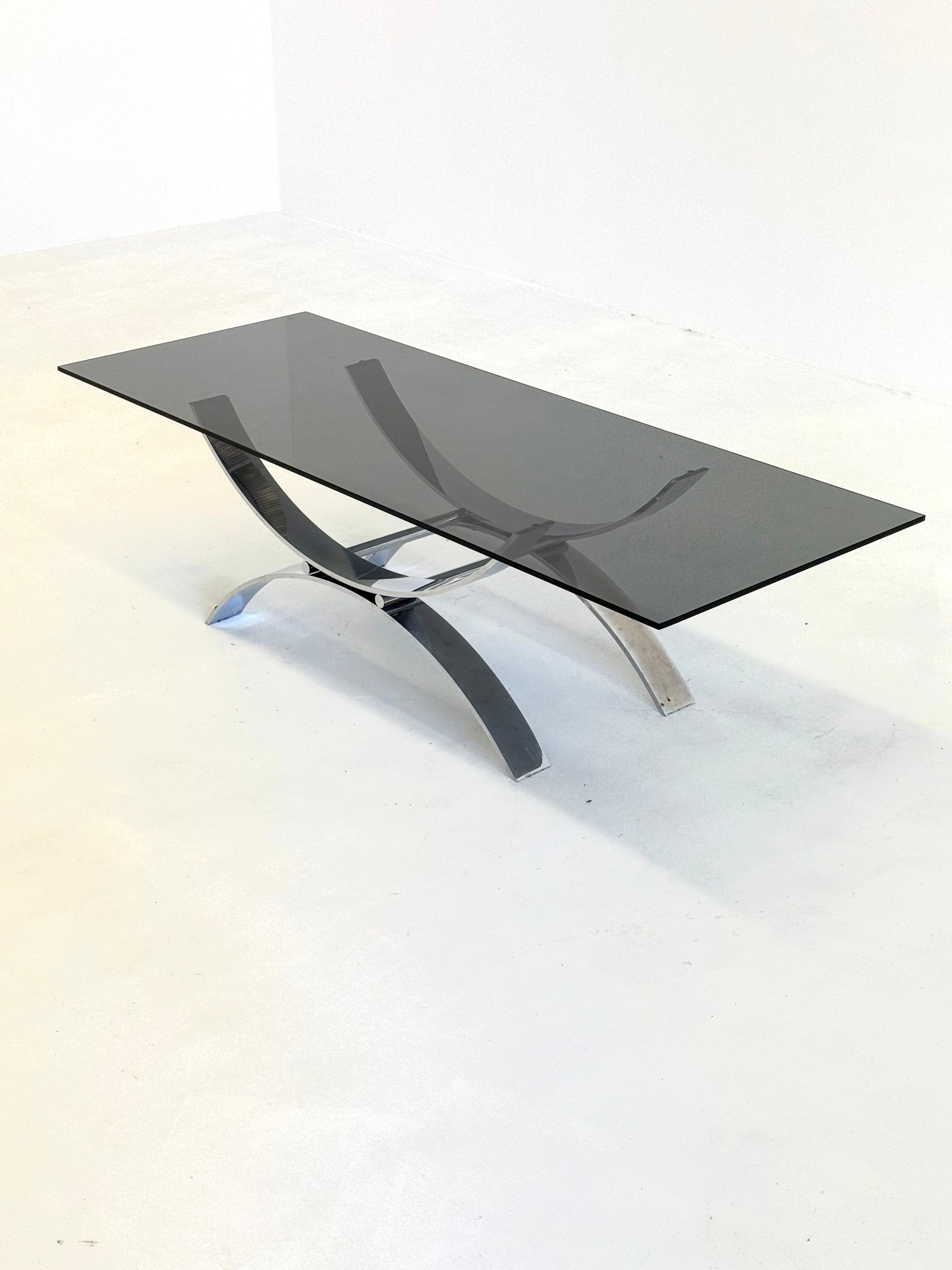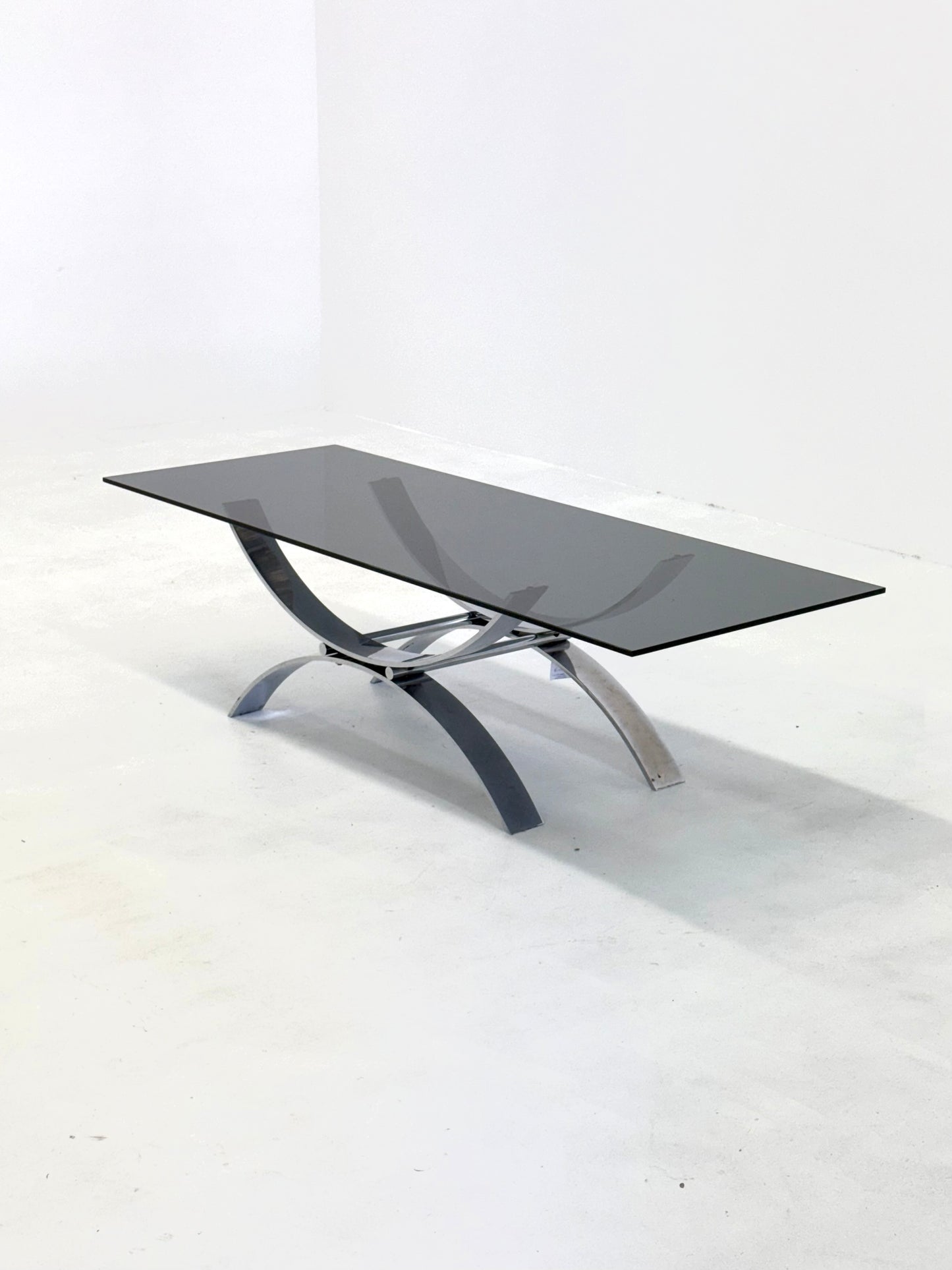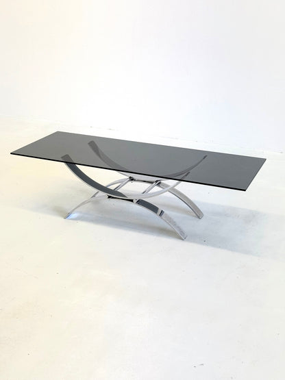 Langwerpige glazen salontafel met sierlijk chroom onderstel