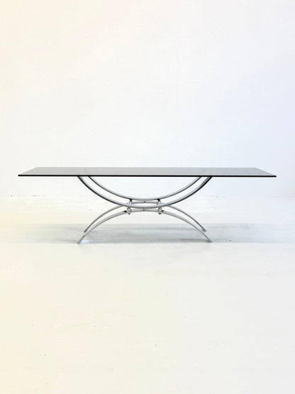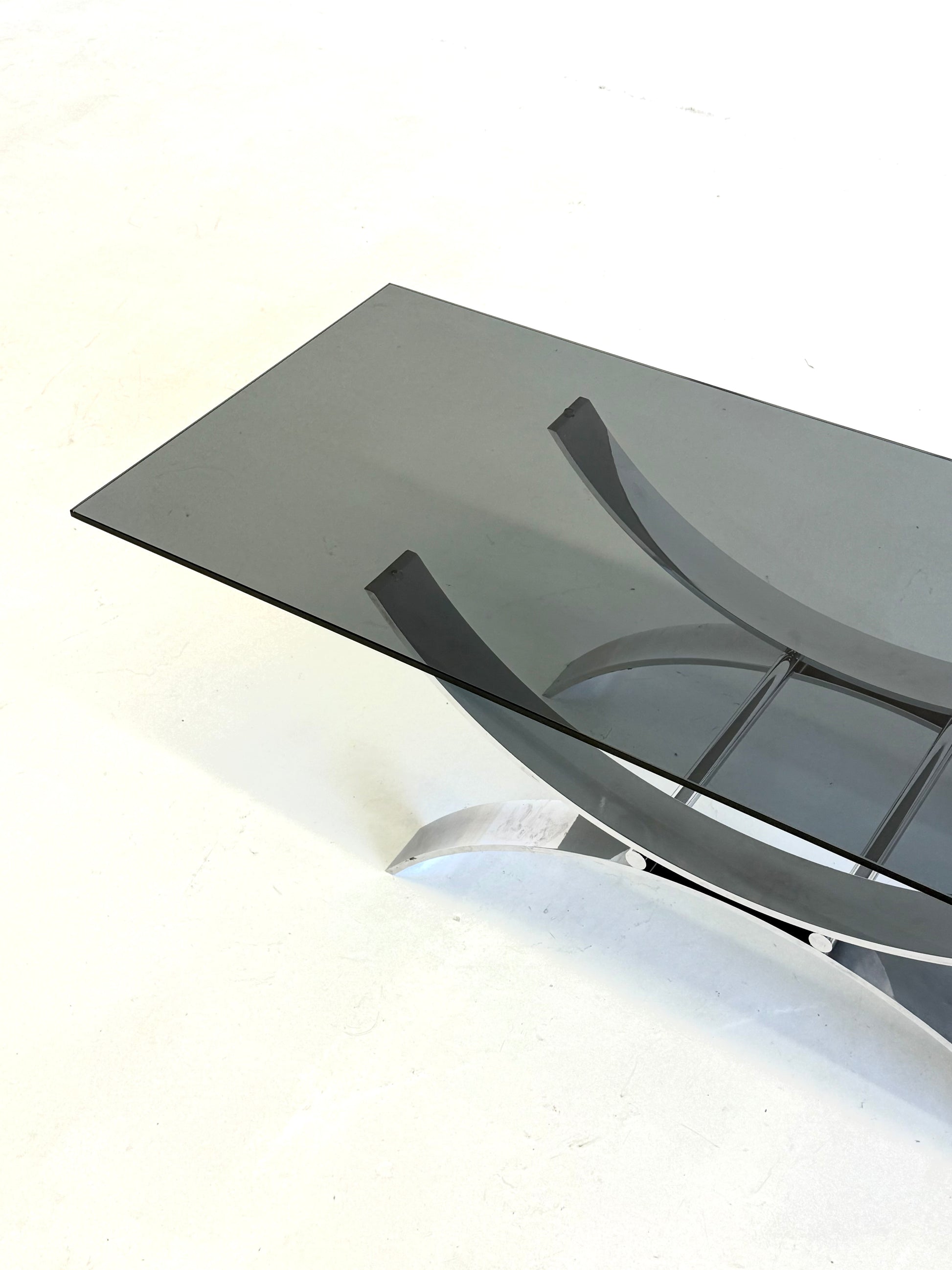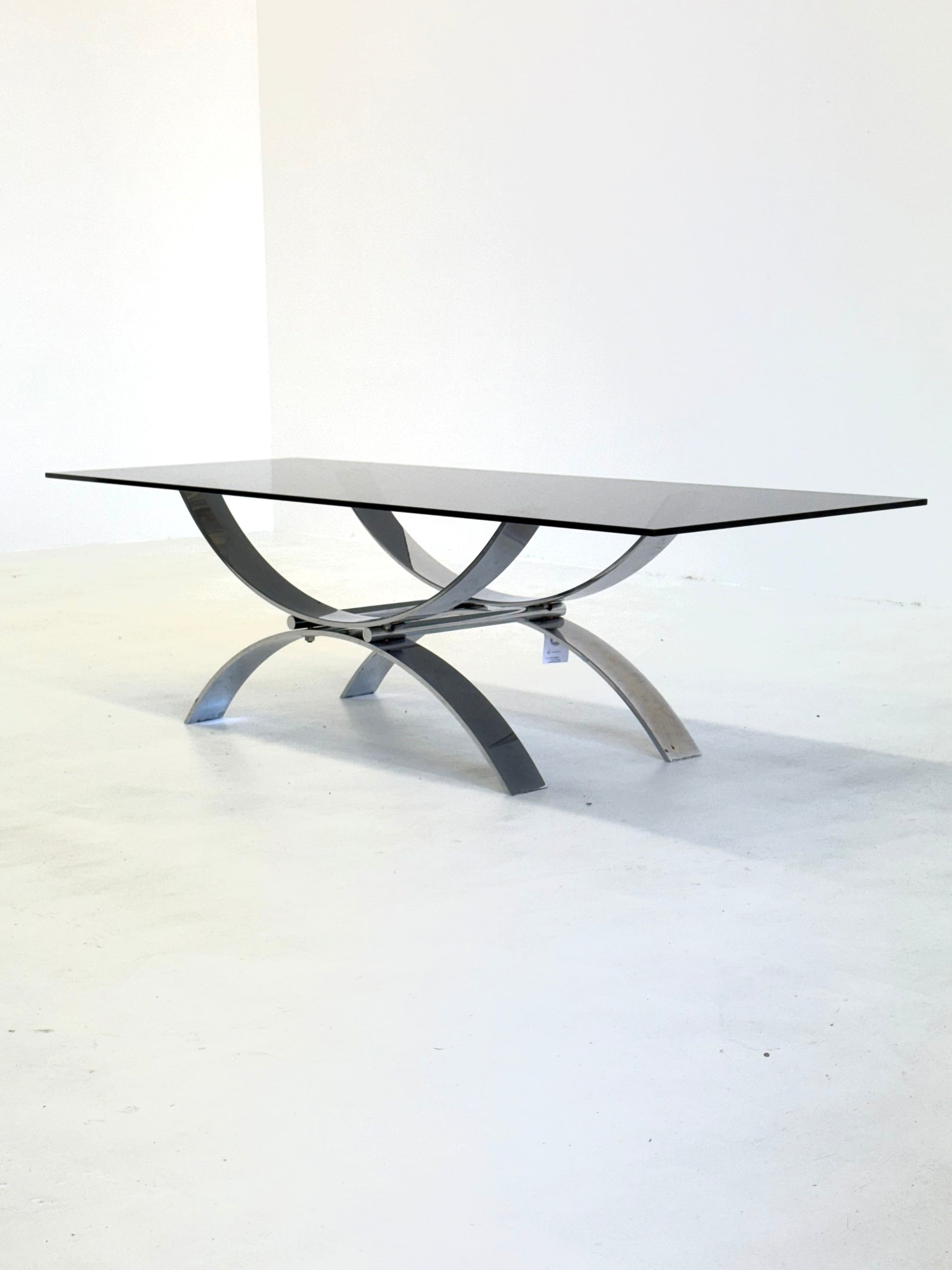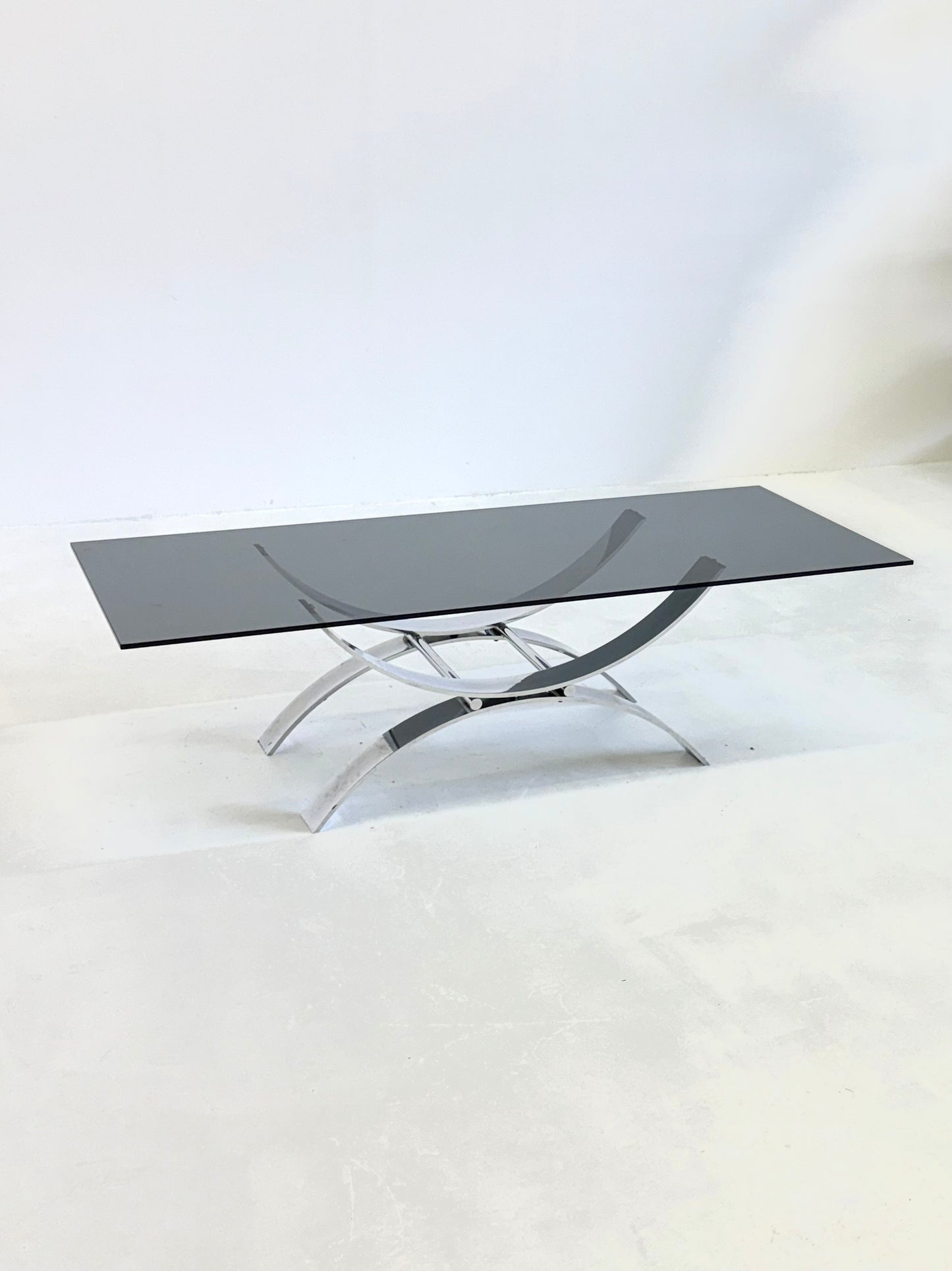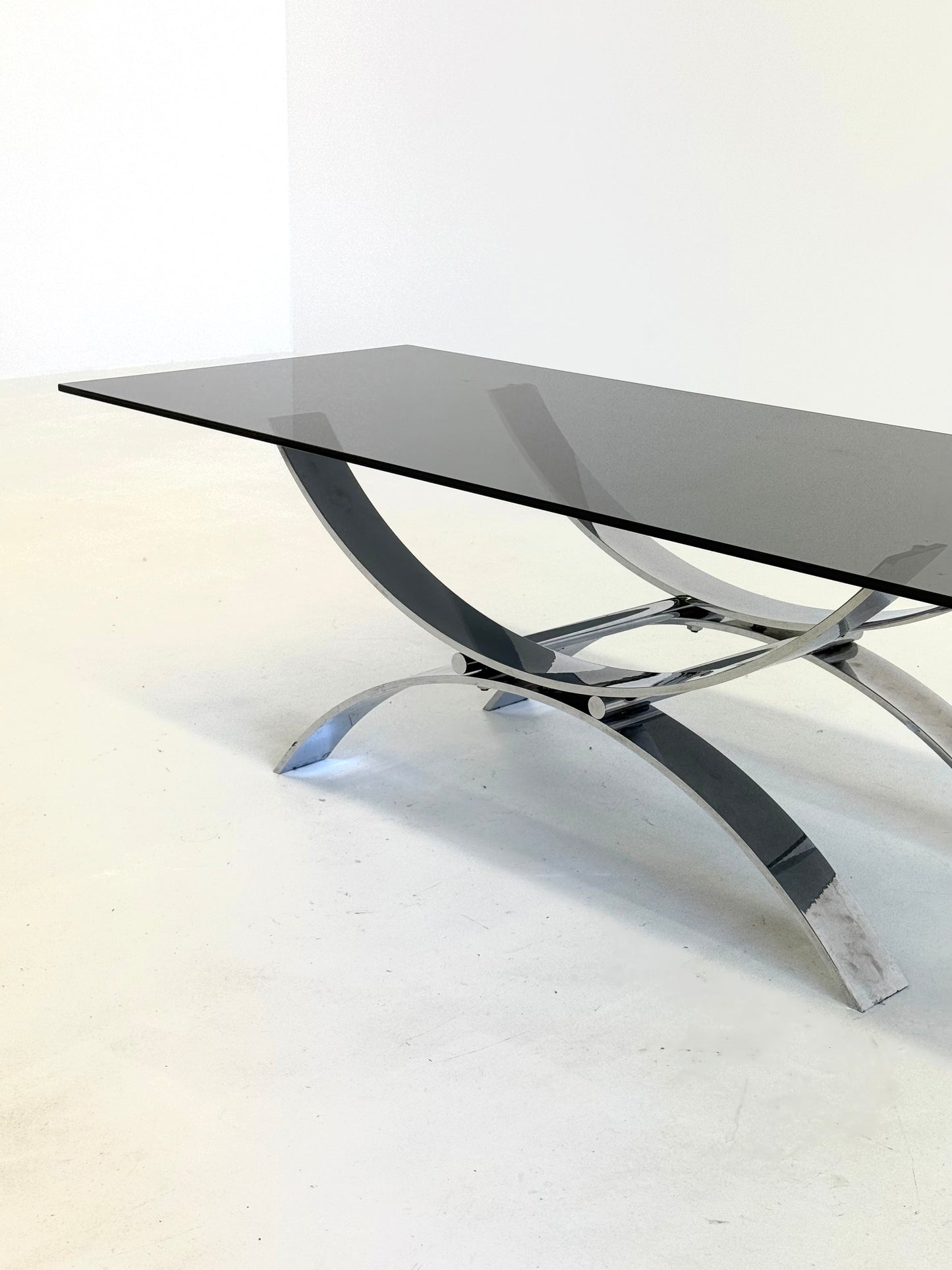 Langwerpige glazen salontafel met sierlijk chroom onderstel