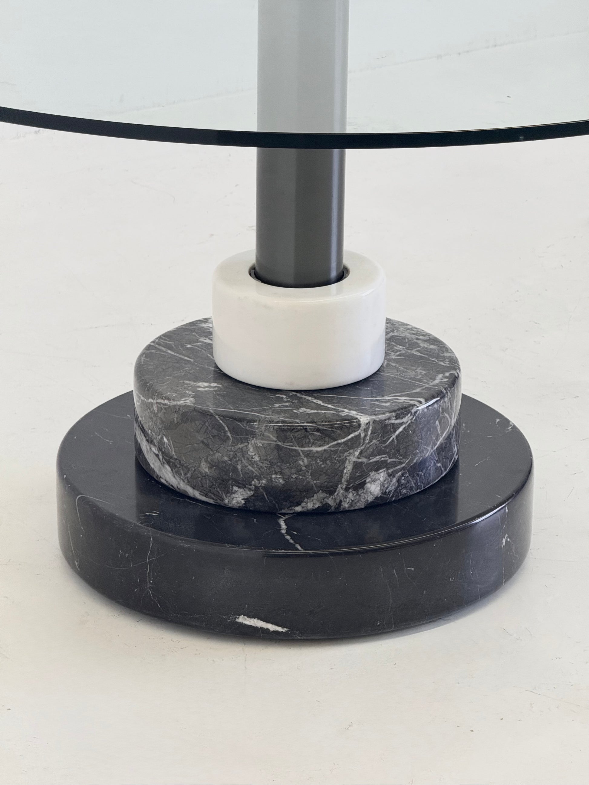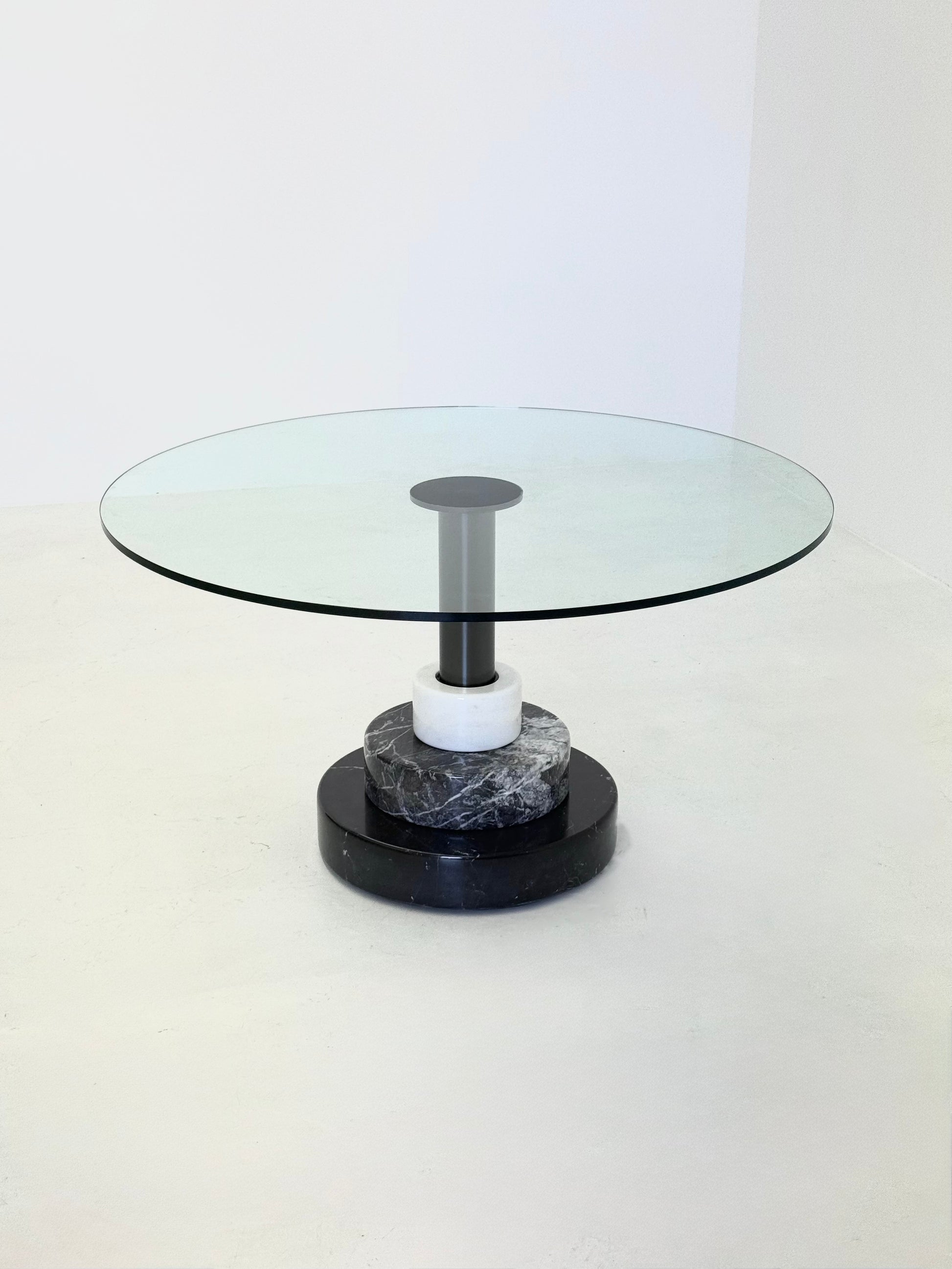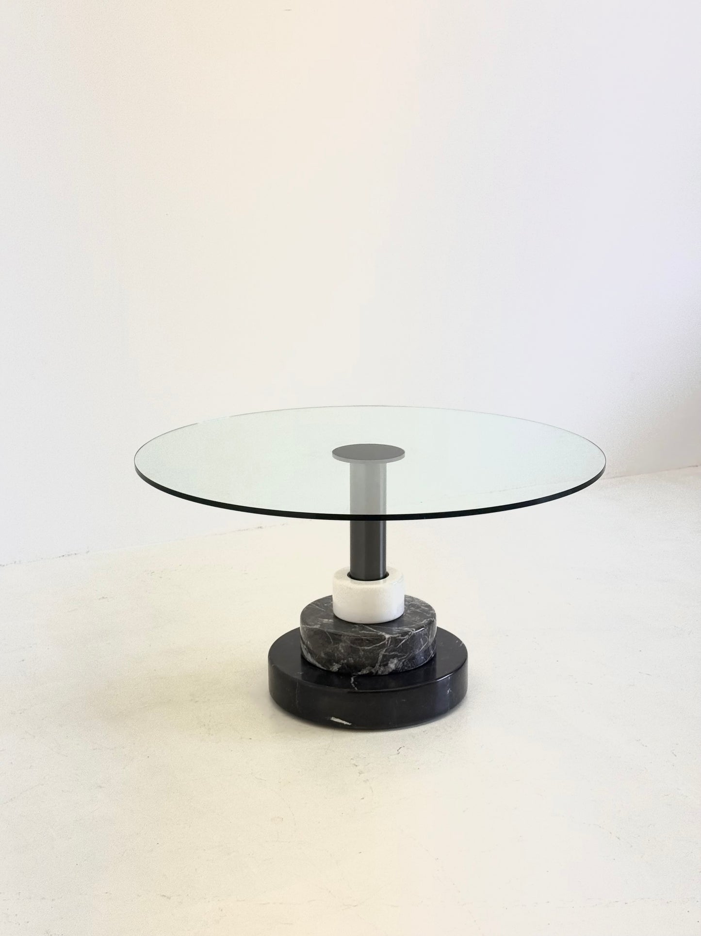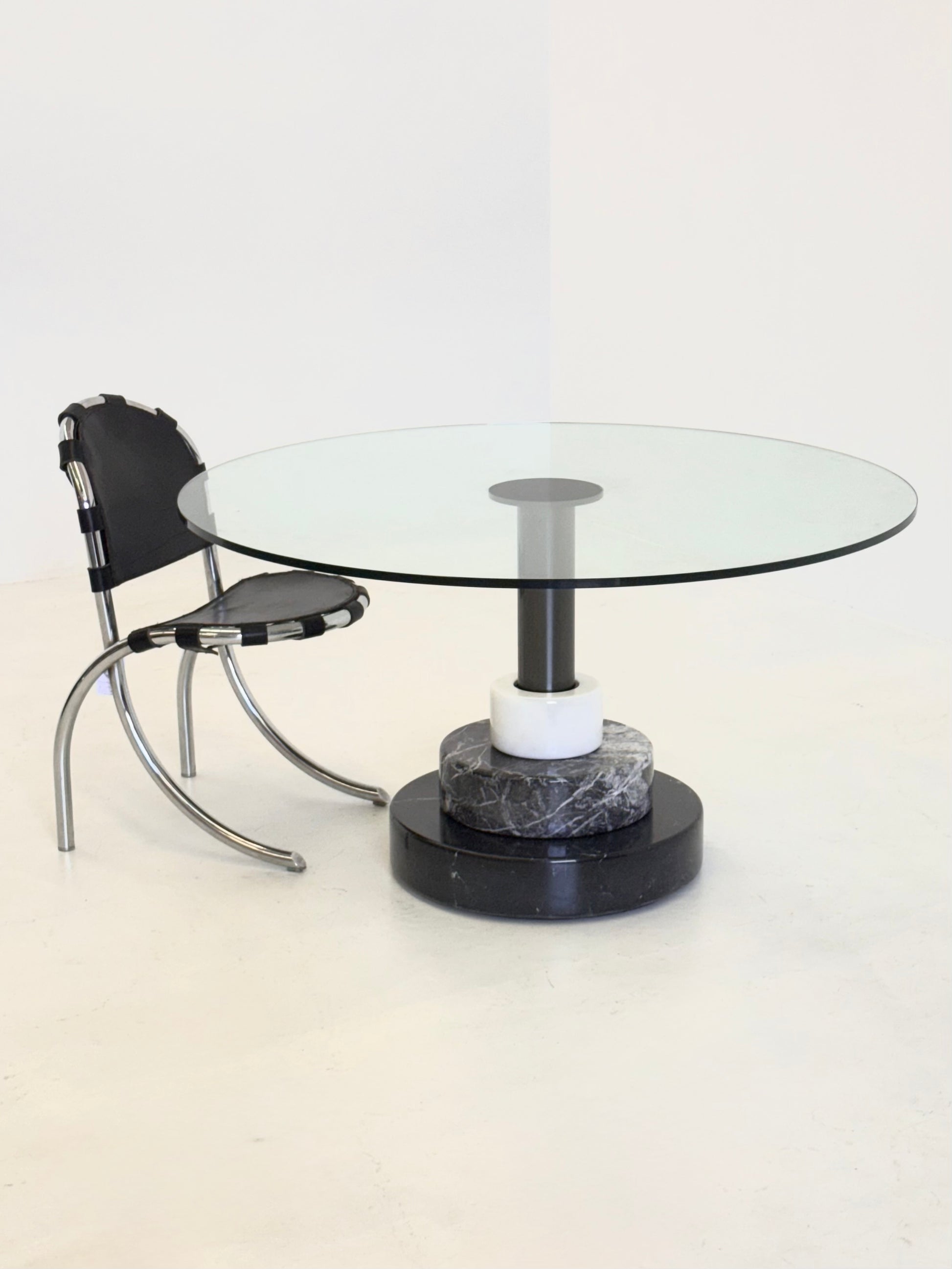 Deze tafel is een opvallend Italiaans designstuk en een mooi voorbeeld van postmodern vormgegeven meubelkunst. De sculpturale uitstraling en materiaalcombinatie doen denken aan de stijl van de Memphis Group, maar ook aan het strakkere mid-century modernisme.