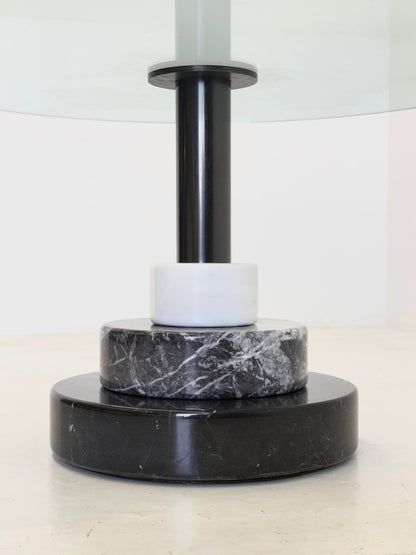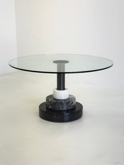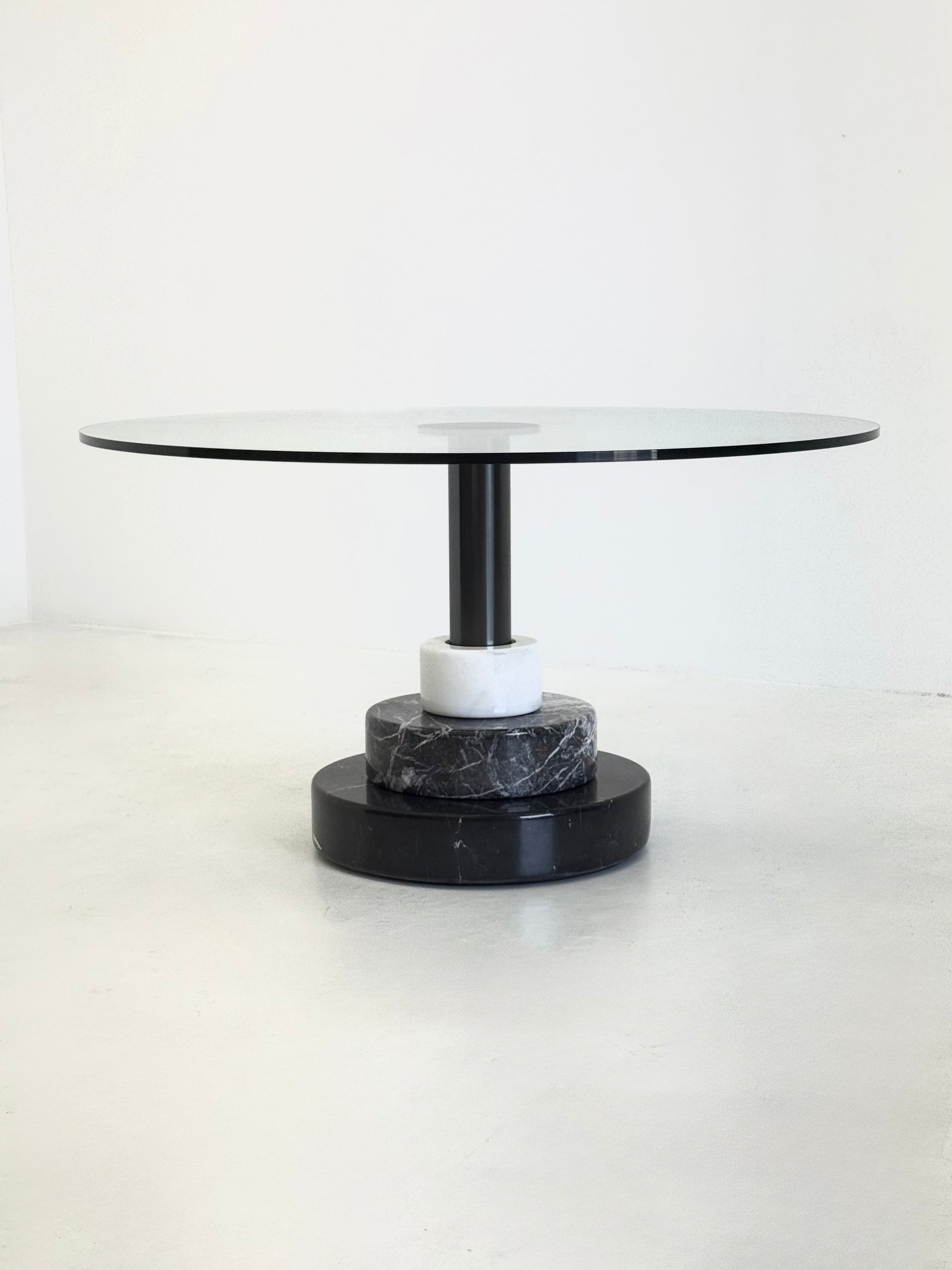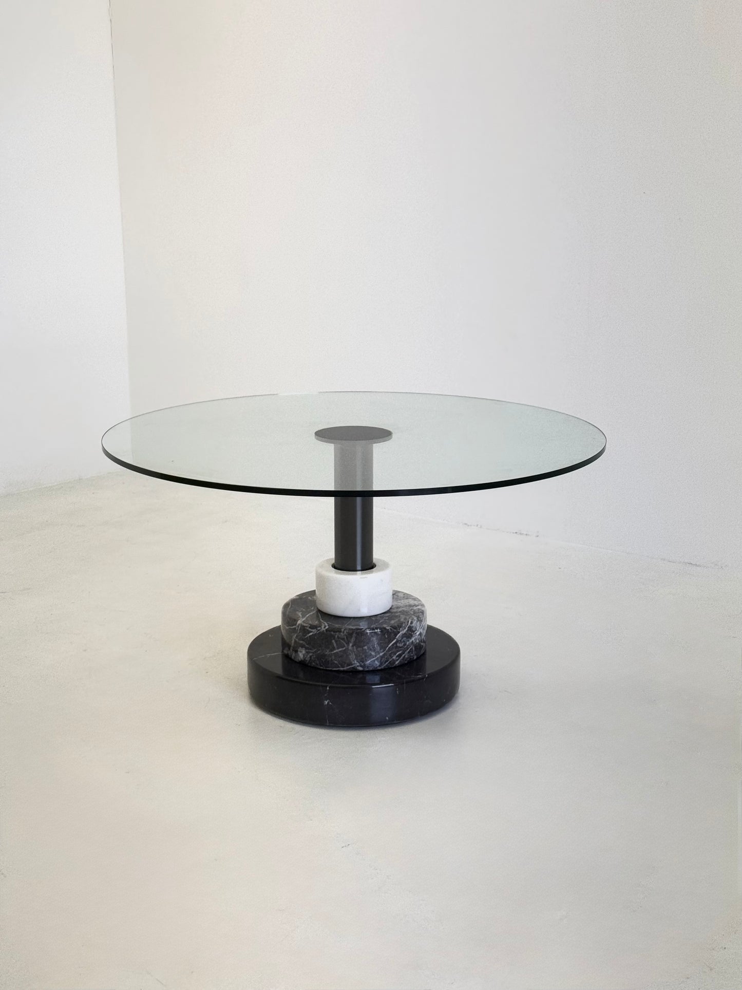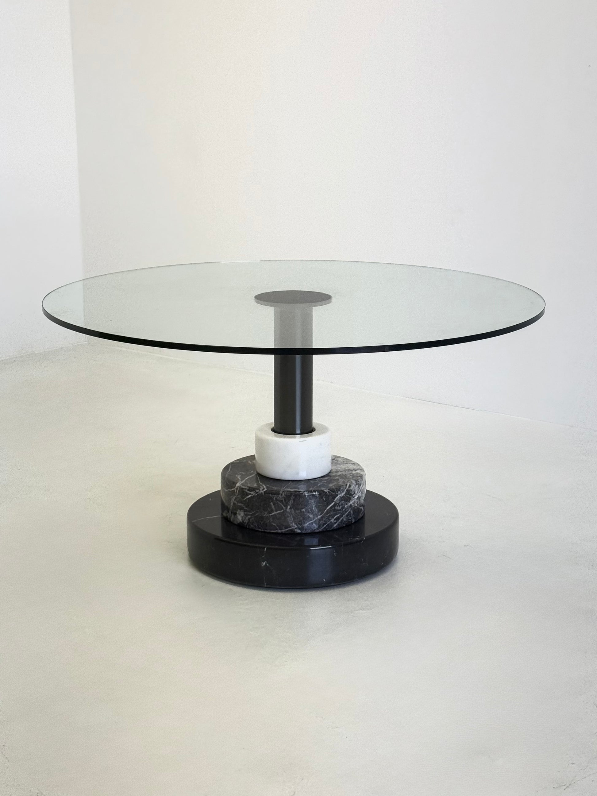 De iconische Menhir eettafel werd in de jaren 80 ontworpen door Lodovico Acerbis en Giotto Stoppino voor Acerbis. Het onderstel bestaat uit drie cilindervormige marmeren schijven, die trapsgewijs op elkaar zijn gestapeld van klein naar groot: van onder naar boven in zwart Marquinia, grijs marmer en wit Carrara. De drie schijven worden verbonden door een gepolijste metalen buis die het glazen blad ondersteunt.