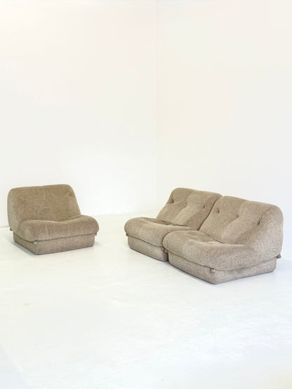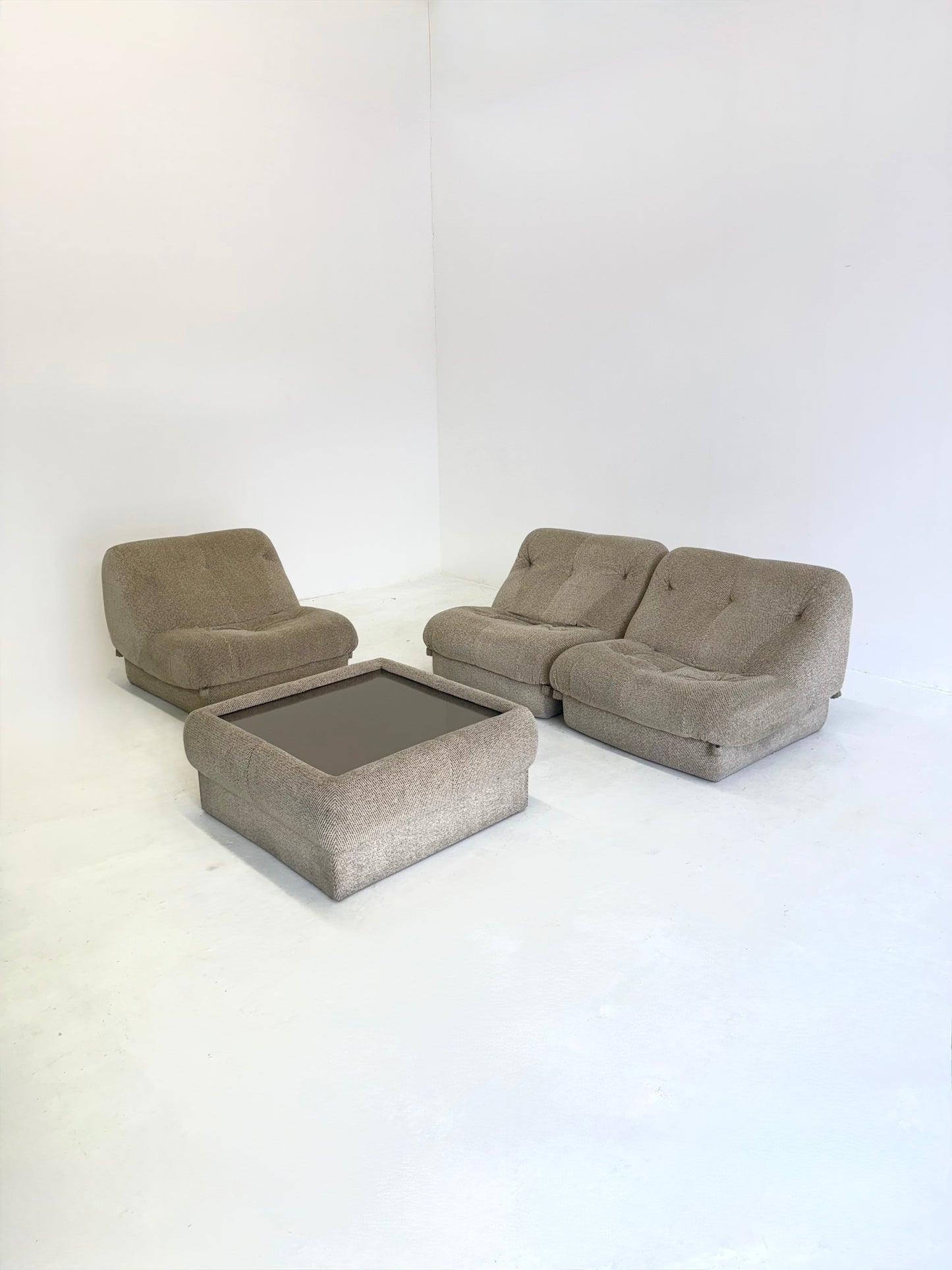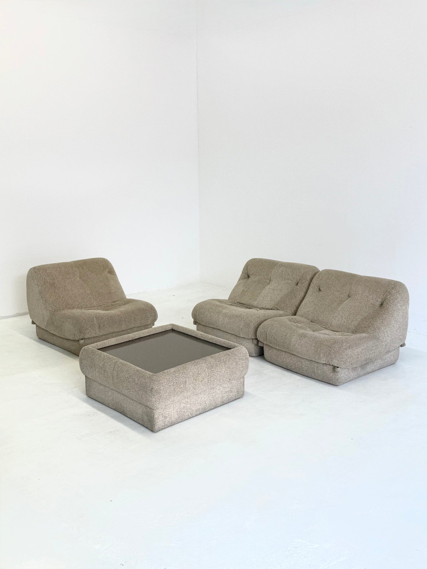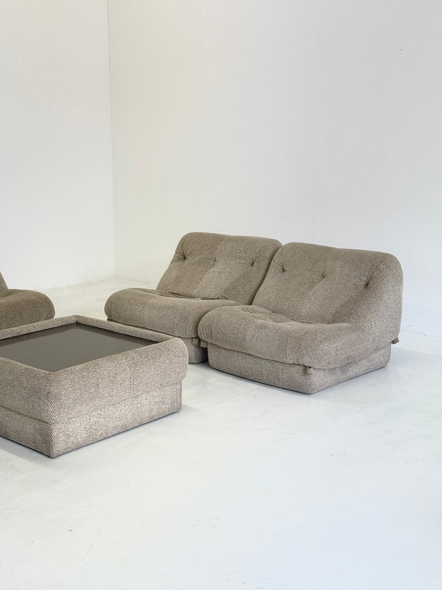 De set bestaat uit drie zitmodules en een bijpassende salontafel met een spiegelblad. De bank is opnieuw gestoffeerd in een beige stof en heeft een polyurethaanschuim vulling voor optimaal comfort.