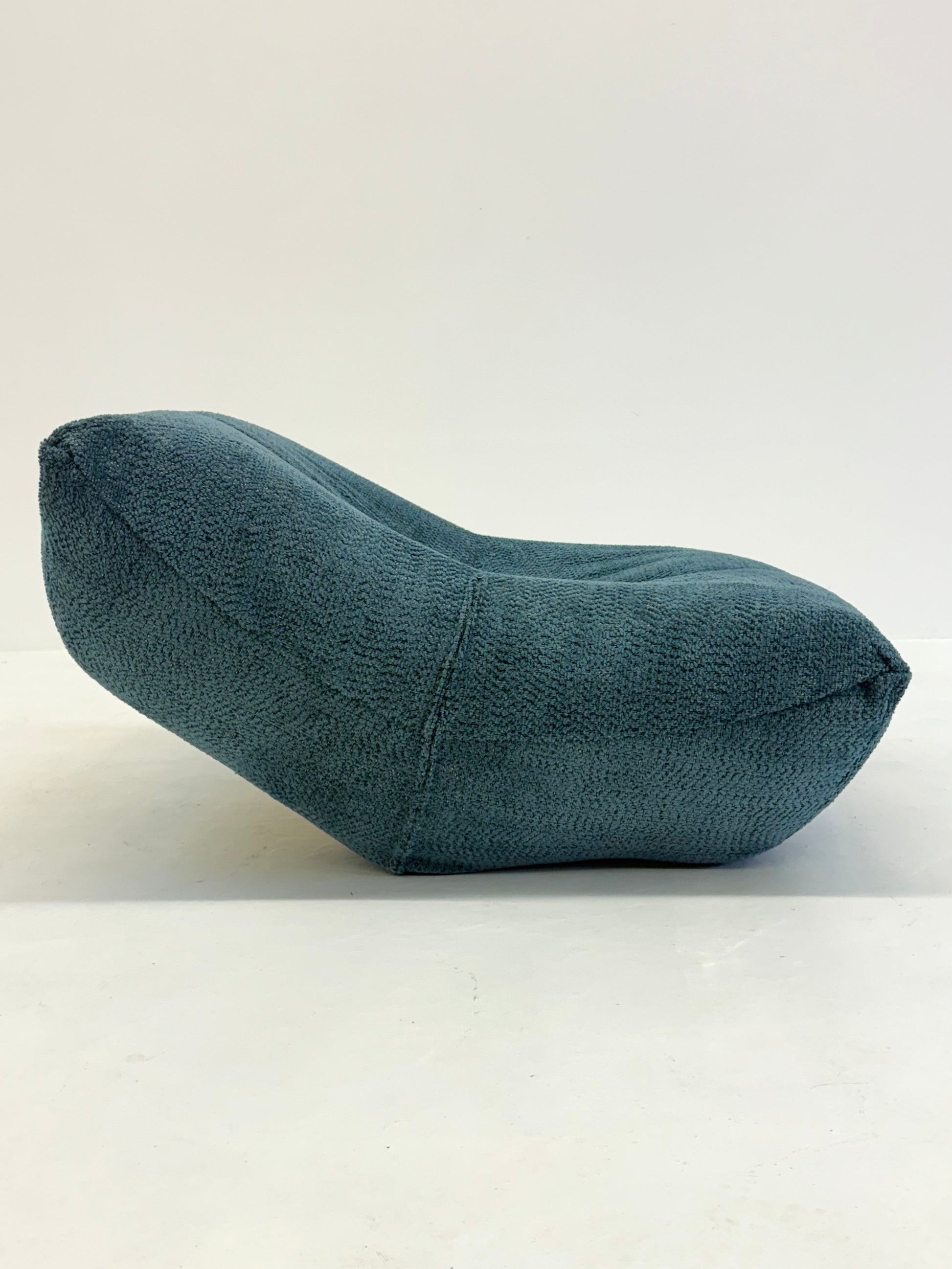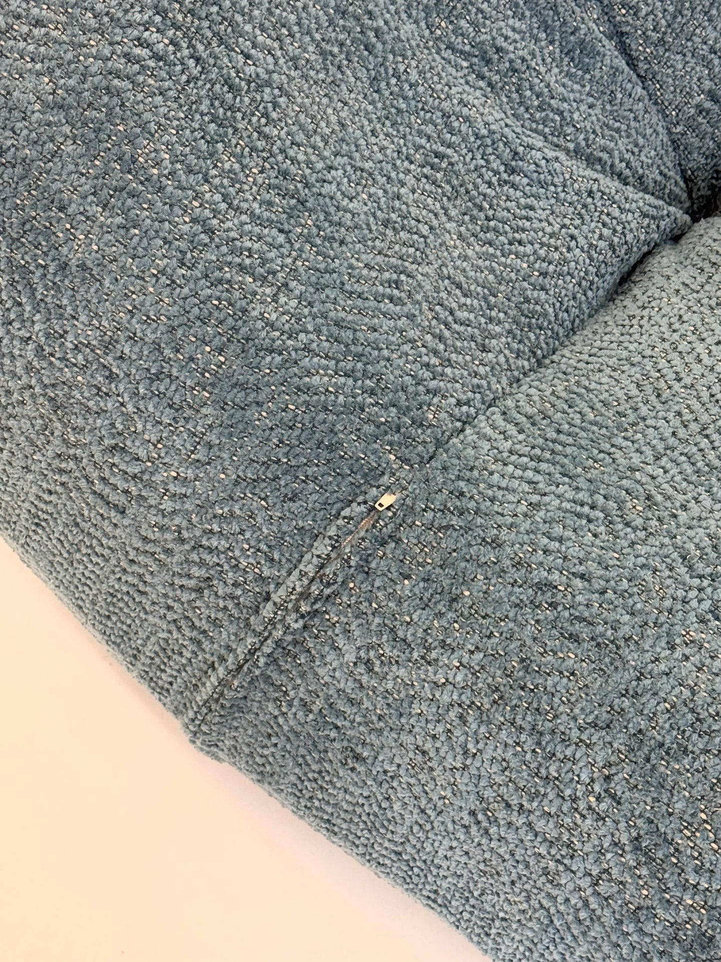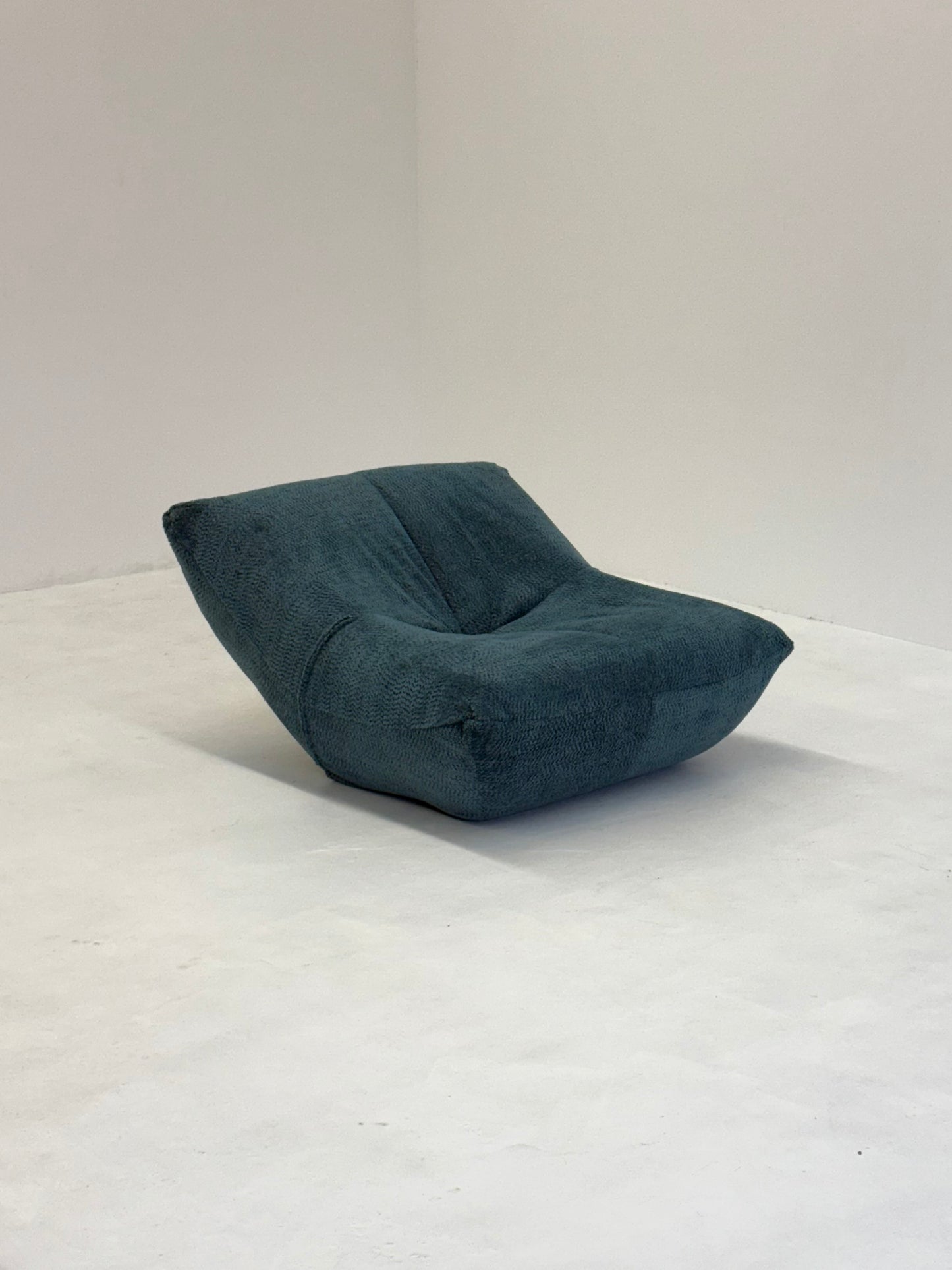 De stoelen zijn bekleed in blauw stof – opnieuw gestoffeerd door de vorige eigenaar – en verkeren in zeer goede staat. Zowel de zitting als de rugleuning hebben dezelfde afmetingen en kunnen verwisseld worden, wat het ontwerp extra praktisch en flexibel maakt.