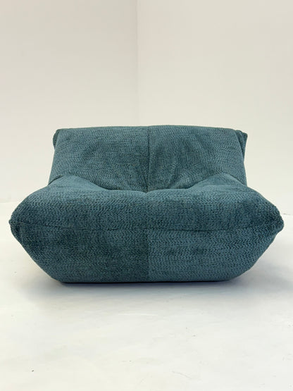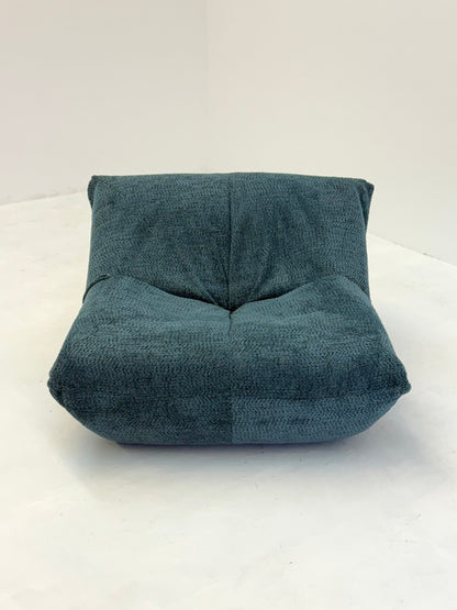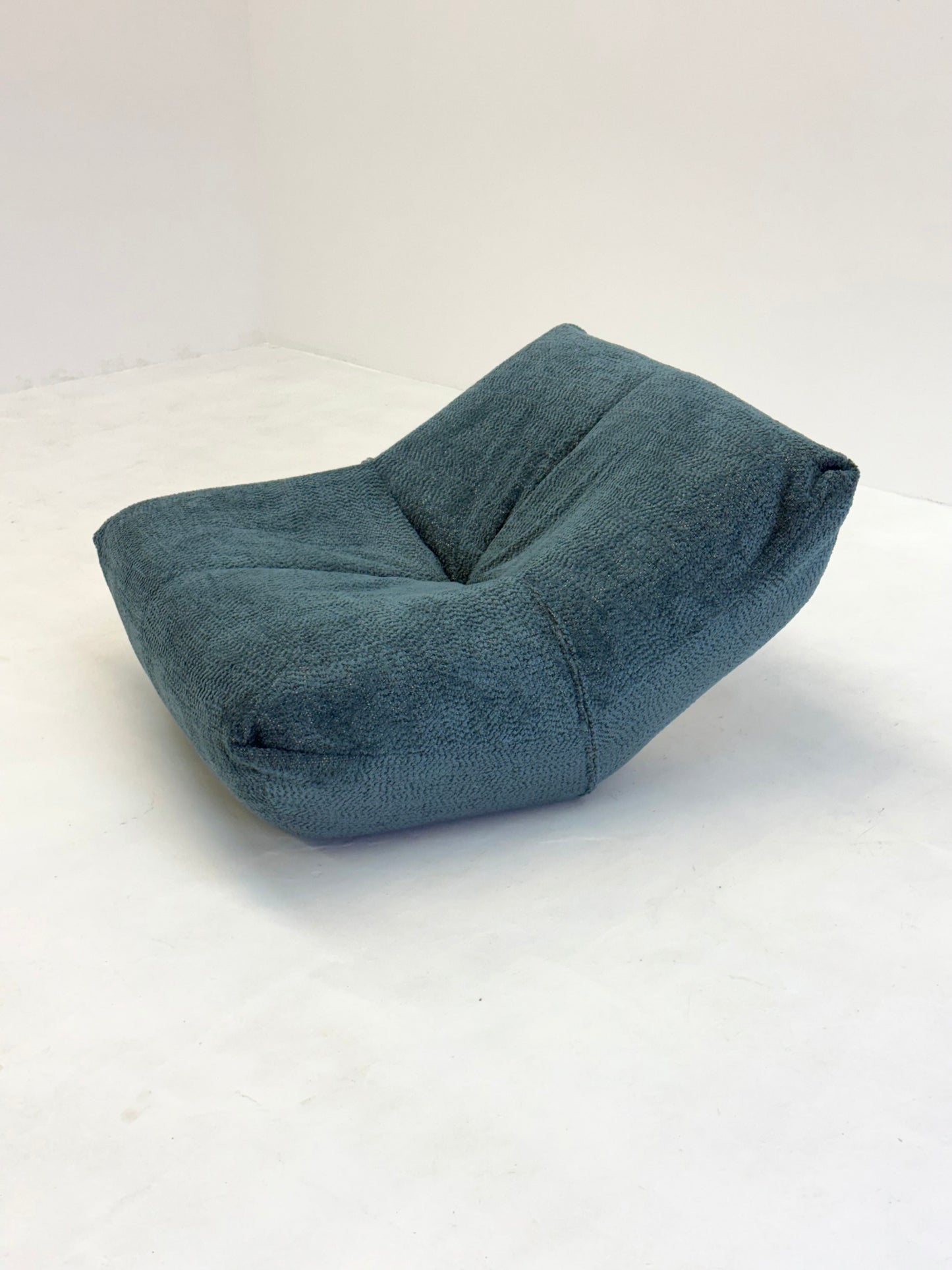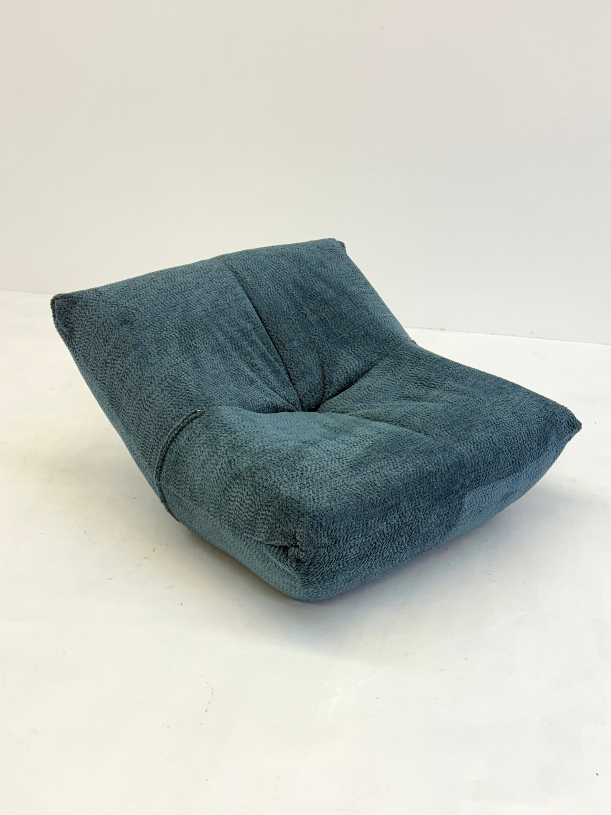 De stoelen zijn bekleed in blauw stof – opnieuw gestoffeerd door de vorige eigenaar – en verkeren in zeer goede staat. Zowel de zitting als de rugleuning hebben dezelfde afmetingen en kunnen verwisseld worden, wat het ontwerp extra praktisch en flexibel maakt.