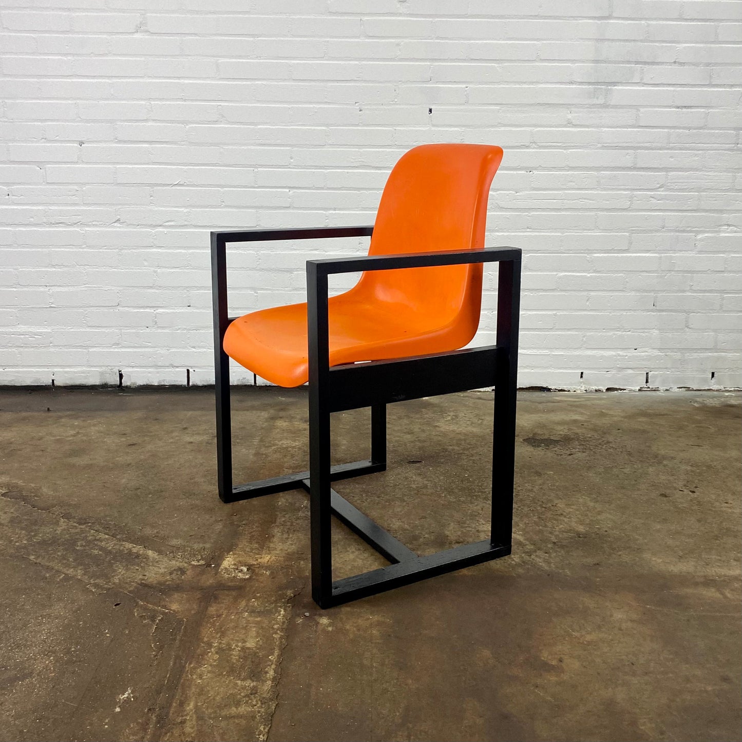 Omschrijving: Plastic space age stoelen ontworpen door Mödel Mann. Het frame van de stoelen is gemaakt van hout.