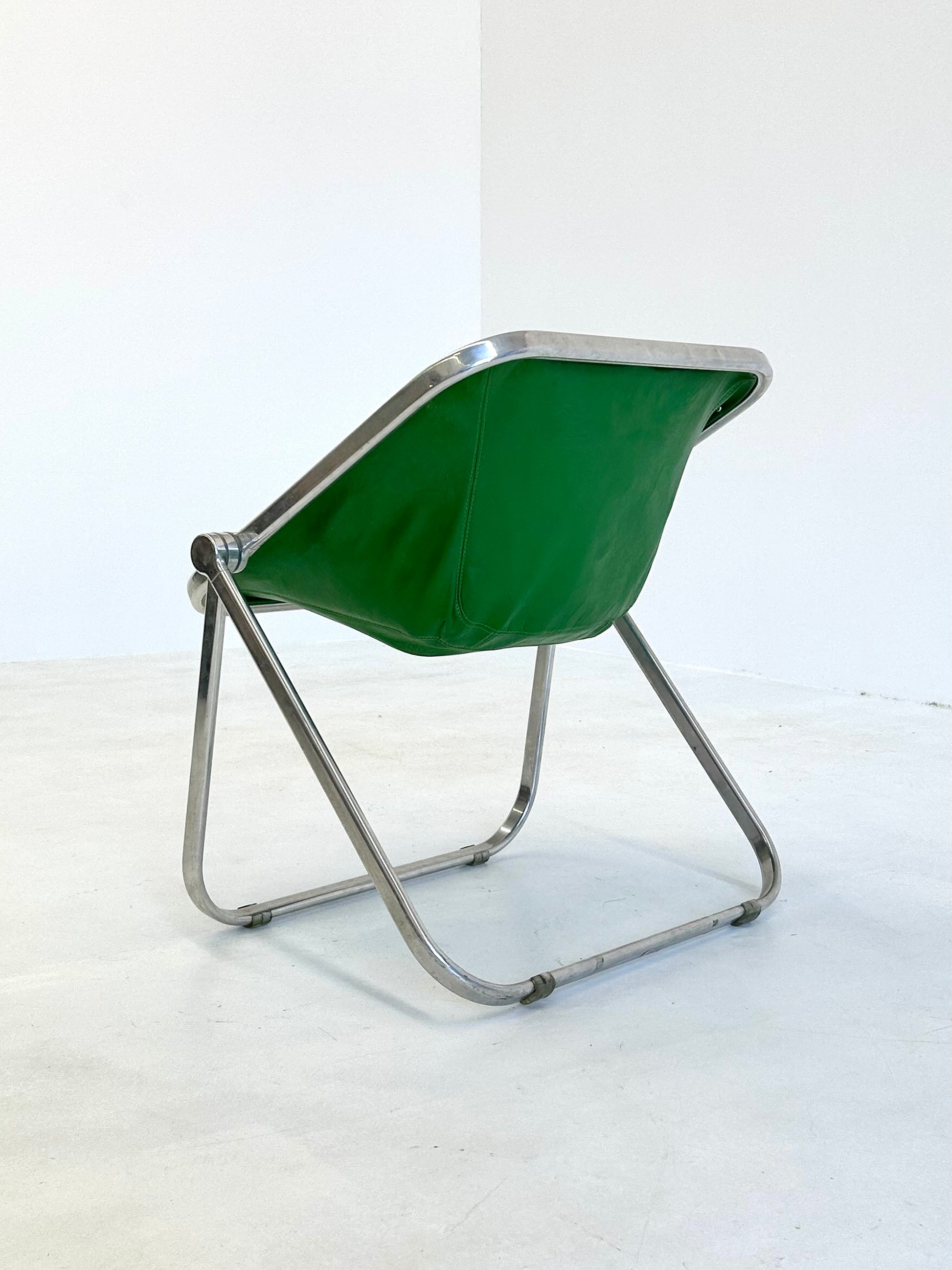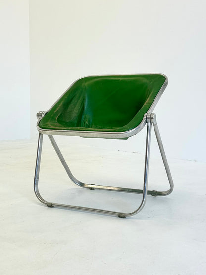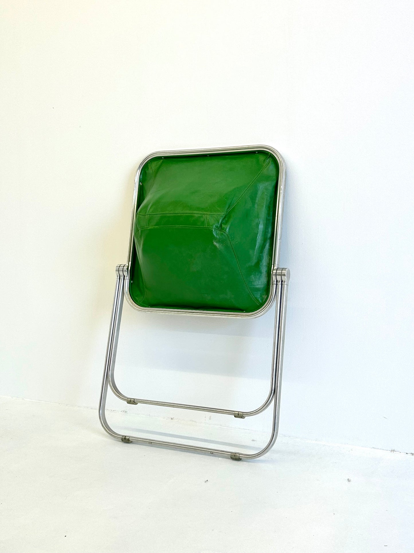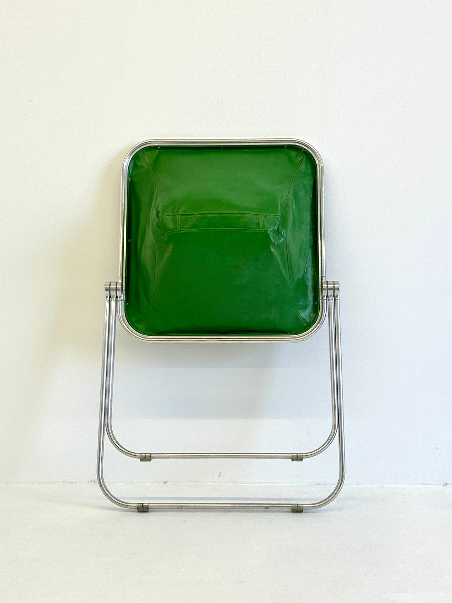 Dit is de iconische Plona stoel, ontworpen door Giancarlo Piretti voor Castelli in de jaren 70. De stoel heeft een opvouwbaar gepolijst aluminium frame en een zitting in groen leer.