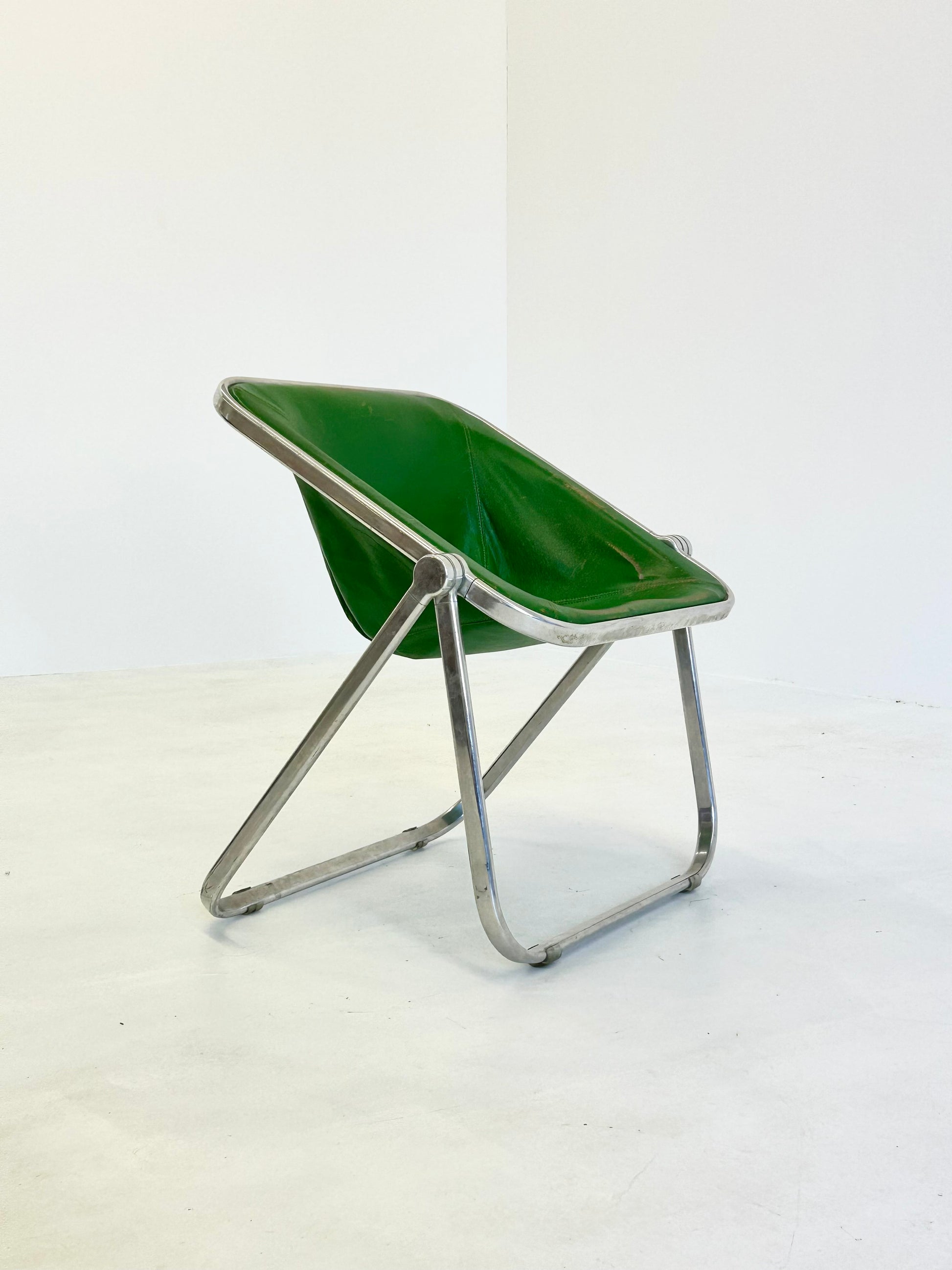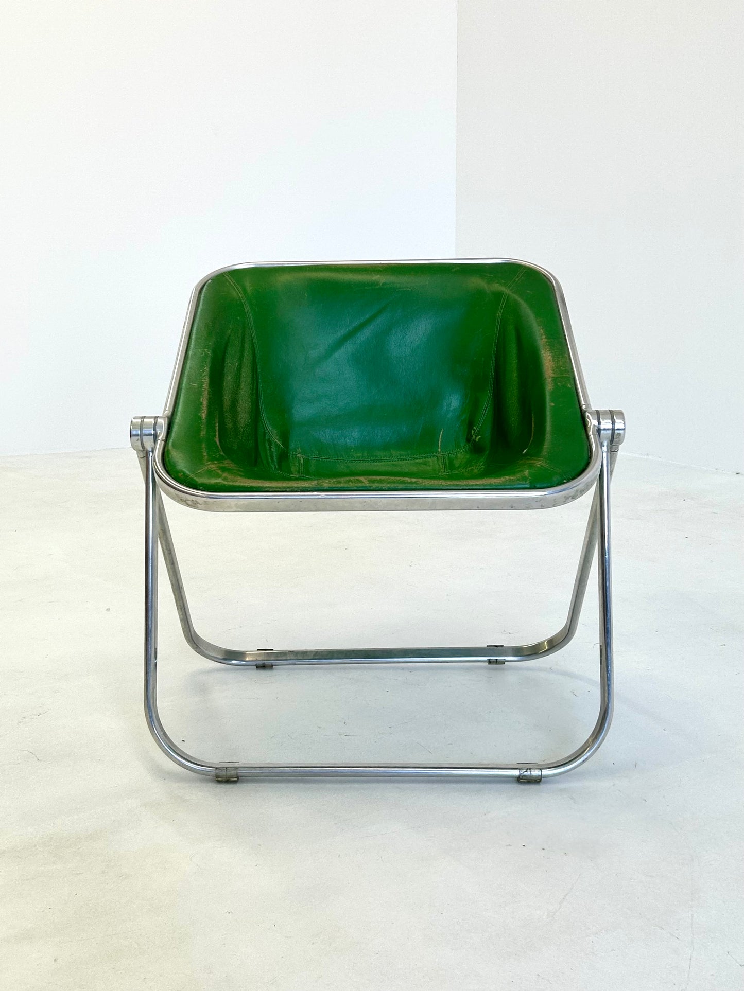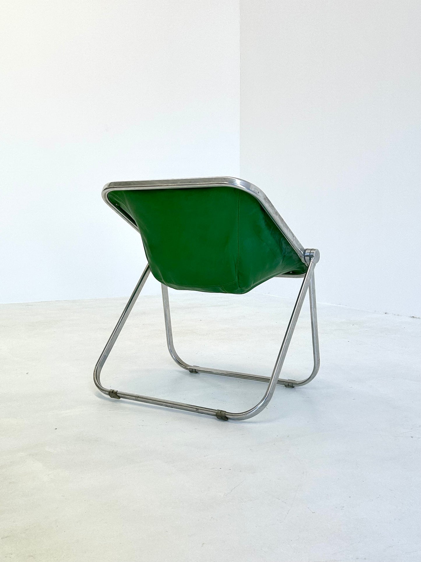 Dit is de iconische Plona stoel, ontworpen door Giancarlo Piretti voor Castelli in de jaren 70. De stoel heeft een opvouwbaar gepolijst aluminium frame en een zitting in groen leer.