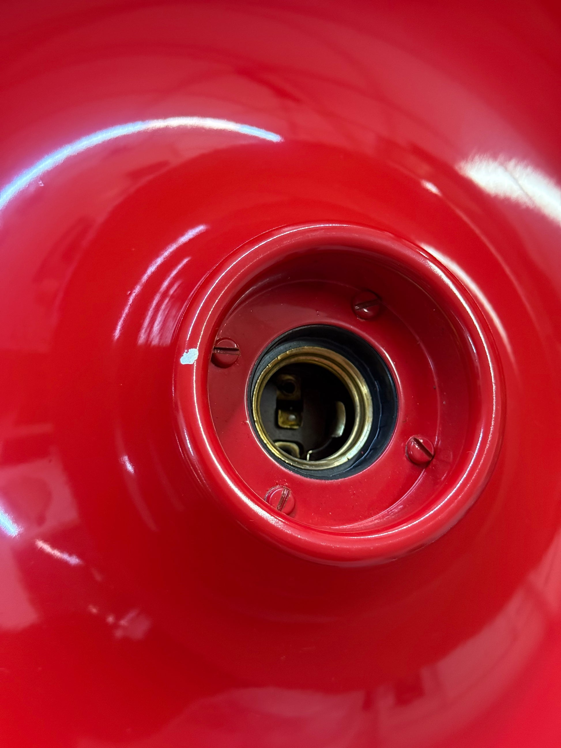 Deze rode disc lamp, ontworpen door Enrico Tronconi (modello depositato), is een opvallend voorbeeld van Space Age design. Het ronde frame is vervaardigd uit dun metaal en geeft de lamp een stevige, grafische uitstraling.