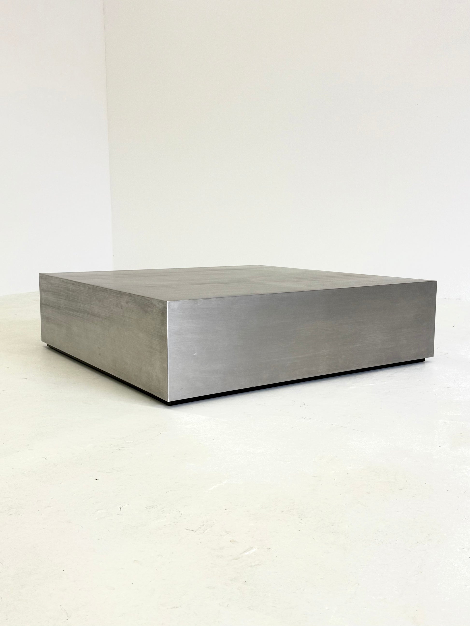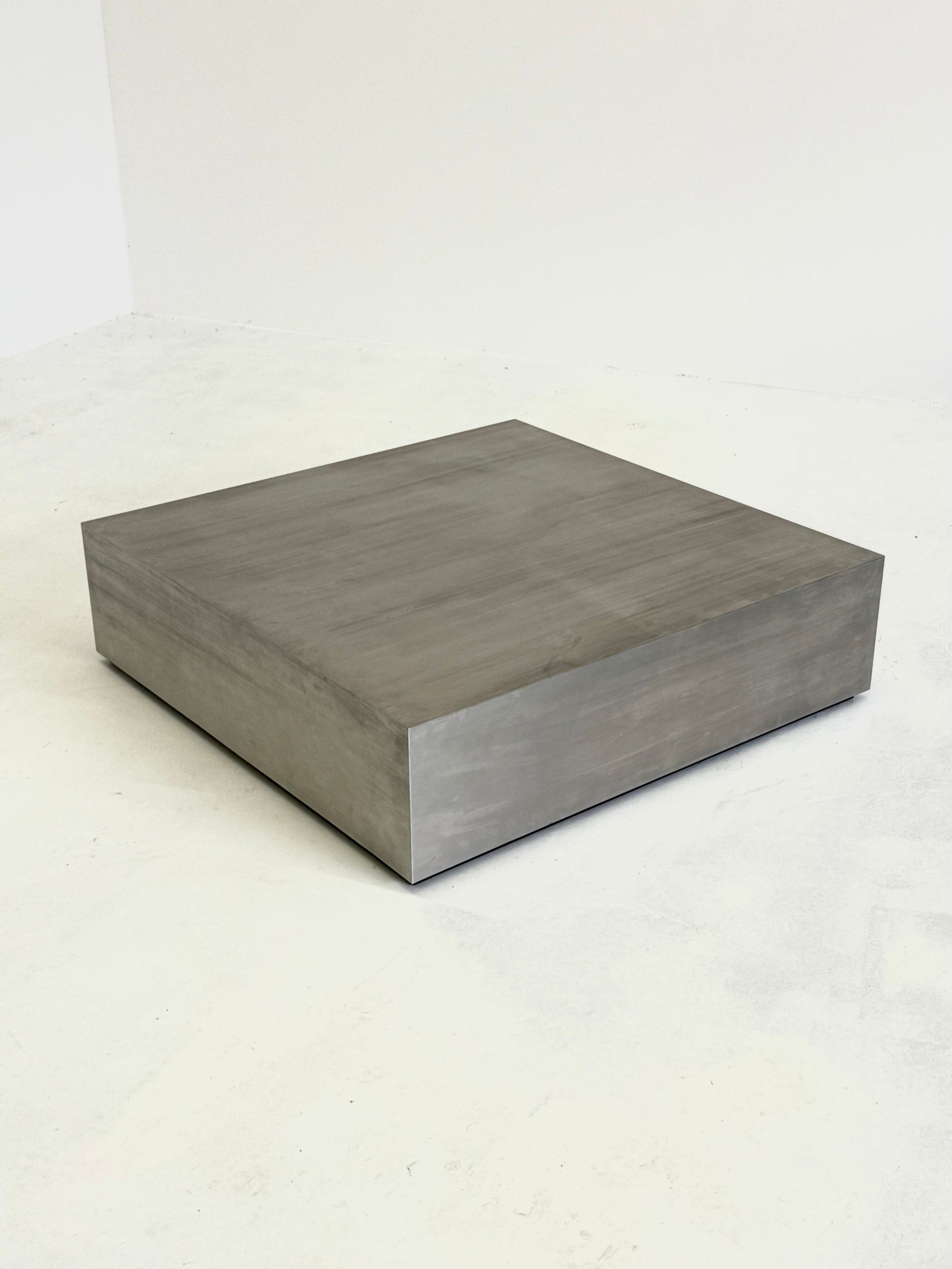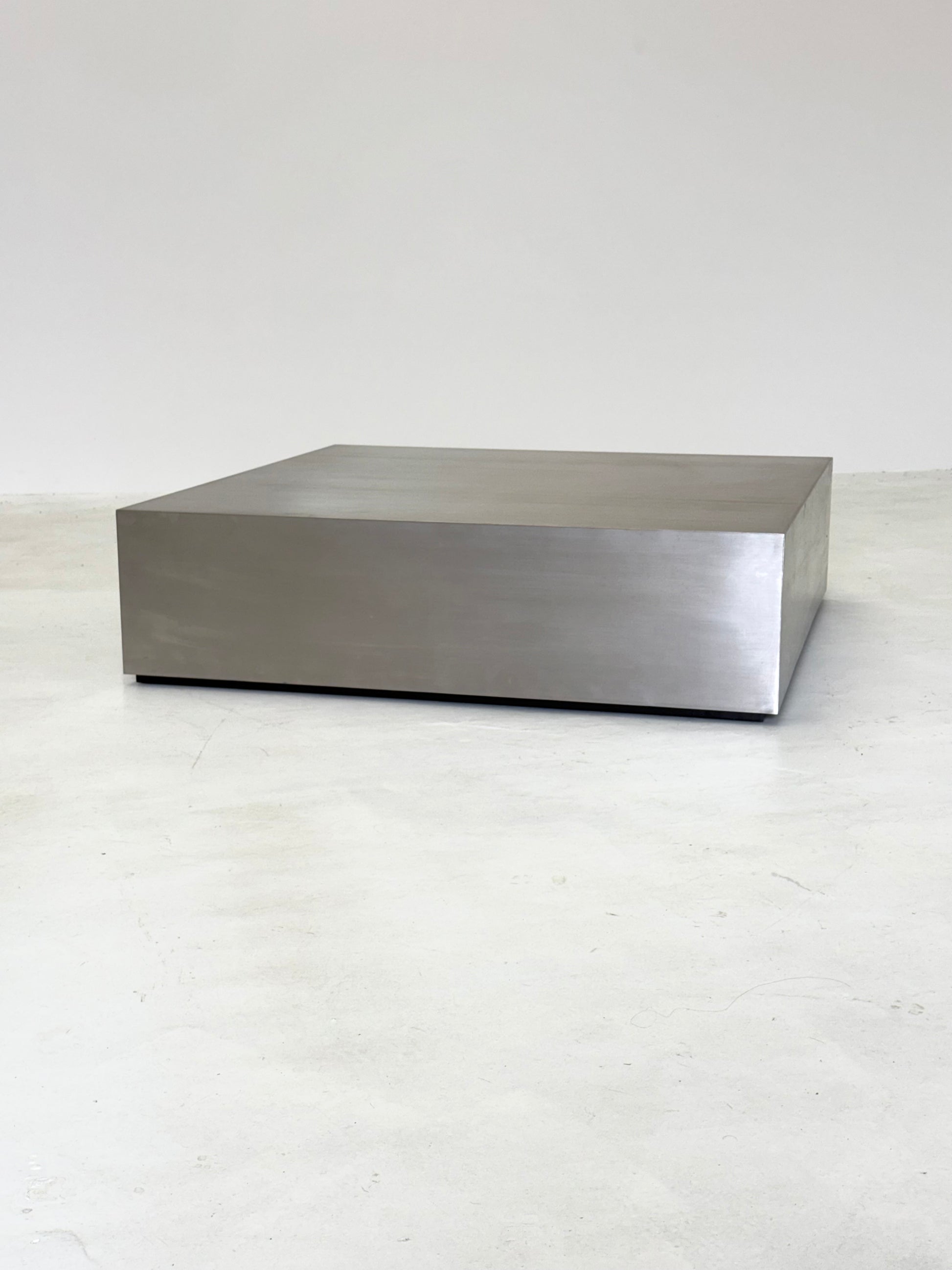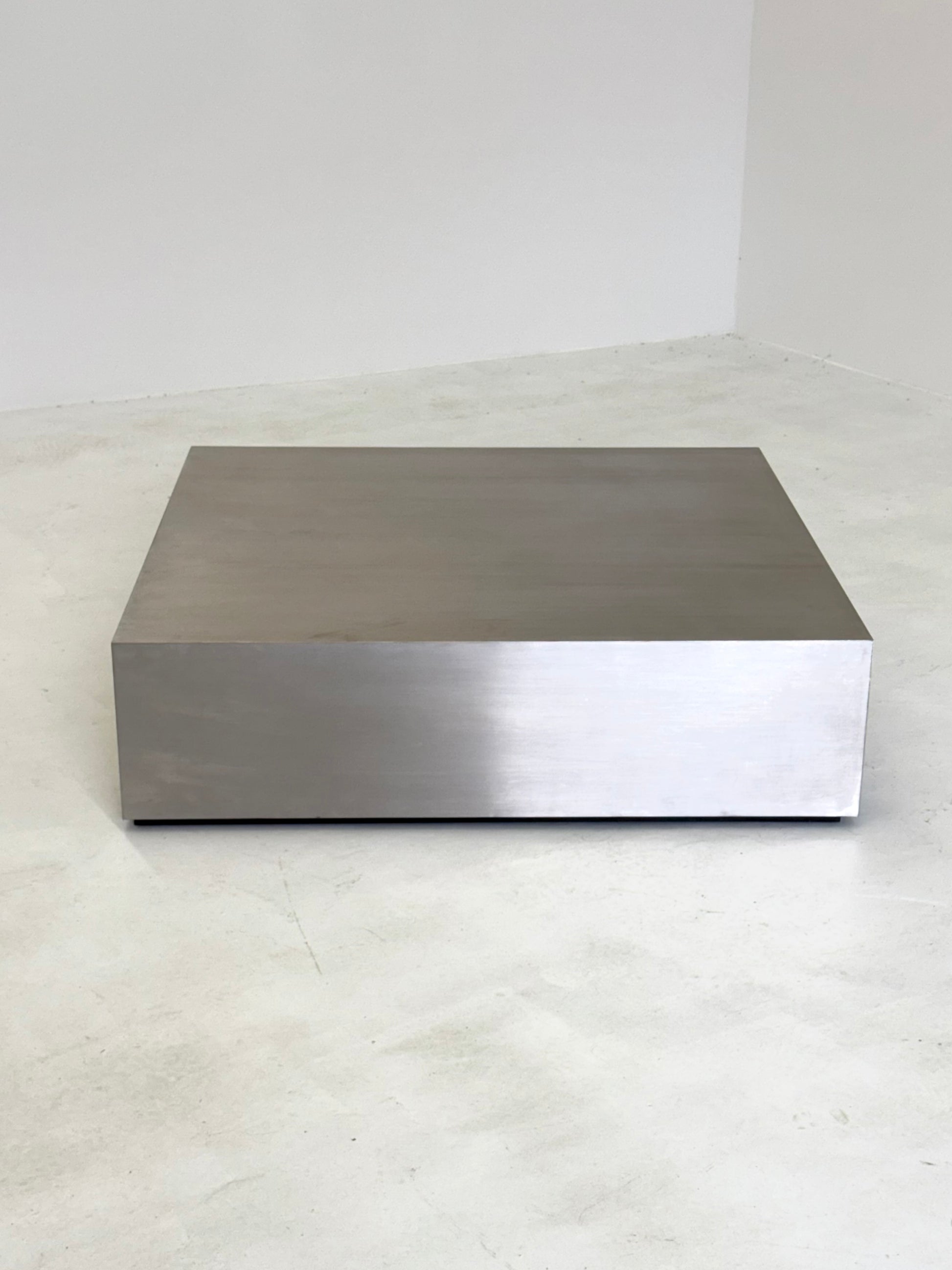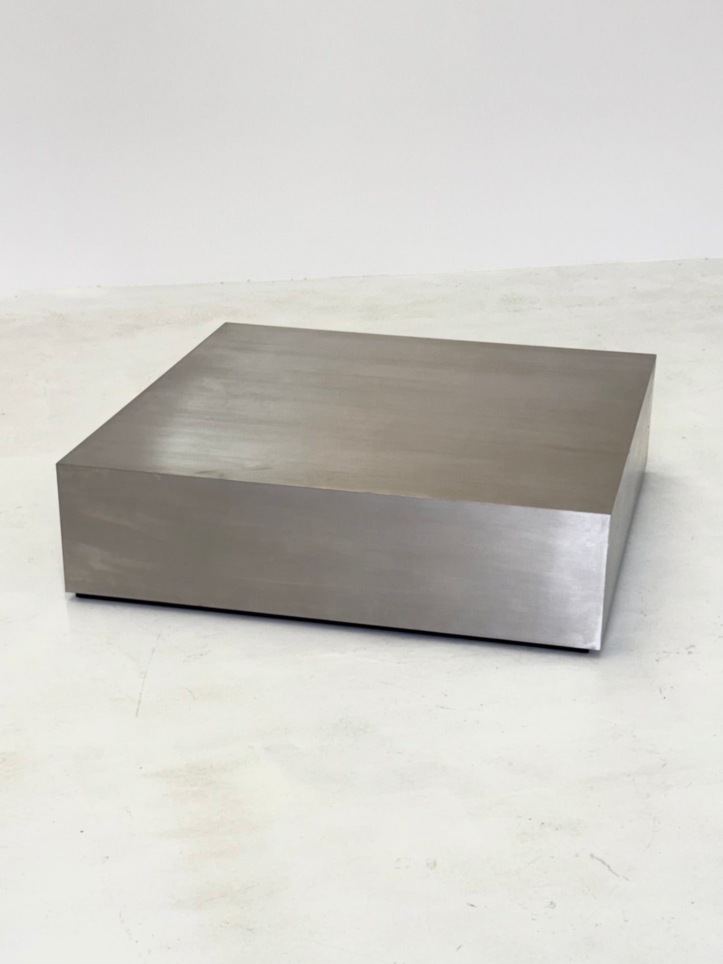 Deze vierkante salontafel is een strakke en moderne blok tafel gemaakt van roestvrij staal (RVS). Het minimalistische ontwerp benadrukt de robuuste en industriële uitstraling van het materiaal.