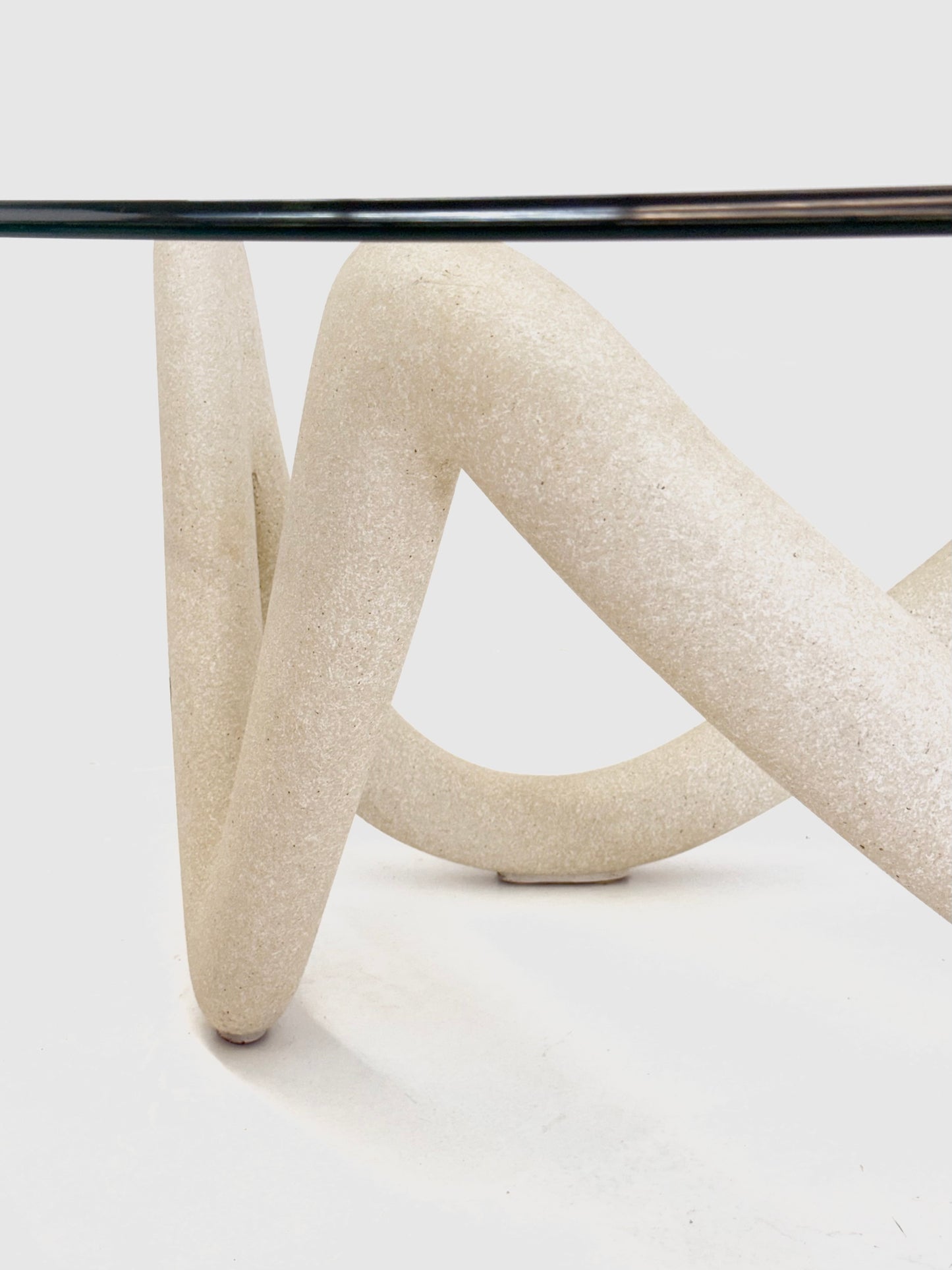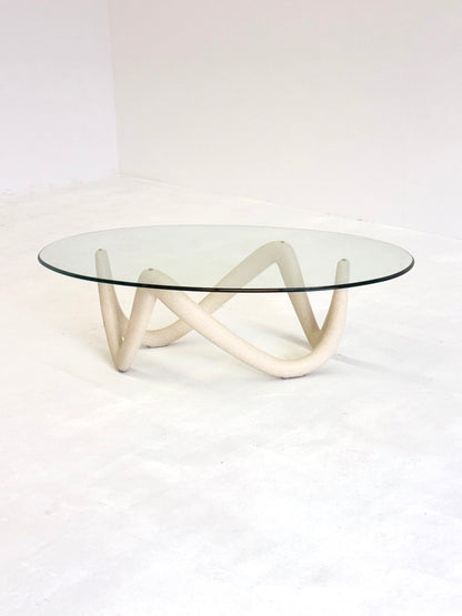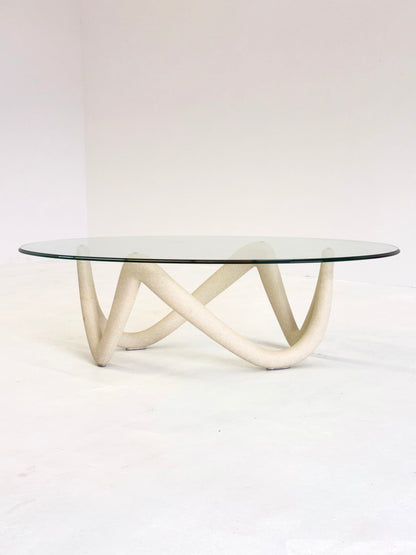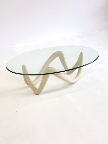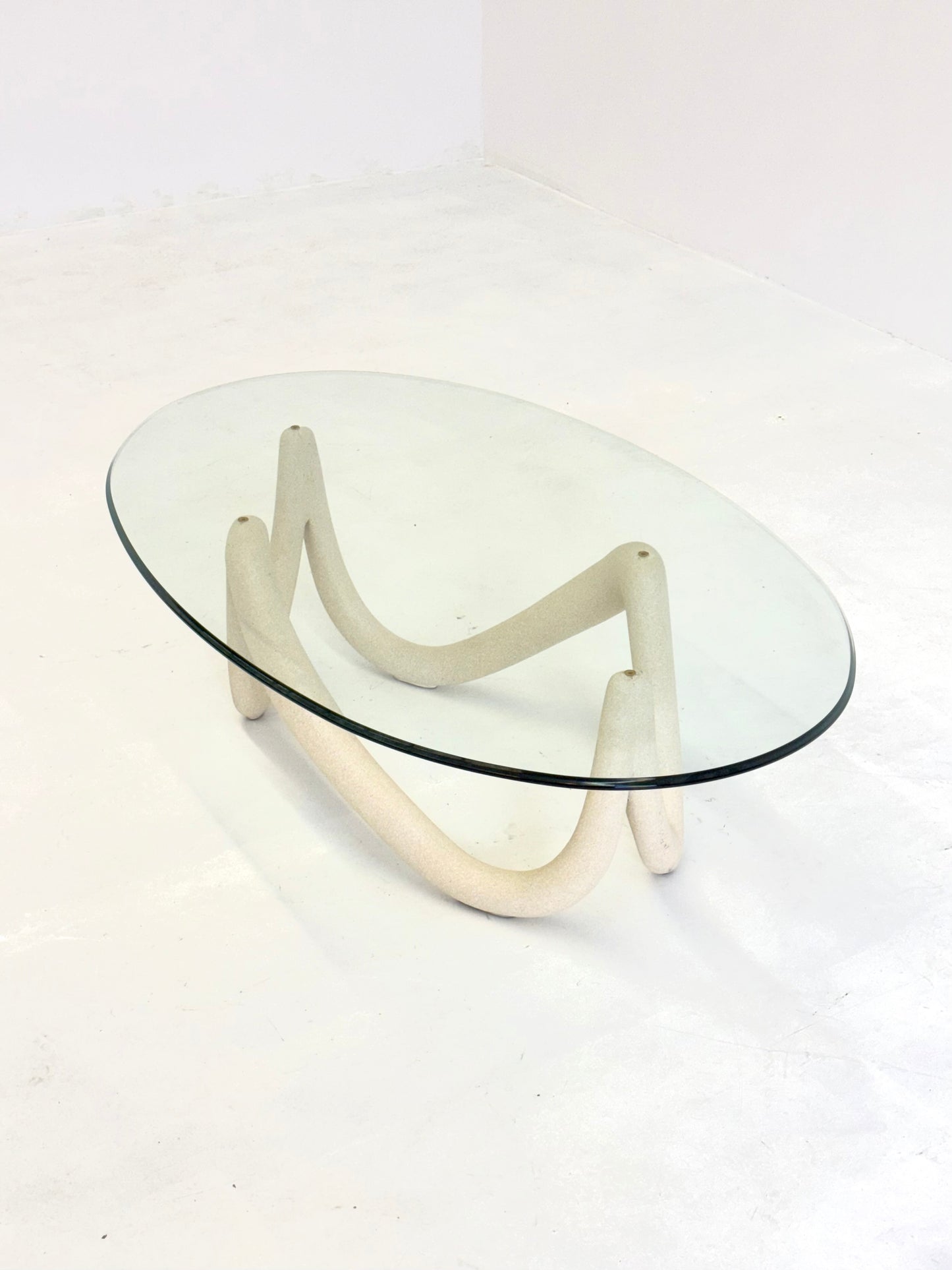 Elegante salontafel met een ovaal glazen blad, rustend op een opvallend sculpturaal onderstel. Deze tafel is ontworpen in Italië en combineert verfijnd design met een krachtig artistiek statement.