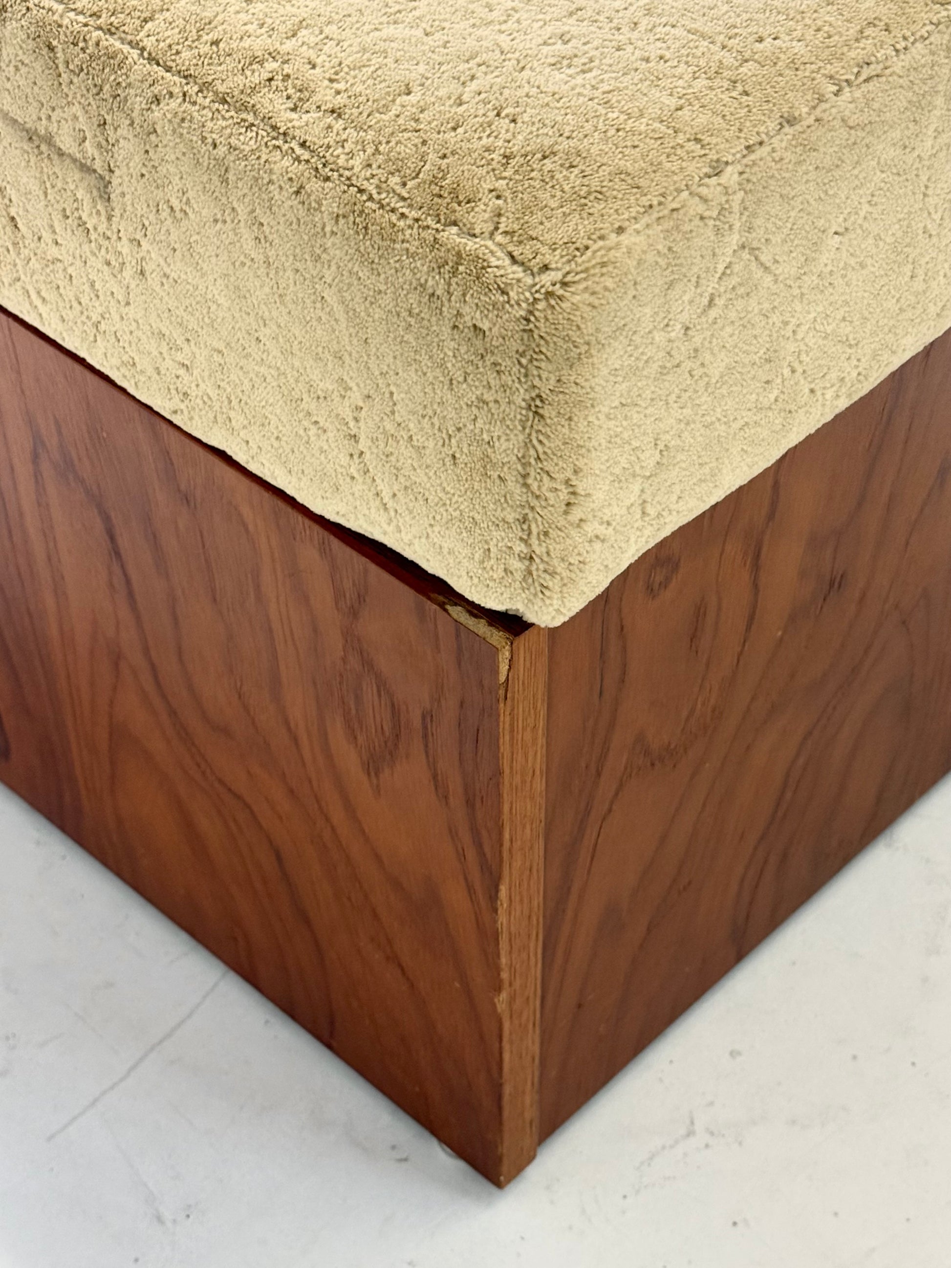 Vintage mid-century beige fauteuil met houten frame en hocker