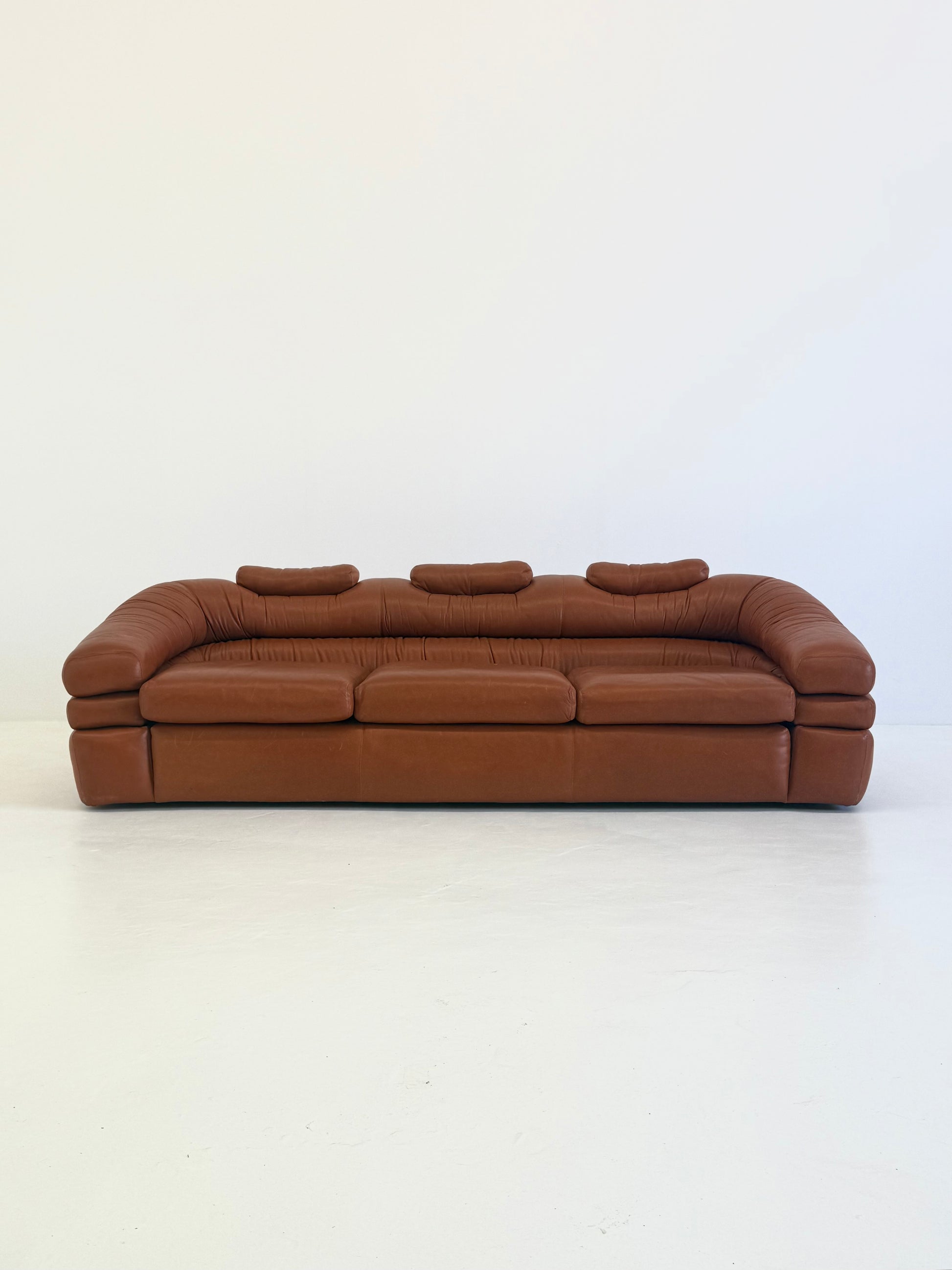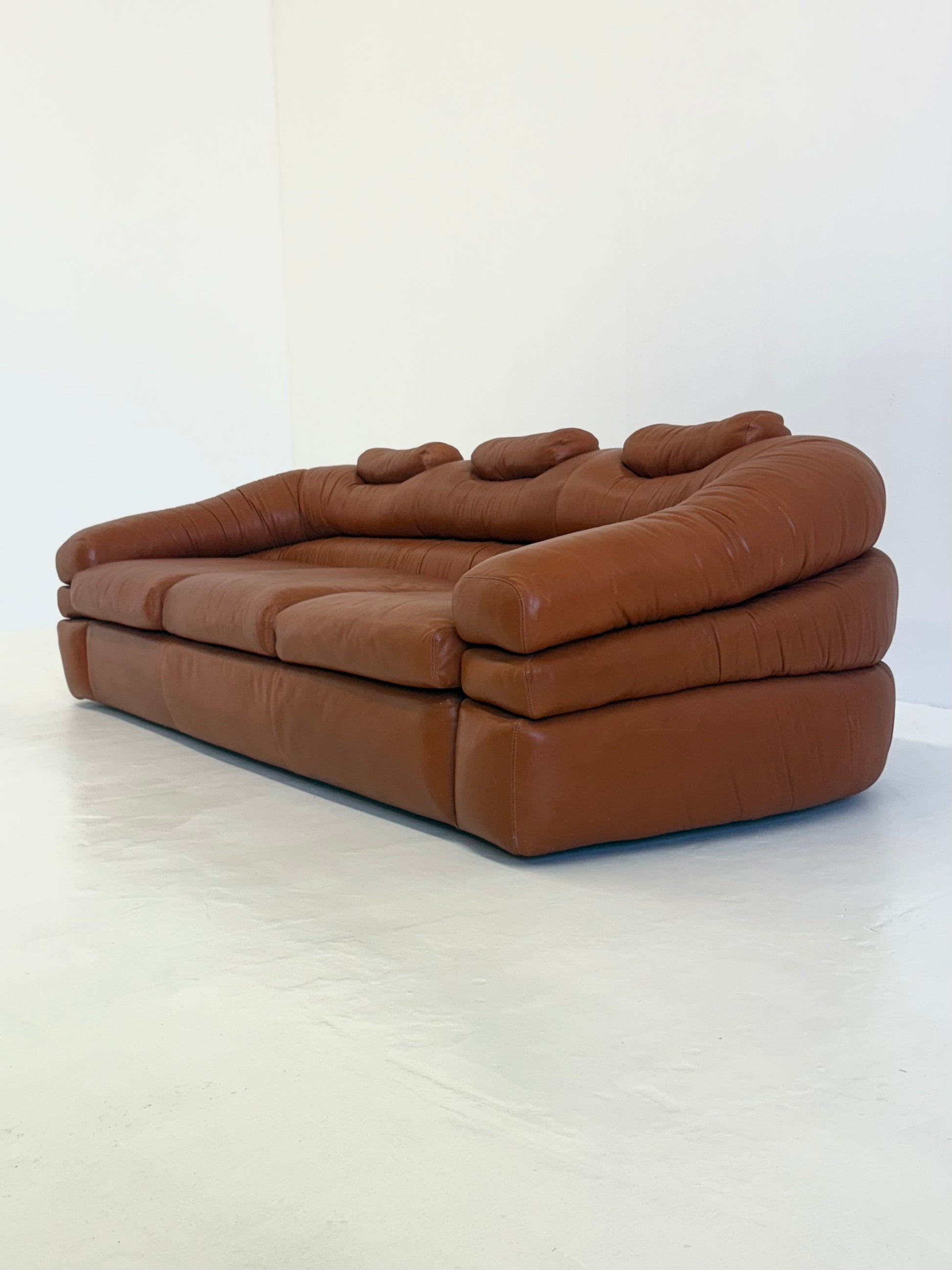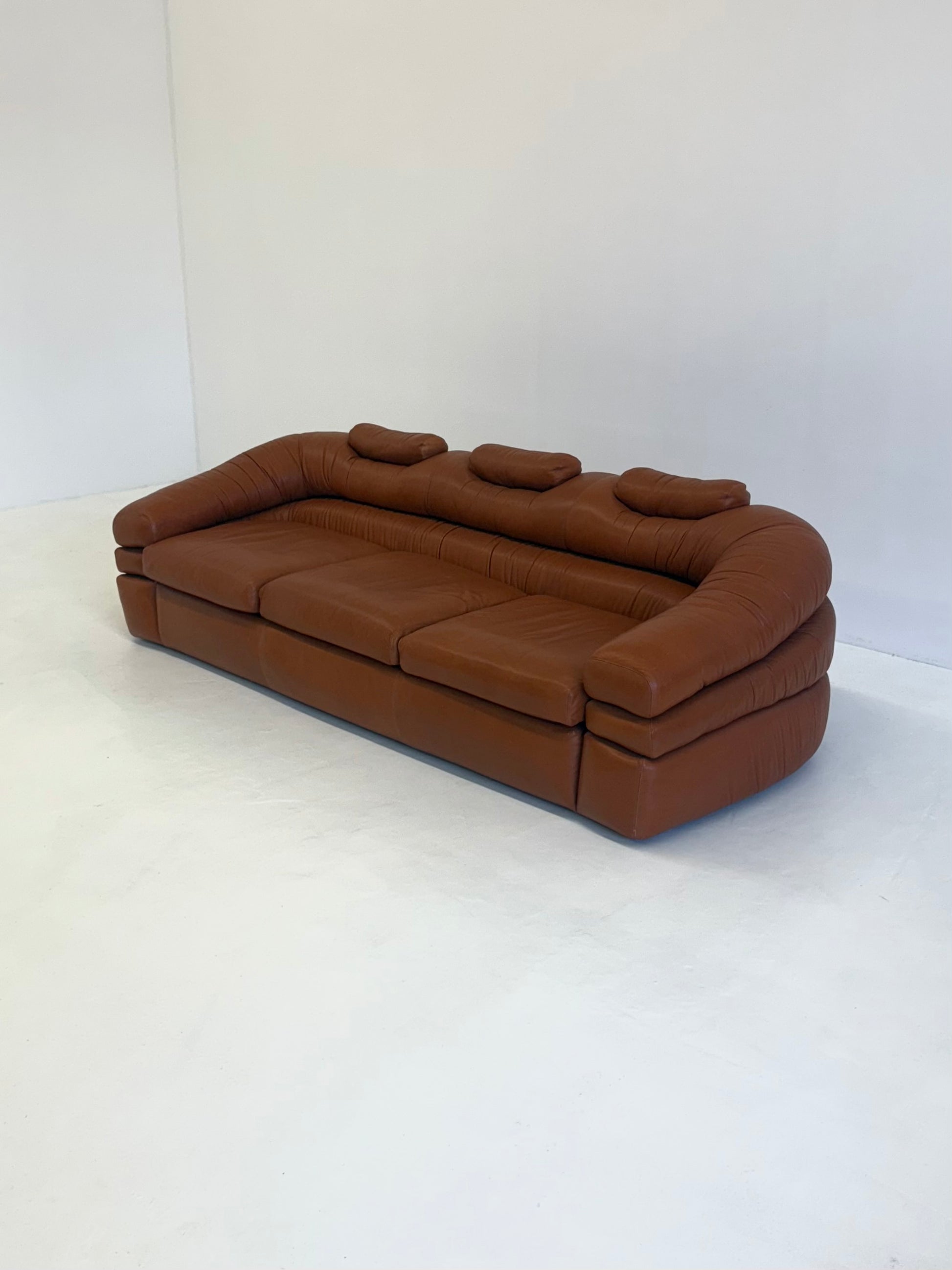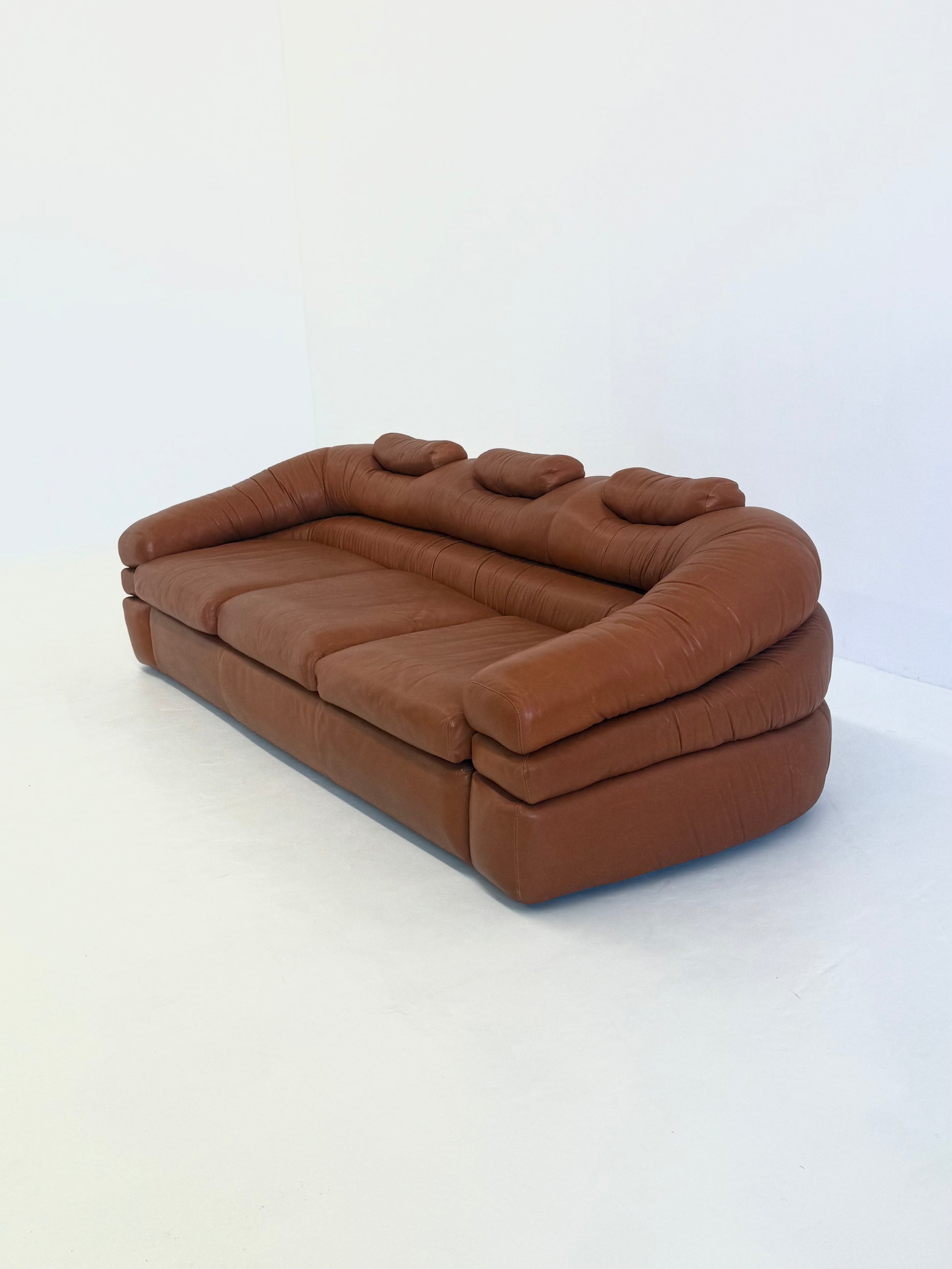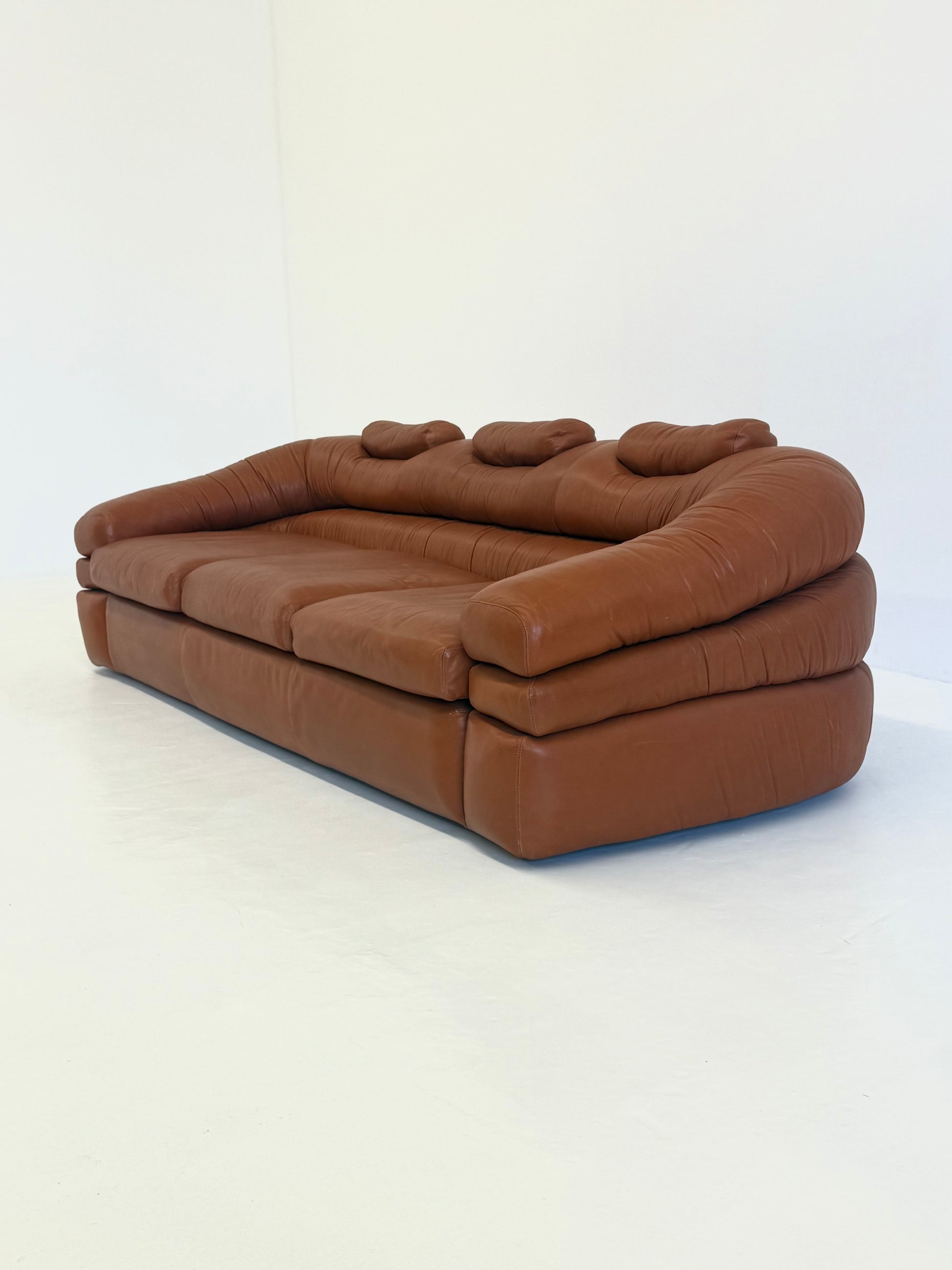 De Straccio bank is een ontwerp van Jonathan De Pas, Donato D’Urbino en Paolo Lomazzi voor Zanotta, een toonaangevend Italiaans designhuis dat sinds 1954 bekendstaat om zijn avant-garde creaties. Deze driezitsbank uit de jaren 70 combineert zachte, afgeronde vormen met een speelse uitstraling en biedt tegelijkertijd veel comfort. De innovatieve constructie in polyurethaanschuim maakte het mogelijk om zonder traditioneel houten of metalen frame te werken, iets wat destijds vernieuwend was en het ontwerp een geheel eigen karakter gaf. De bank is uitgevoerd in origineel cognac kleurig leder en verkeert in goede vintage staat.