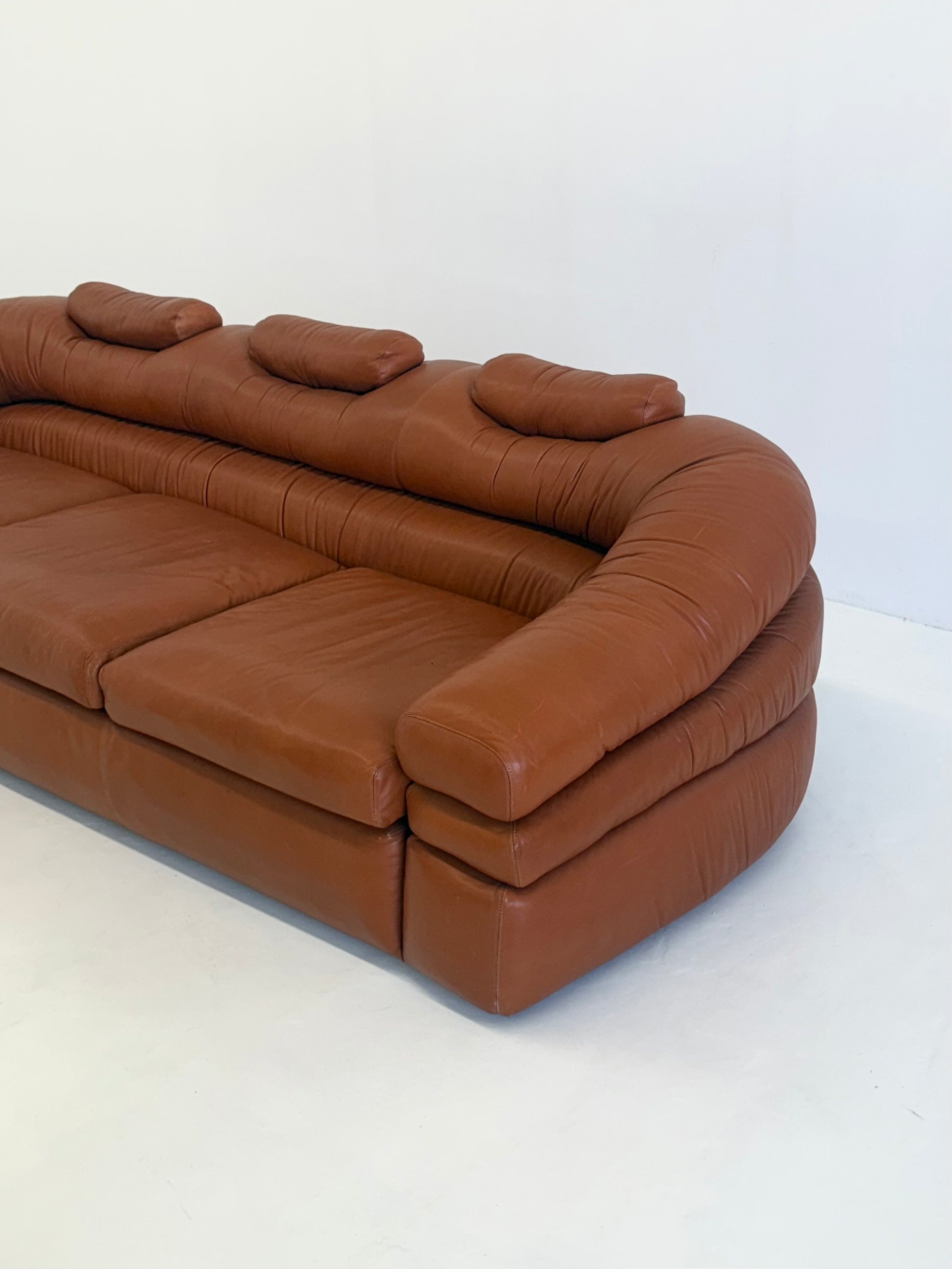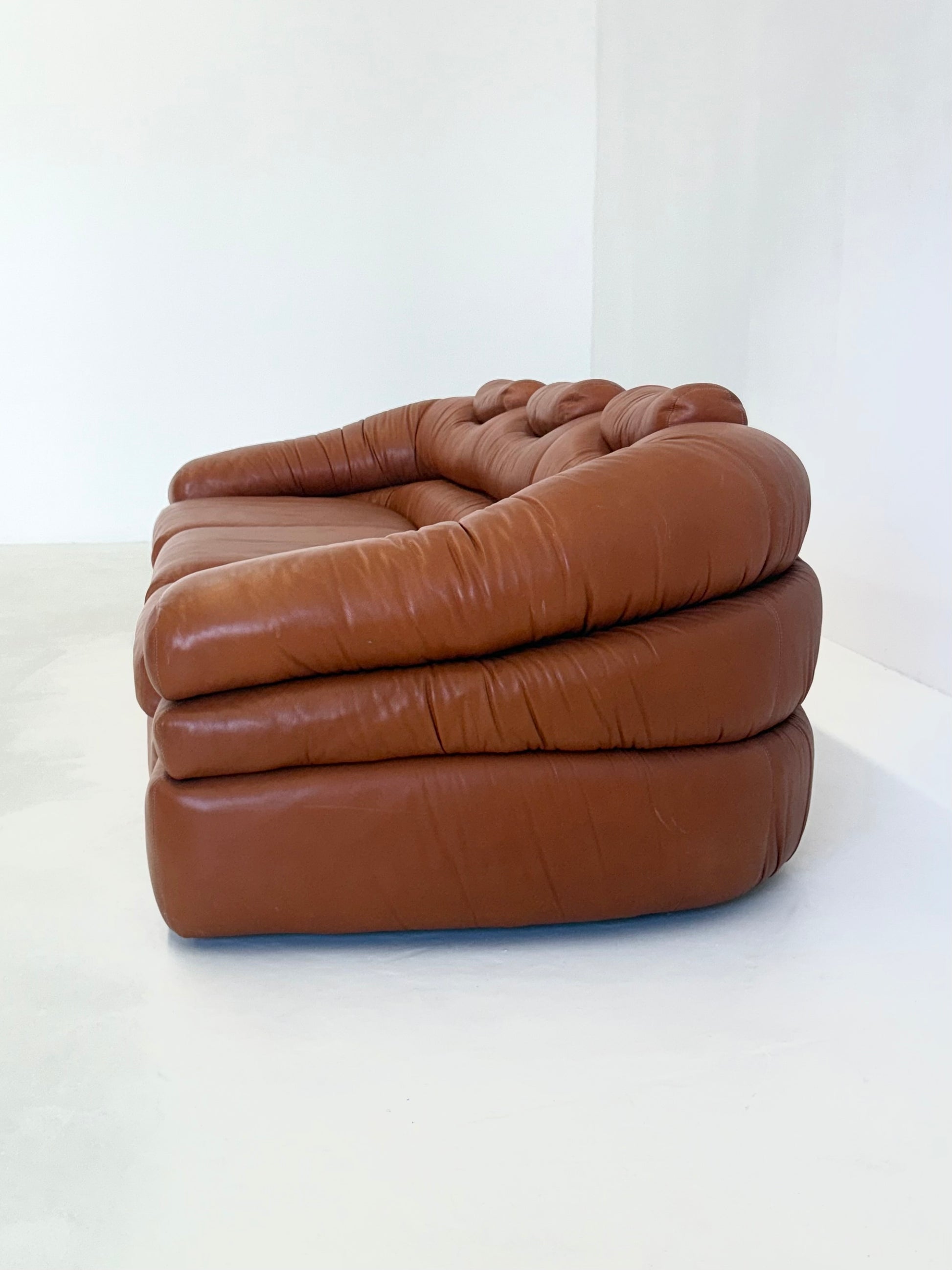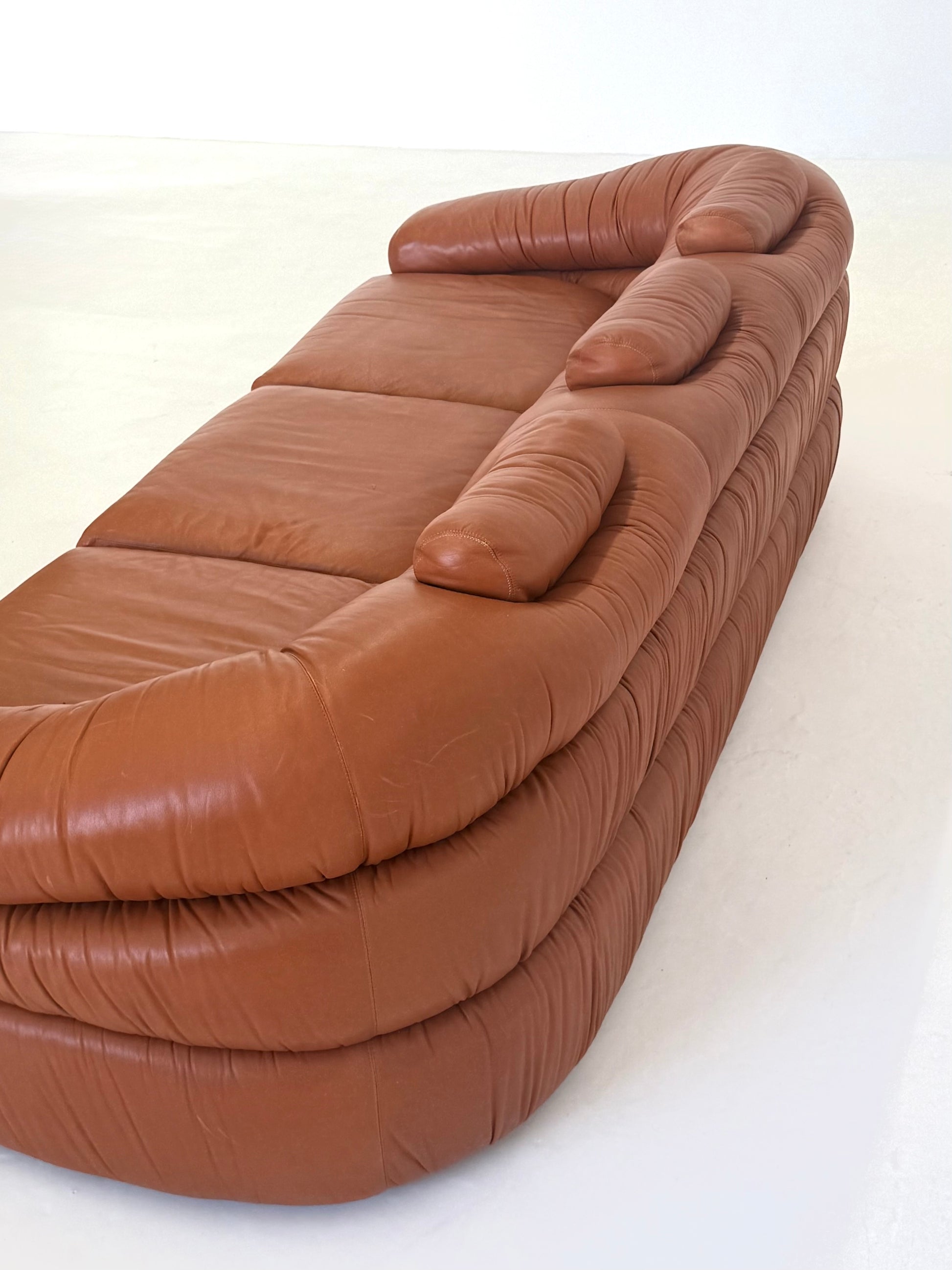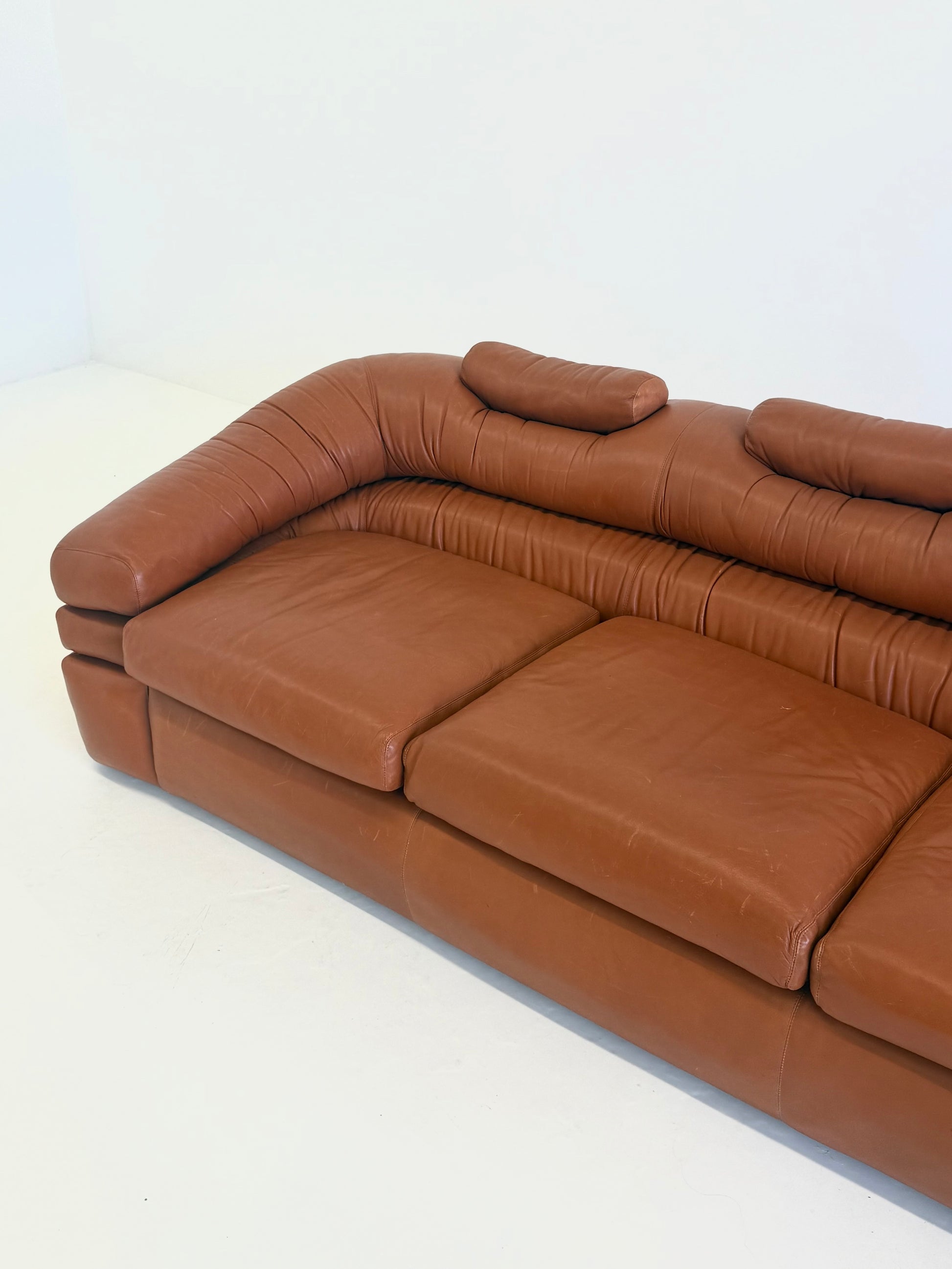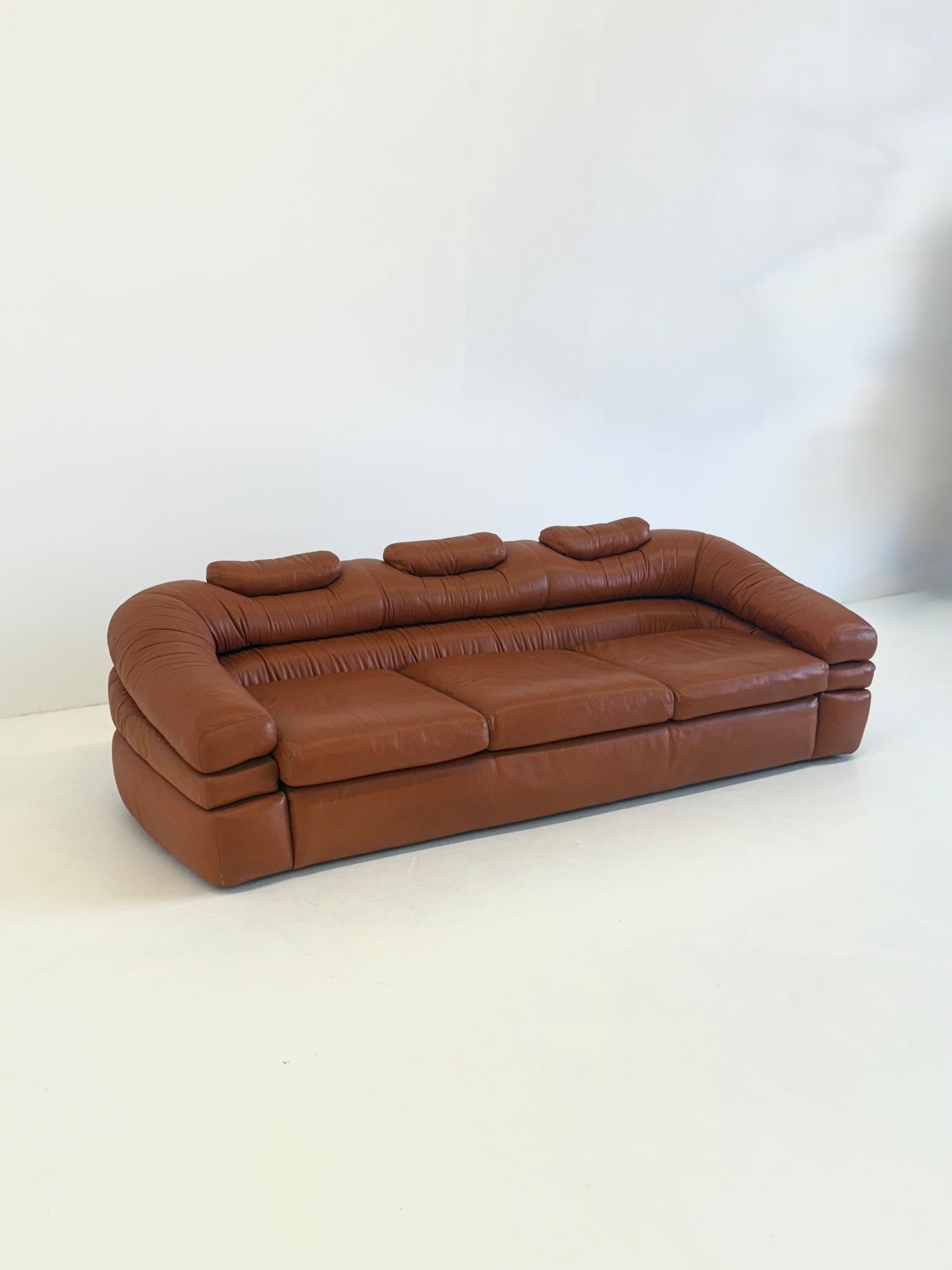 De Straccio bank is een ontwerp van Jonathan De Pas, Donato D’Urbino en Paolo Lomazzi voor Zanotta, een toonaangevend Italiaans designhuis dat sinds 1954 bekendstaat om zijn avant-garde creaties. Deze driezitsbank uit de jaren 70 combineert zachte, afgeronde vormen met een speelse uitstraling en biedt tegelijkertijd veel comfort. De innovatieve constructie in polyurethaanschuim maakte het mogelijk om zonder traditioneel houten of metalen frame te werken, iets wat destijds vernieuwend was en het ontwerp een geheel eigen karakter gaf. De bank is uitgevoerd in origineel cognac kleurig leder en verkeert in goede vintage staat.