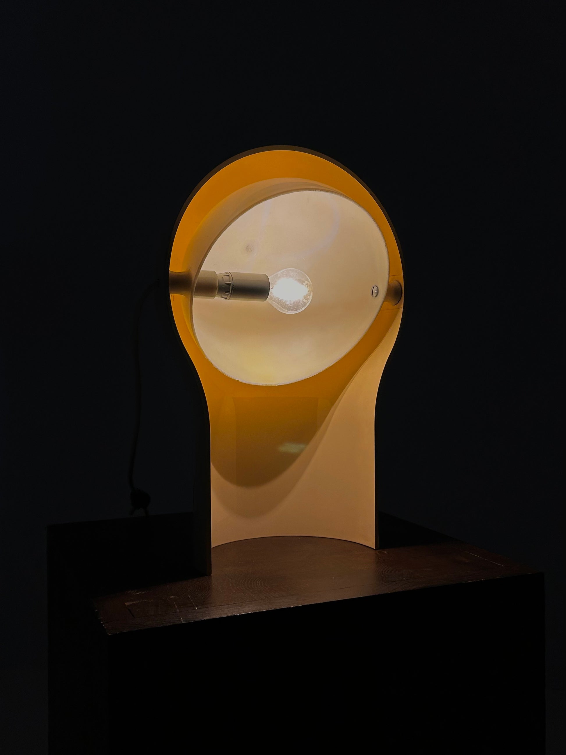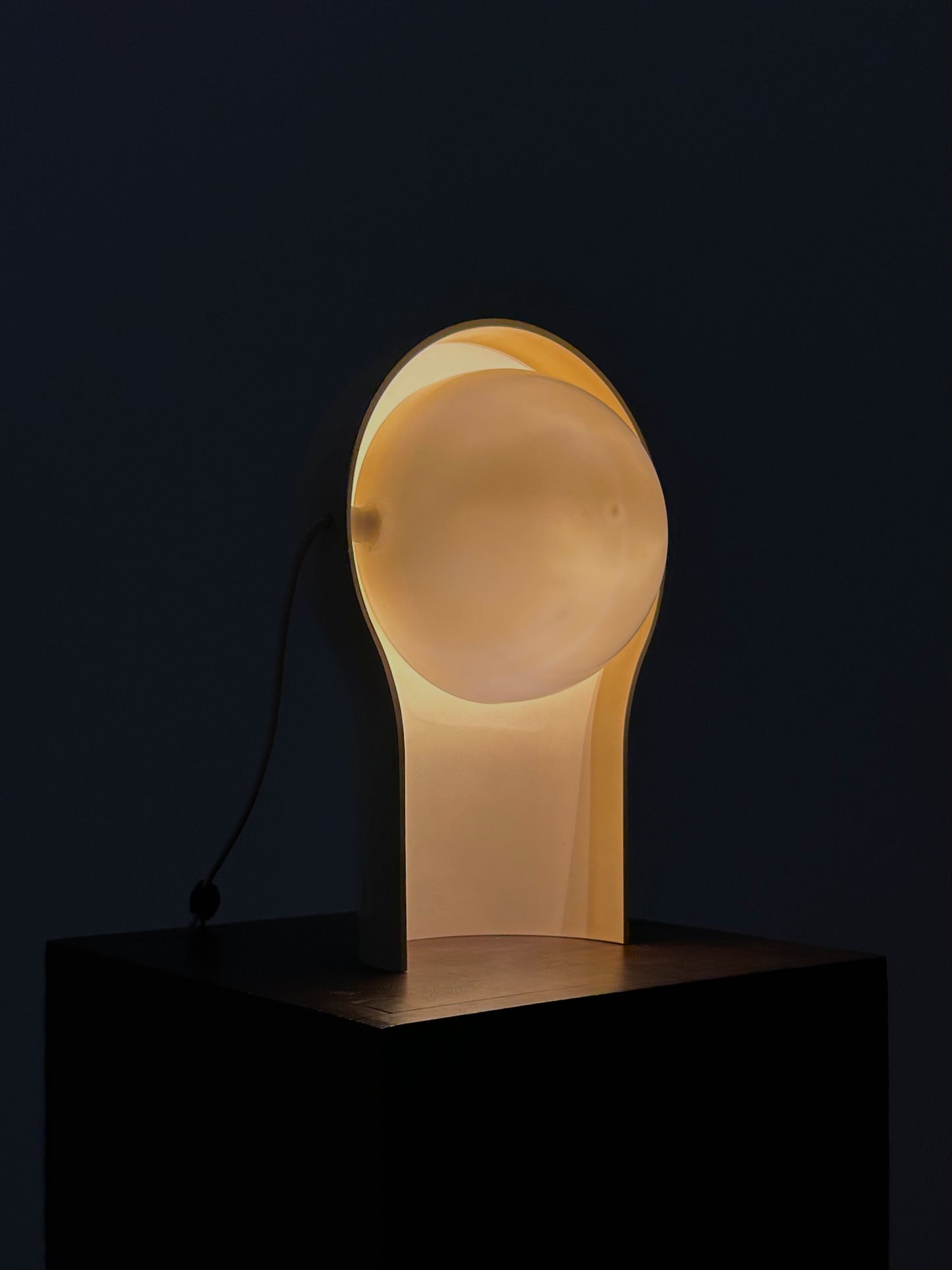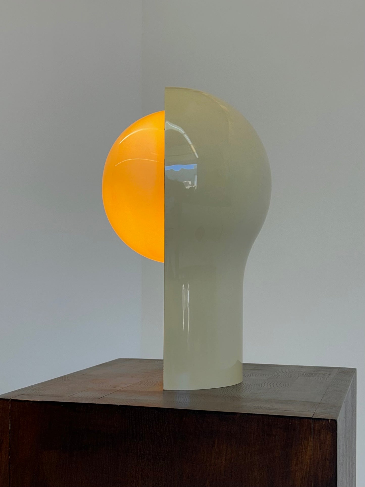 Deze ‘Telegono’ tafel- of bureaulamp, ontworpen door Vico Magistretti voor Artemide in de jaren 60, heeft een sculpturaal ontwerp met een gebogen crèmekleurige acrylbasis en een roterende witte opaline kunststof diffuser. De lamp heeft een karakteristieke en moderne uitstraling die de essentie van Italiaans design uit de midden 20e eeuw vastlegt.