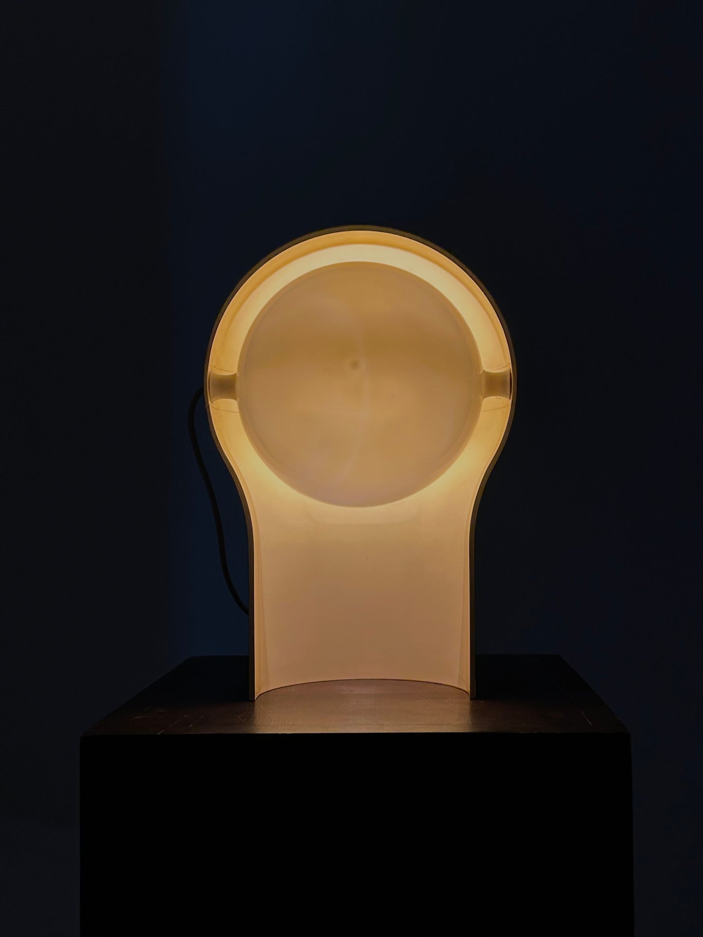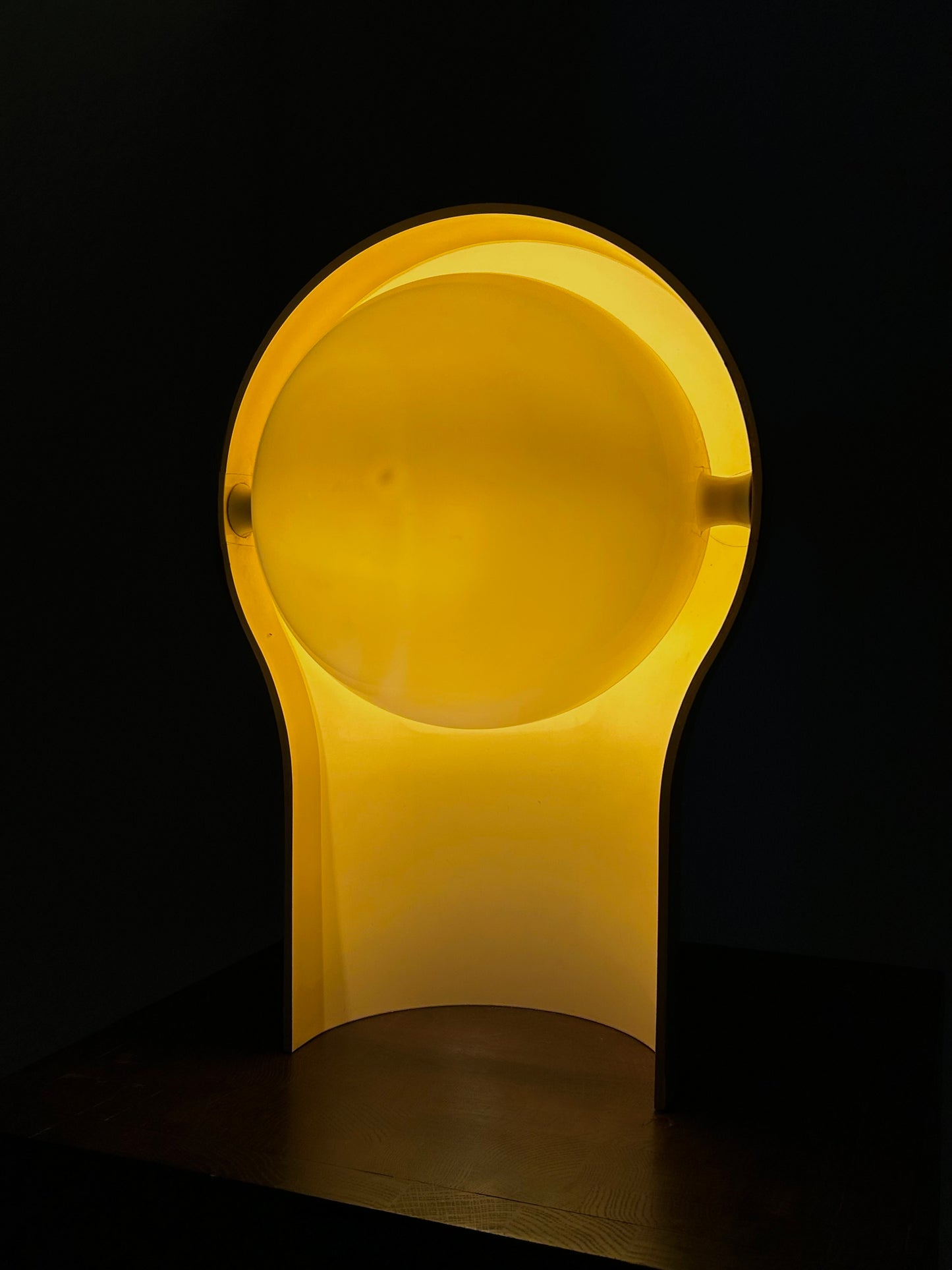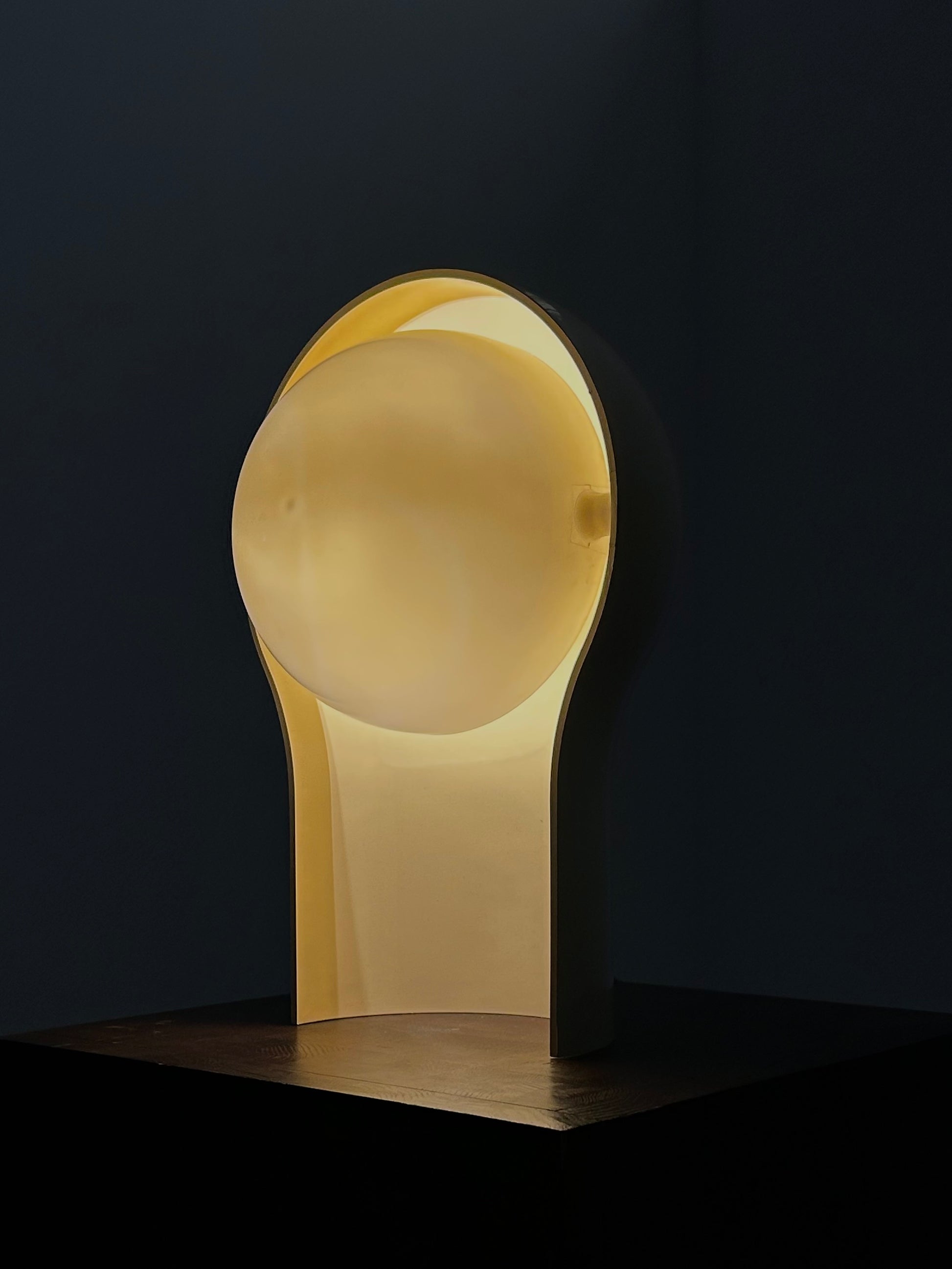 Deze ‘Telegono’ tafel- of bureaulamp, ontworpen door Vico Magistretti voor Artemide in de jaren 60, heeft een sculpturaal ontwerp met een gebogen crèmekleurige acrylbasis en een roterende witte opaline kunststof diffuser. De lamp heeft een karakteristieke en moderne uitstraling die de essentie van Italiaans design uit de midden 20e eeuw vastlegt.
