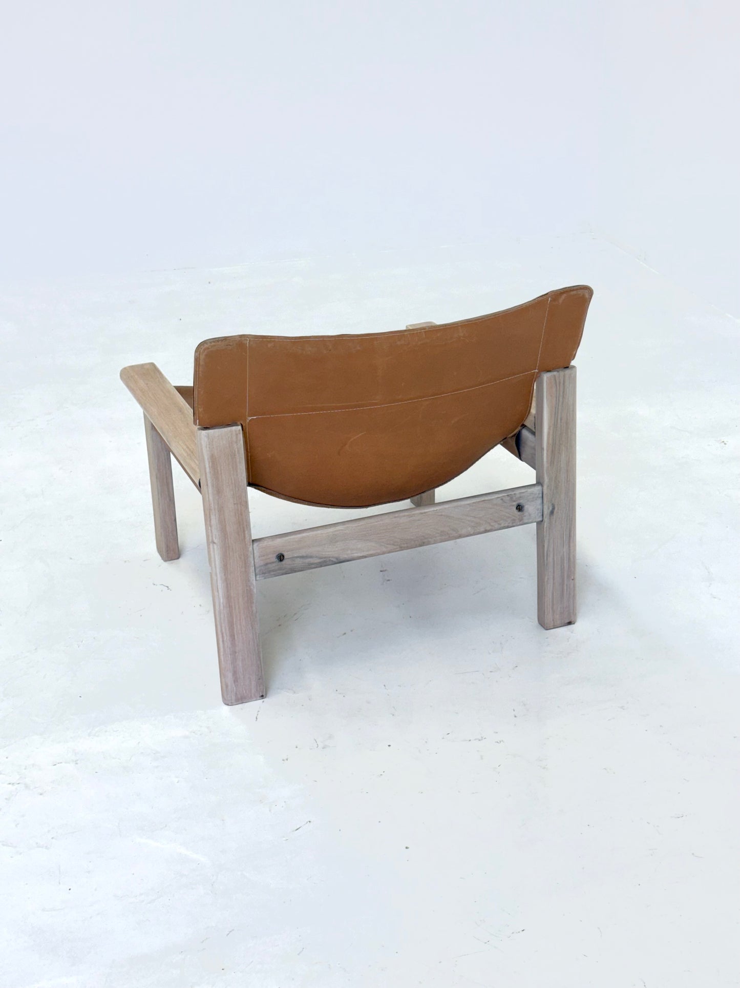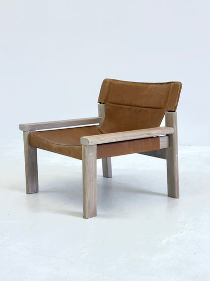 Stijlvolle vintage fauteuil met tuigleren zitting en rugleuning in een warme cognackleur. Deze stoel is geïnspireerd op het iconische design van de Natura stoel van Karin Mobring voor IKEA uit de jaren 70. Het frame is robuust en solide, en de combinatie van leer en hout geeft een tijdloze uitstraling die perfect past in zowel vintage als moderne interieurs.