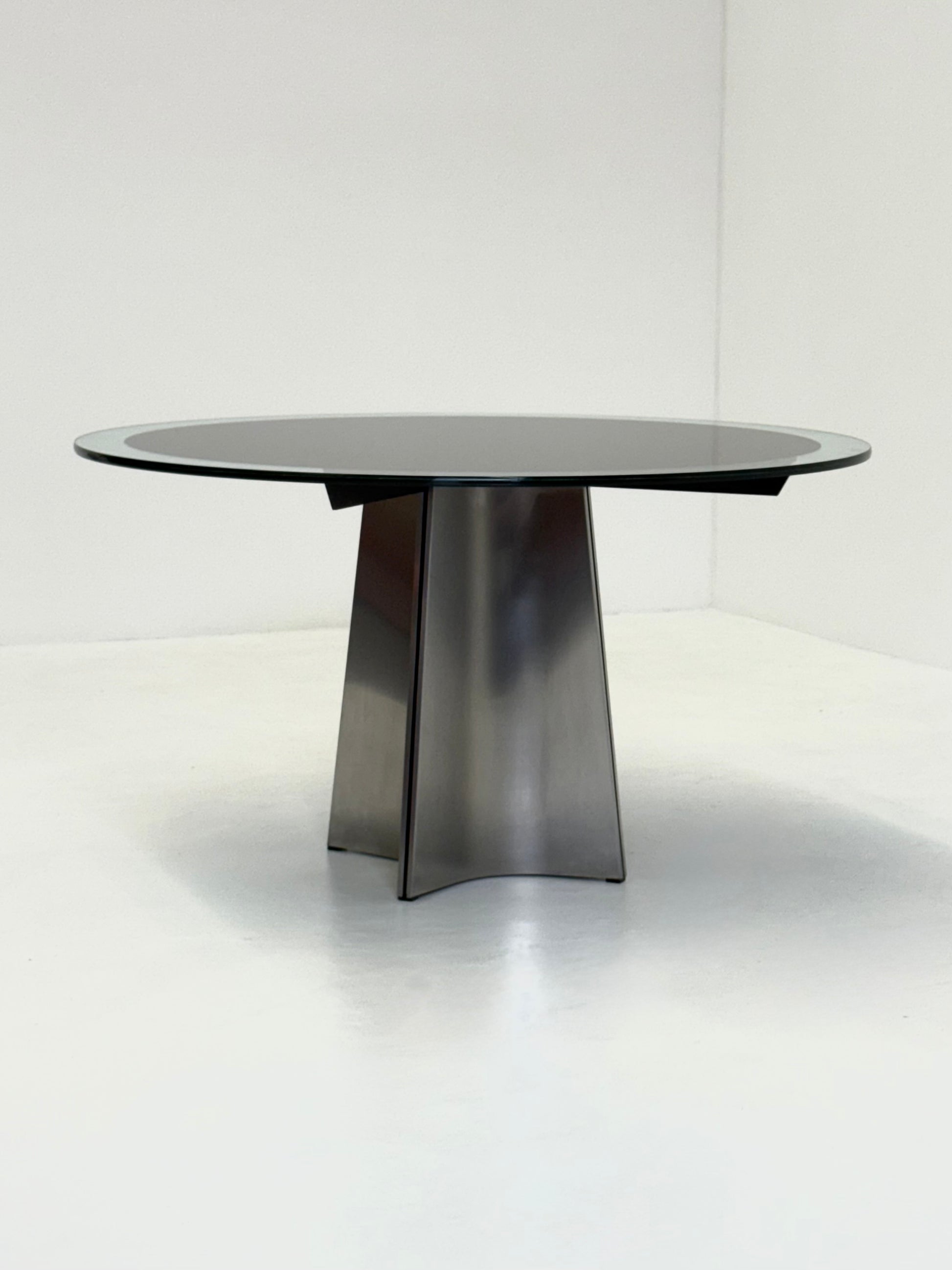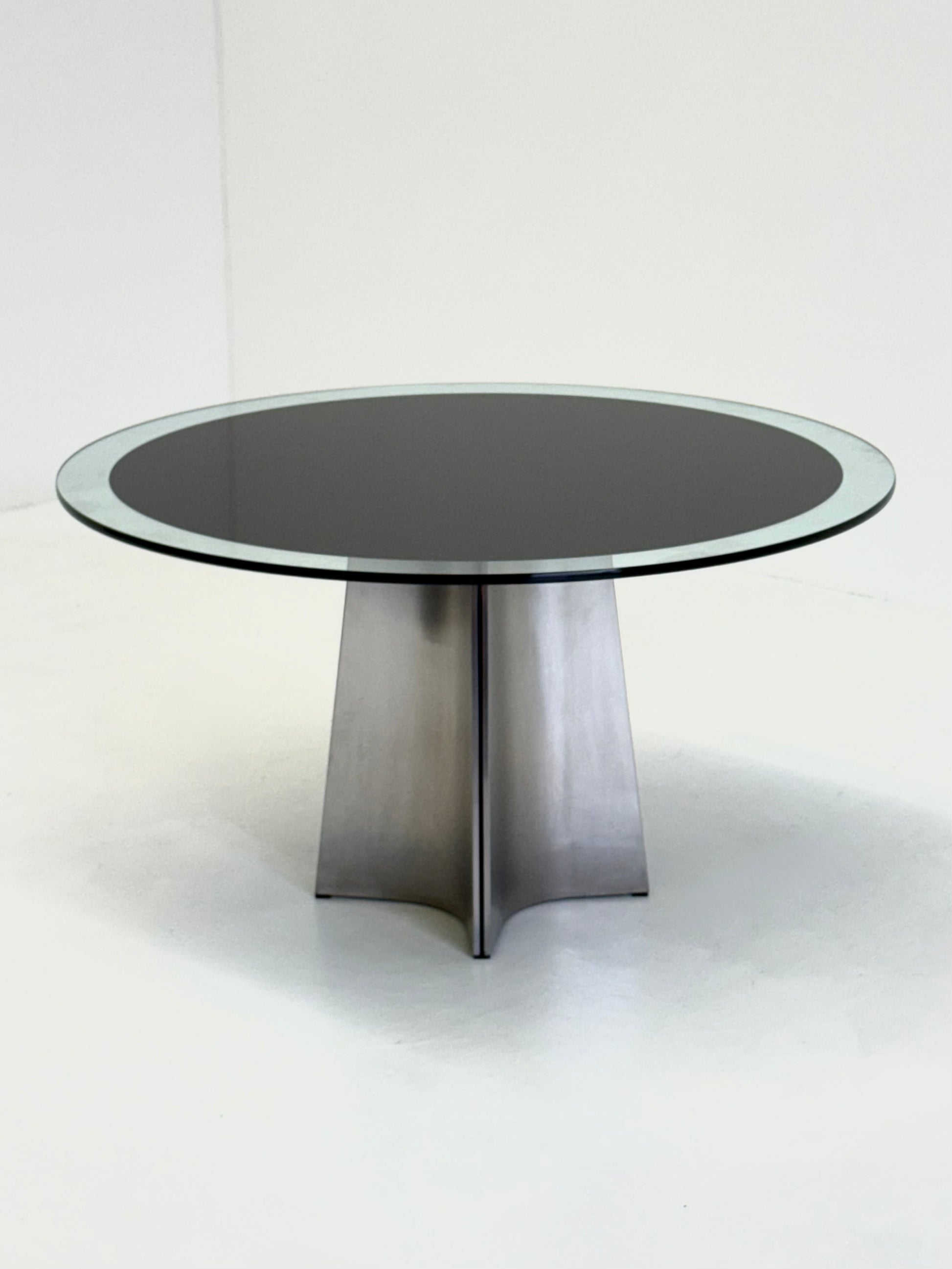 Prachtige vintage “UFO” eettafel ontworpen door Luigi Saccardo voor Arrmet in de jaren ’70, en later ook geproduceerd door Maison Jansen. De tafel heeft een opvallend onderstel van geborsteld roestvrijstaal, met een concave vorm aan vier zijden. Het glazen blad is voorzien van een zwart rond middenvlak, terwijl de rand transparant is, wat zorgt voor een bijzonder ruimtelijk en grafisch effect.
