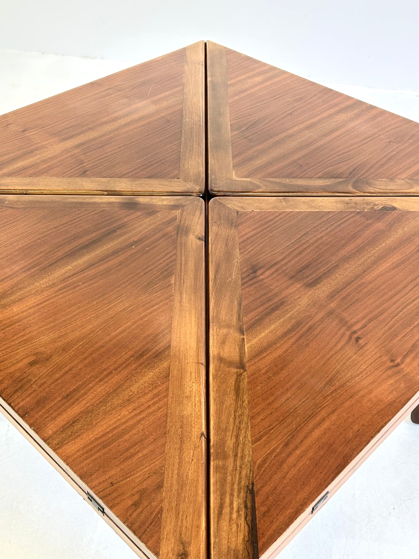 Het opklapbare tafelblad maakt het ontwerp bijzonder functioneel en onthult het elegante onderstel van massief notenhout.