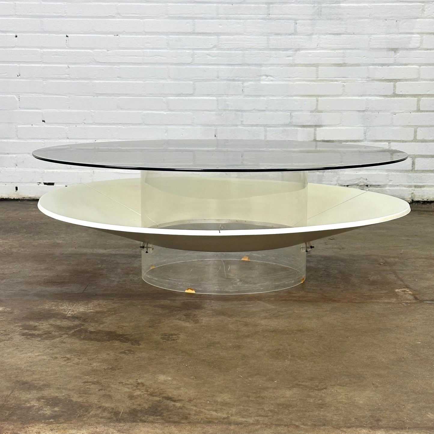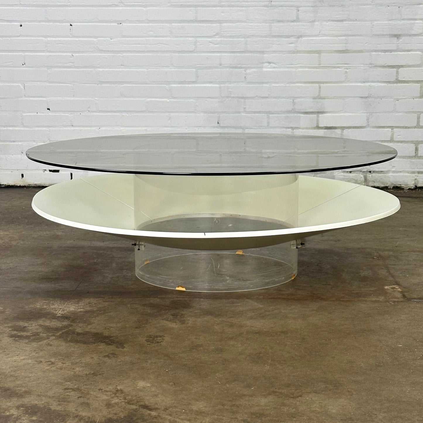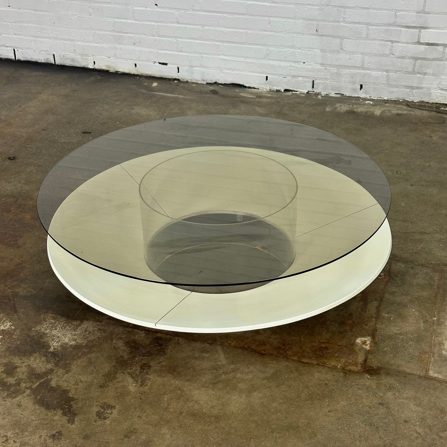 Deze bijzondere salontafel uit de jaren zeventig heeft een rookglazen tafelblad met een acrylglazen kern en een houten ring die extra opbergruimte biedt. Het ontwerp combineert materialen op een originele manier, wat het een opvallende toevoeging maakt aan elke interieurstijl.