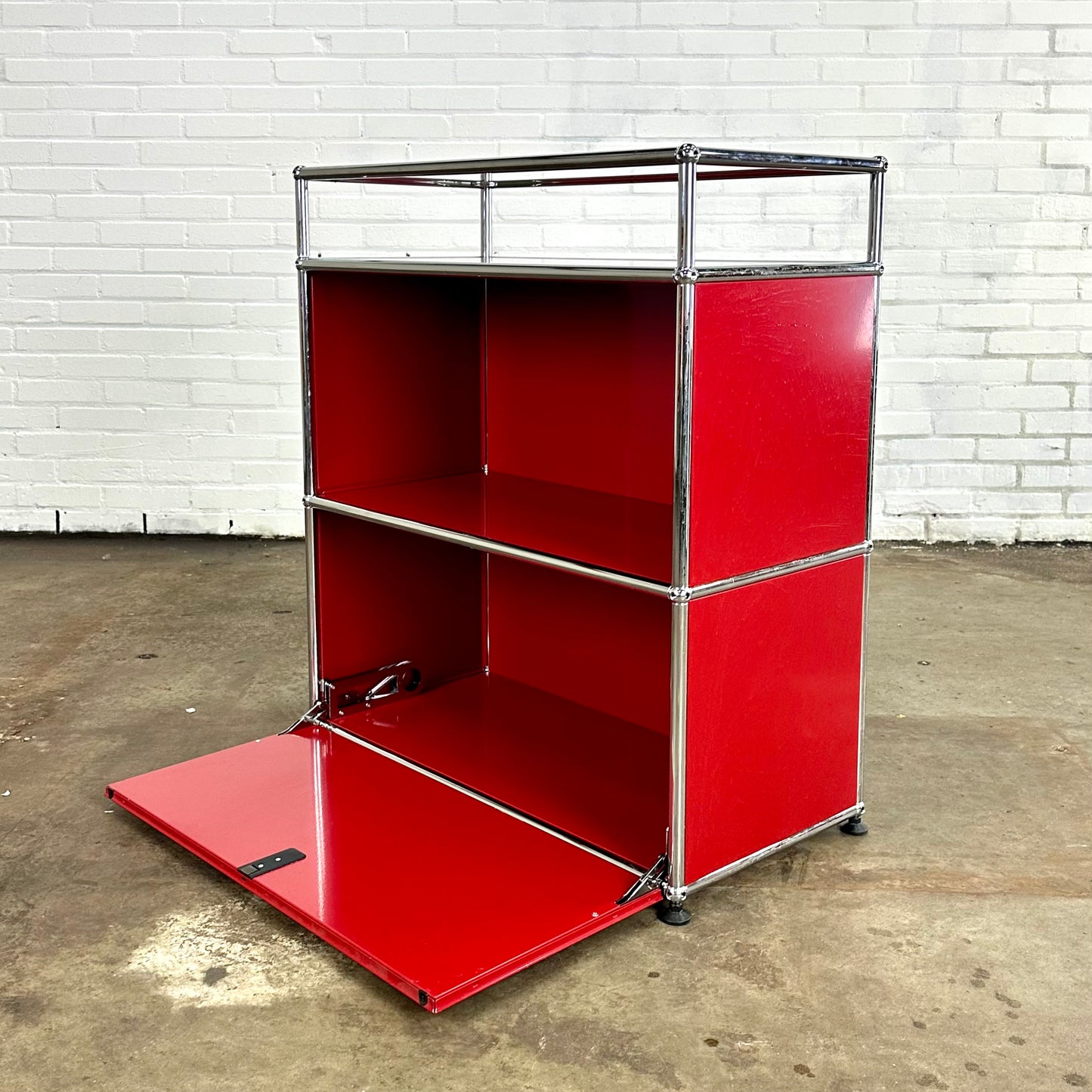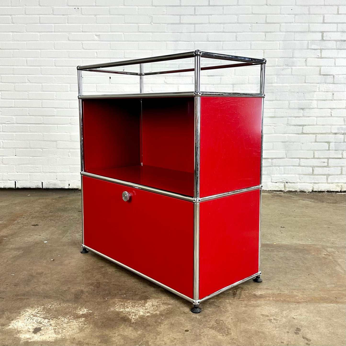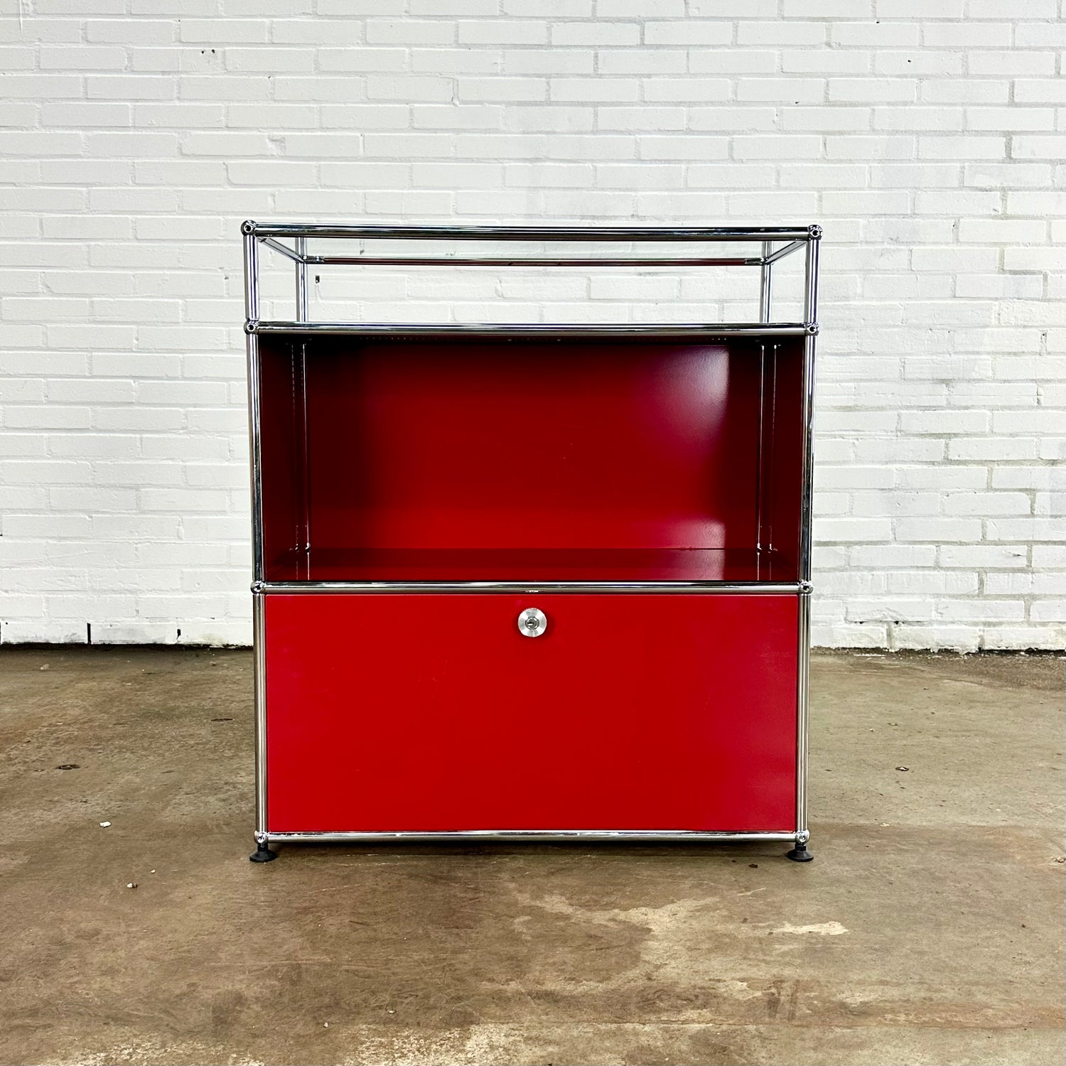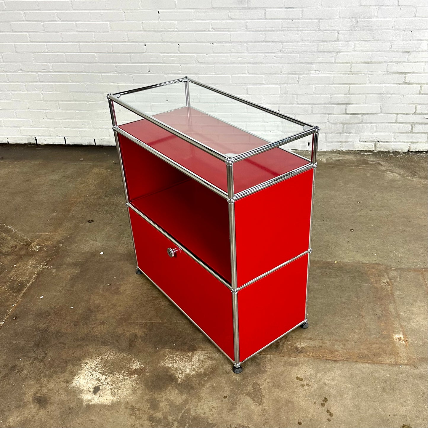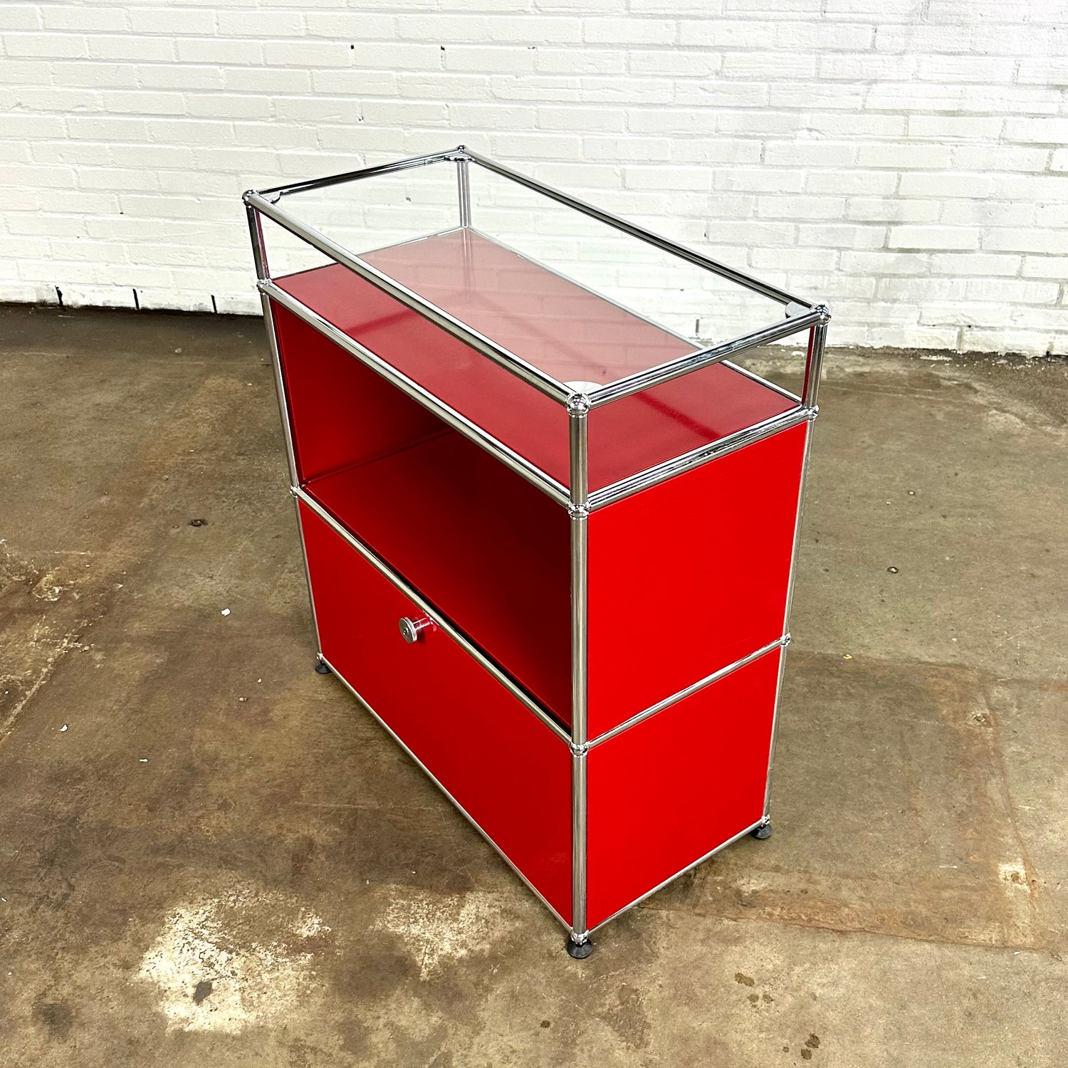 Omschrijving: De modulaire metalen USM Dressoir / kast in rood, met één glazen plank. Dit model heeft een klepdeur.