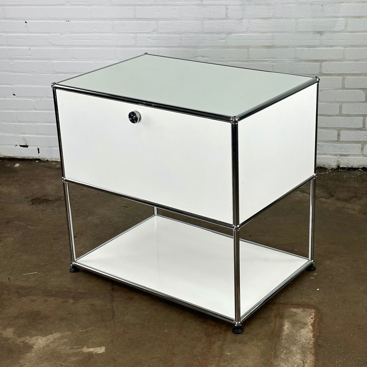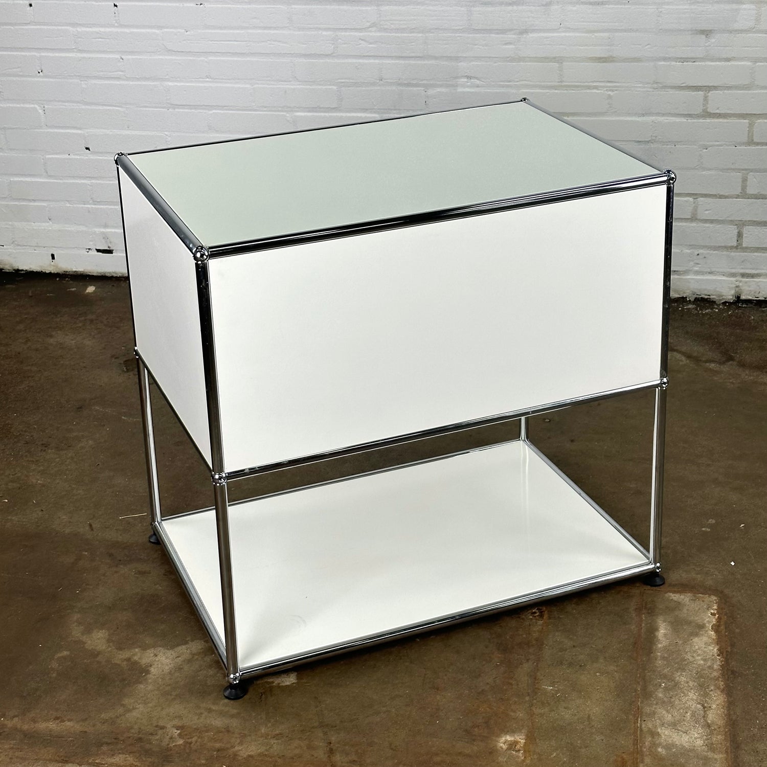 Omschrijving: De modulaire metalen USM Dressoir / kast in wit met één klep deur en een open onderkant.