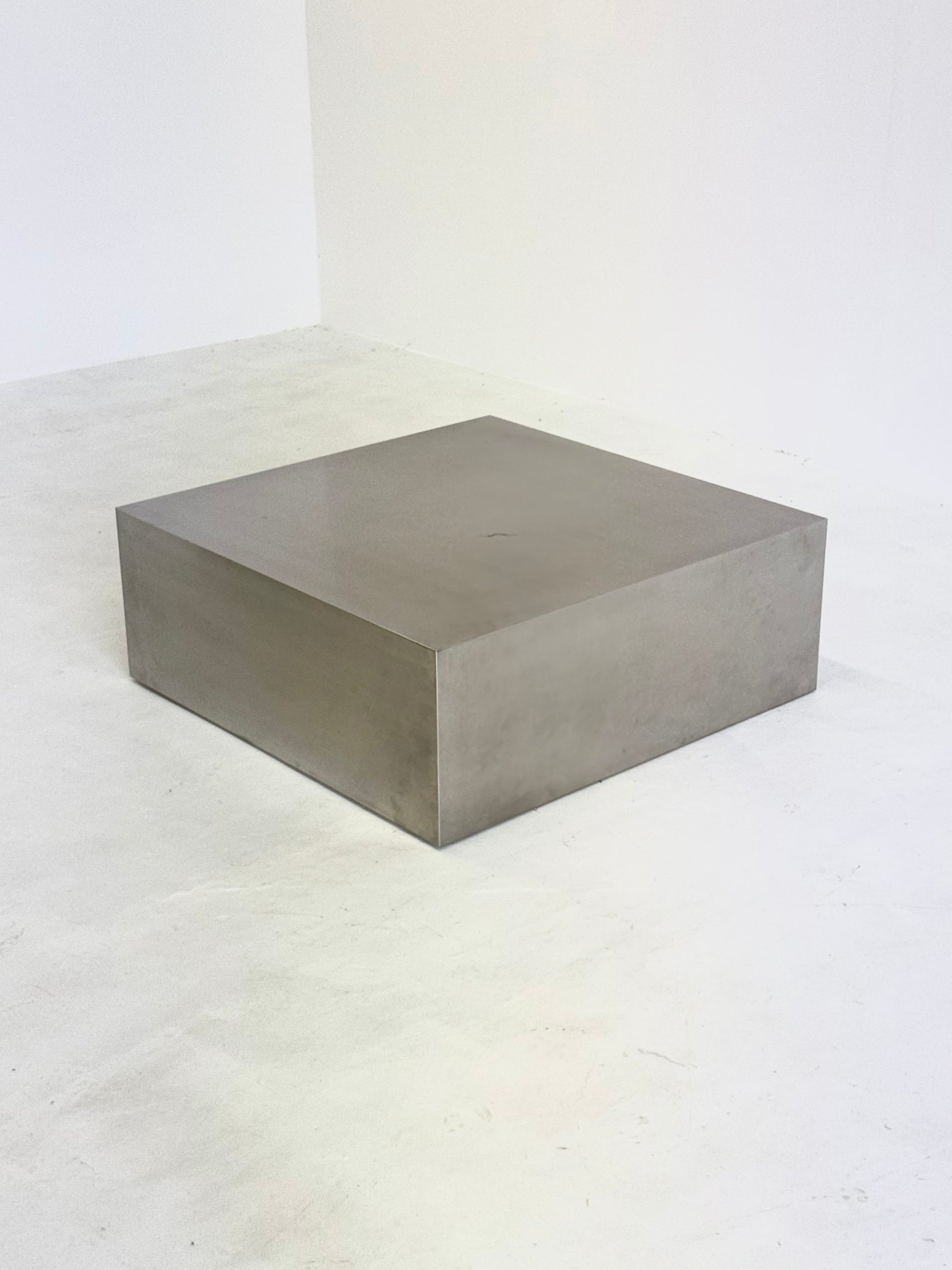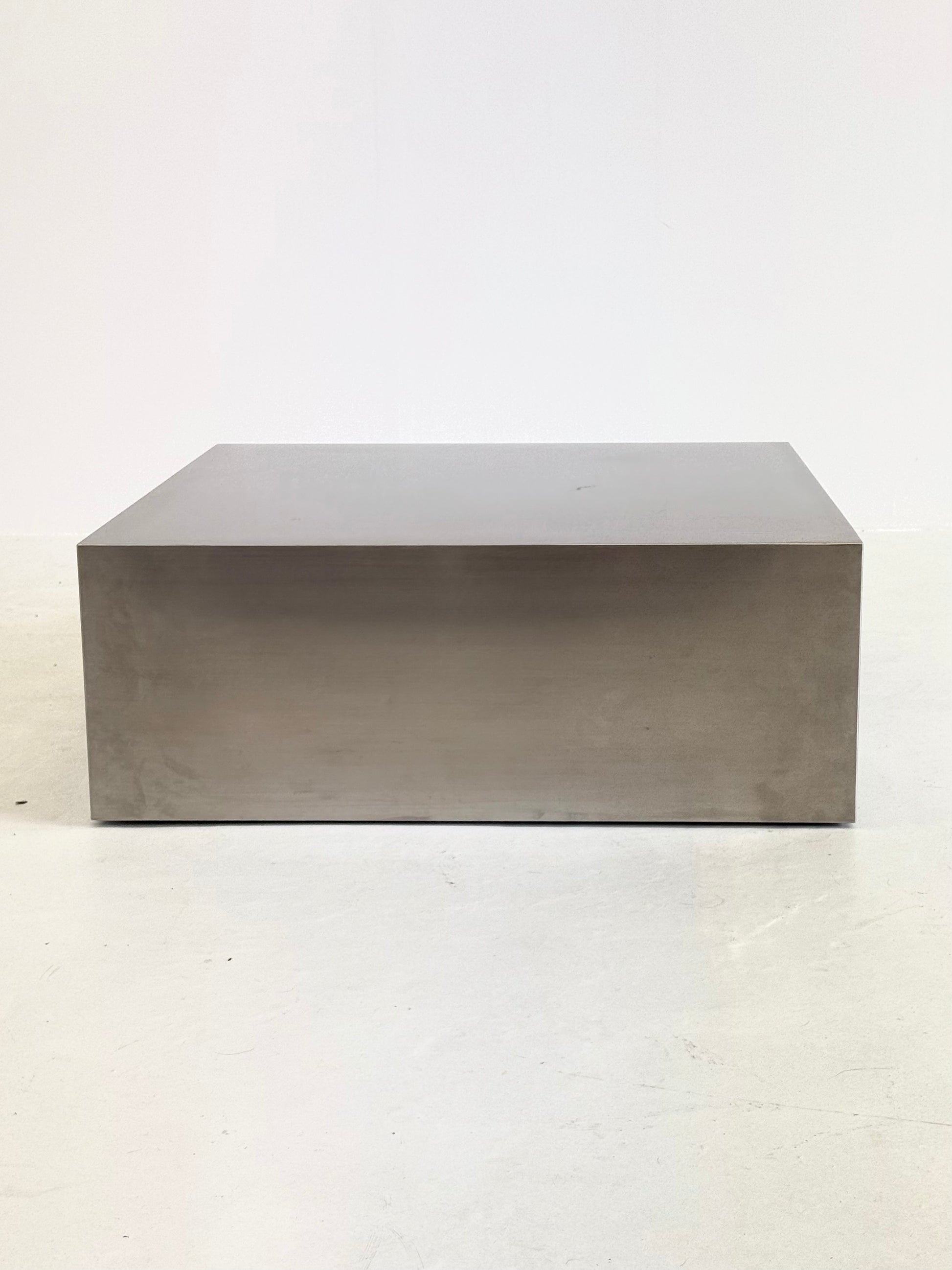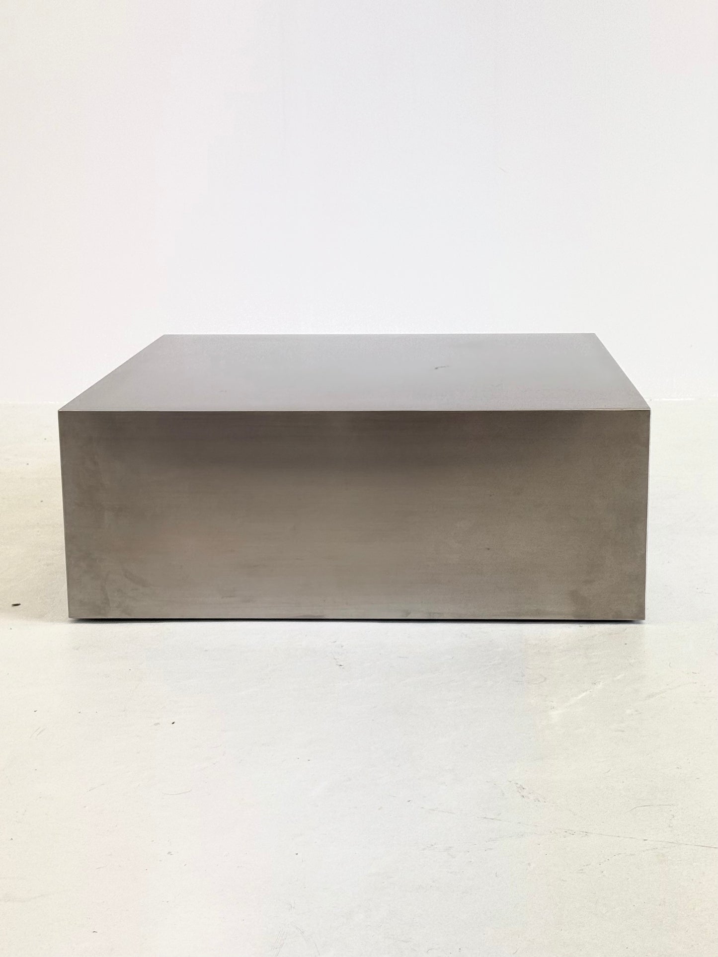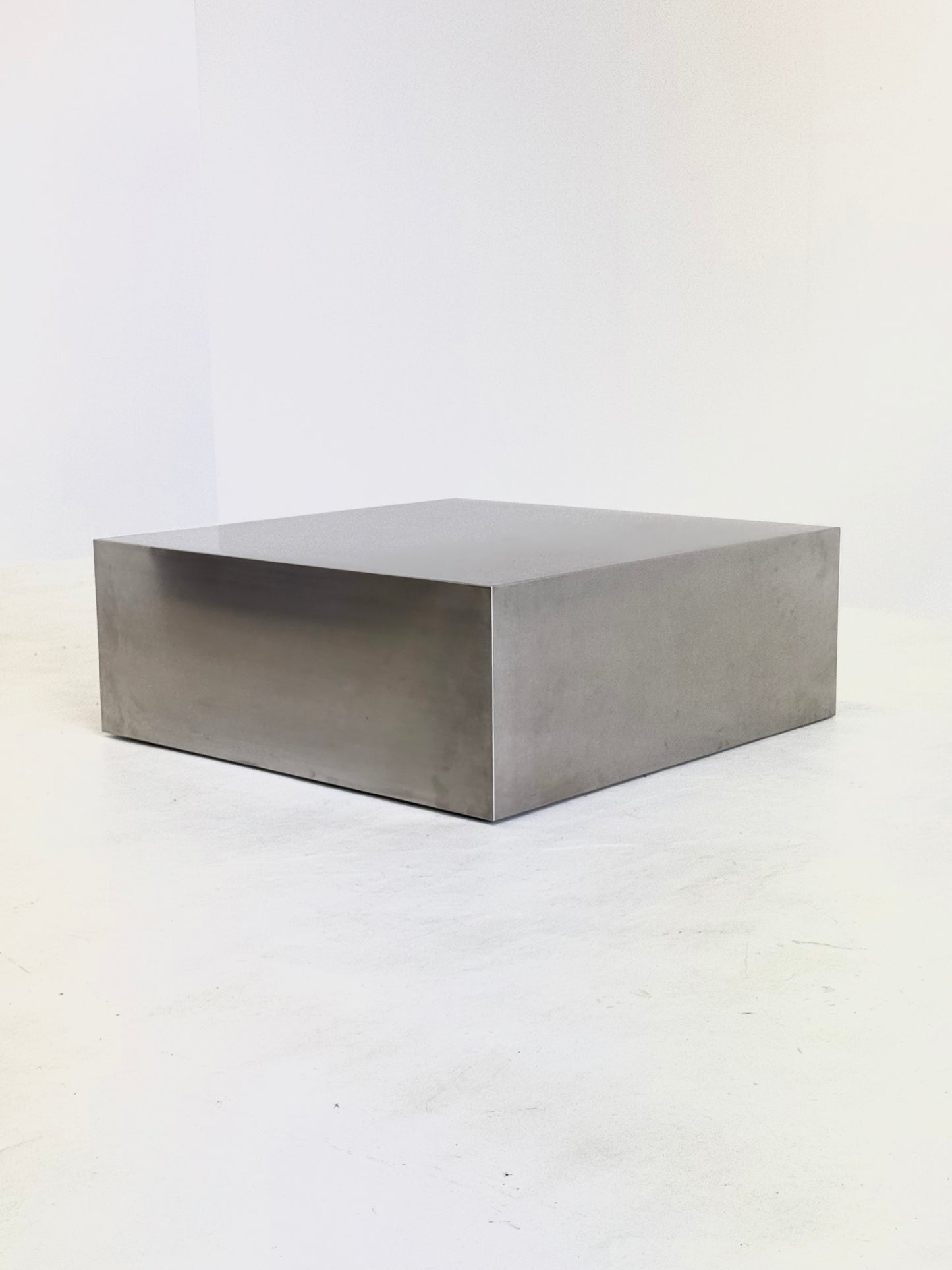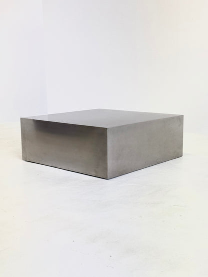 Deze vierkante salontafel is een strakke en moderne blok tafel gemaakt van roestvrij staal (RVS). Het minimalistische ontwerp benadrukt de robuuste en industriële uitstraling van het materiaal.