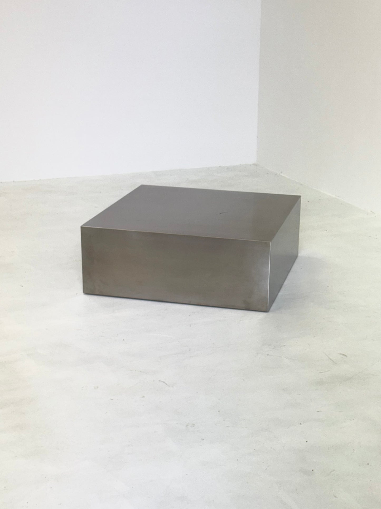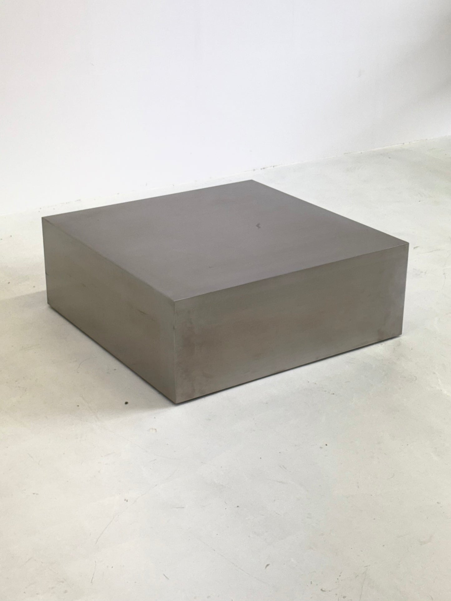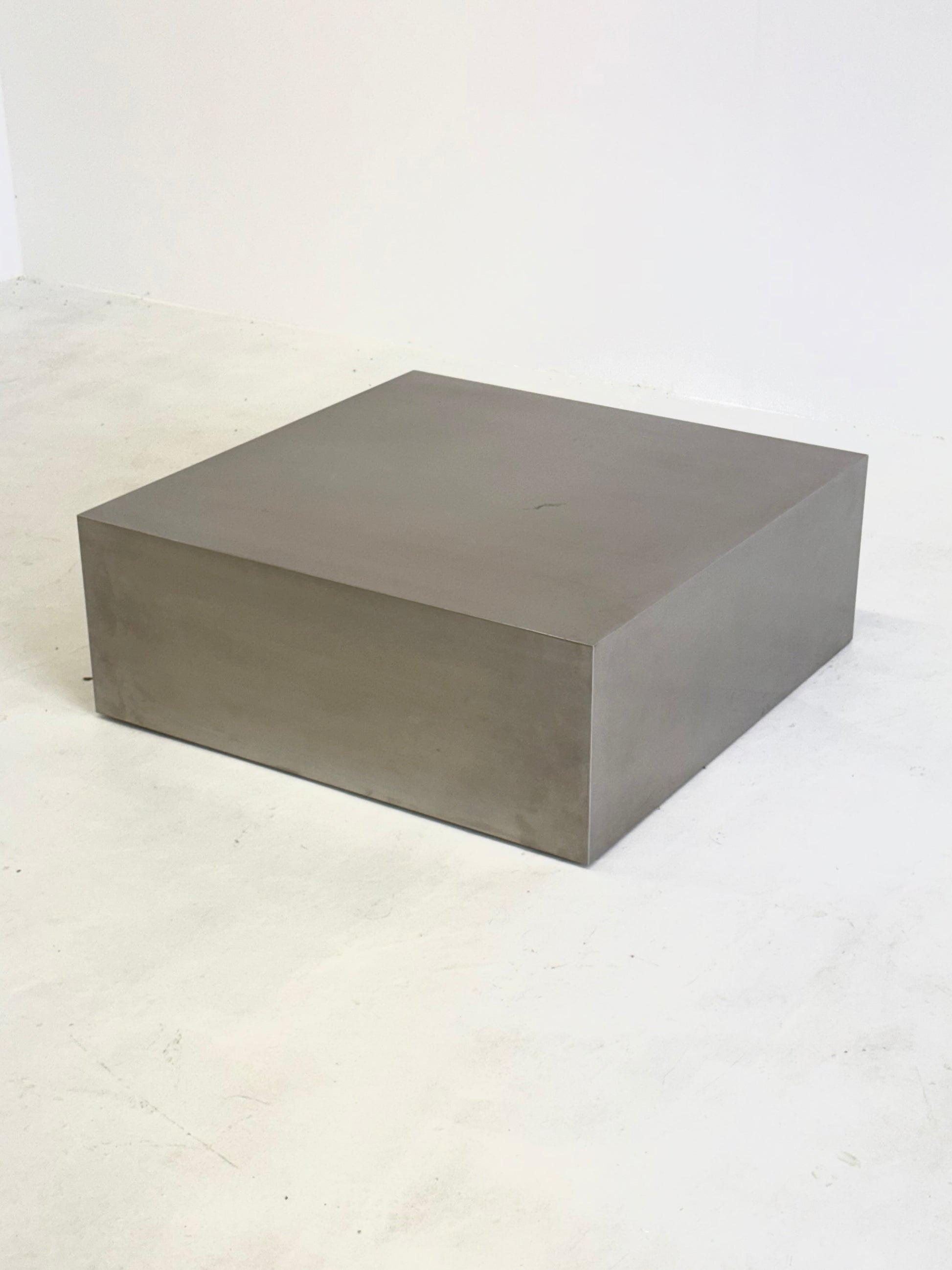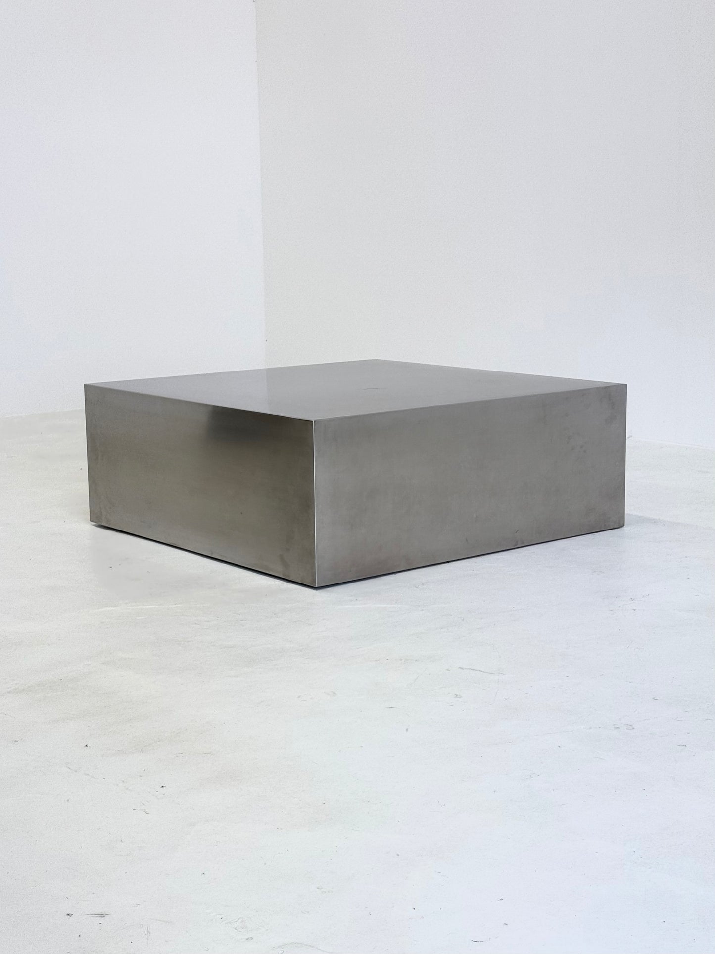 Deze vierkante salontafel is een strakke en moderne blok tafel gemaakt van roestvrij staal (RVS). Het minimalistische ontwerp benadrukt de robuuste en industriële uitstraling van het materiaal.