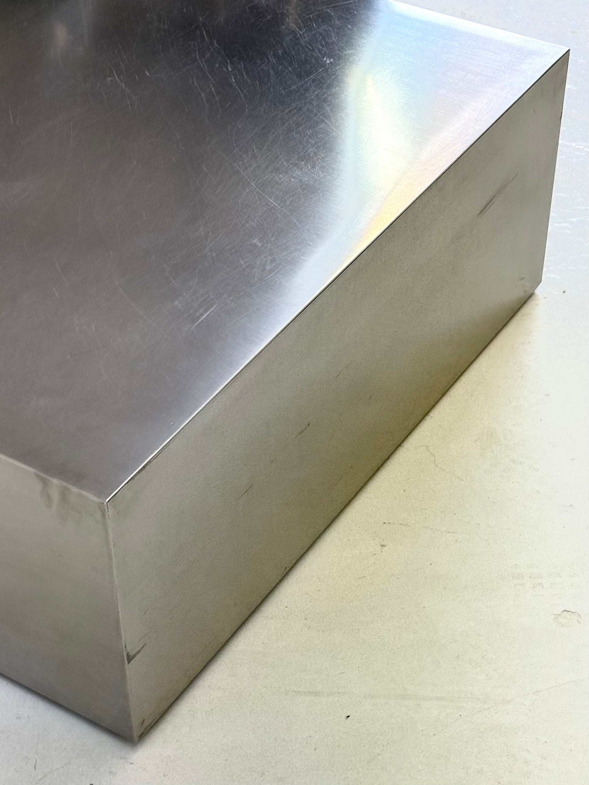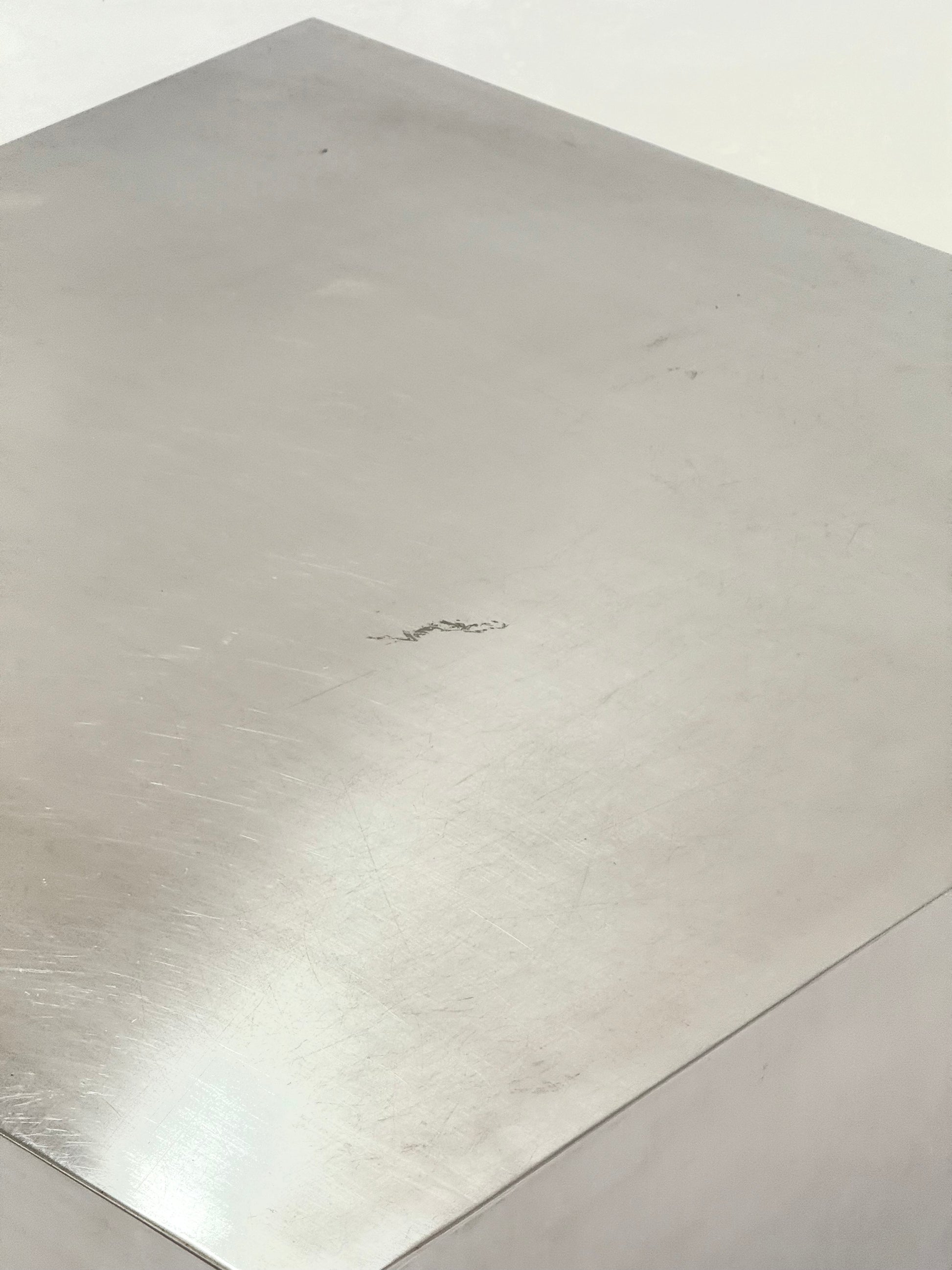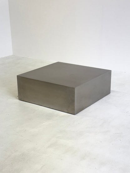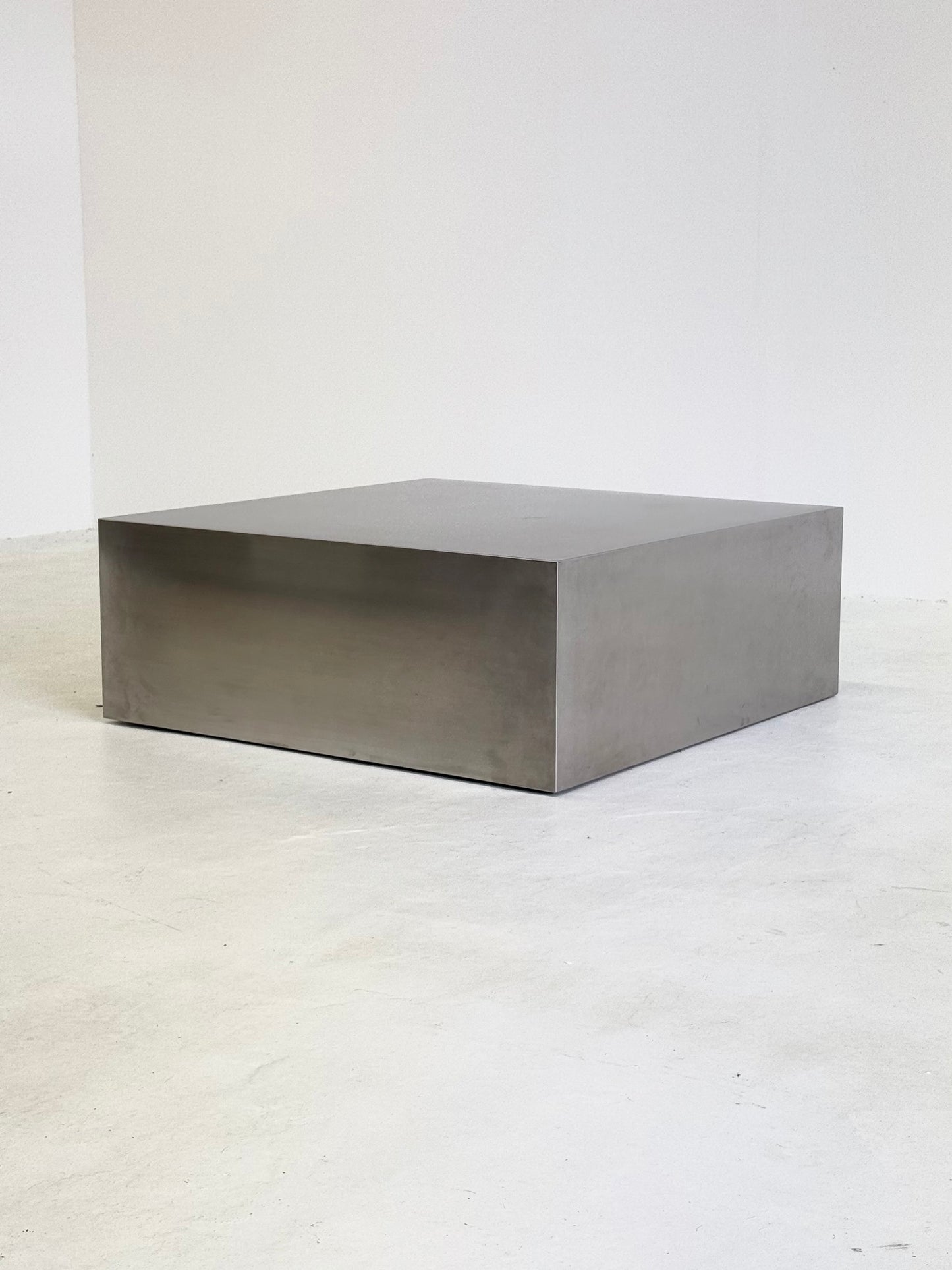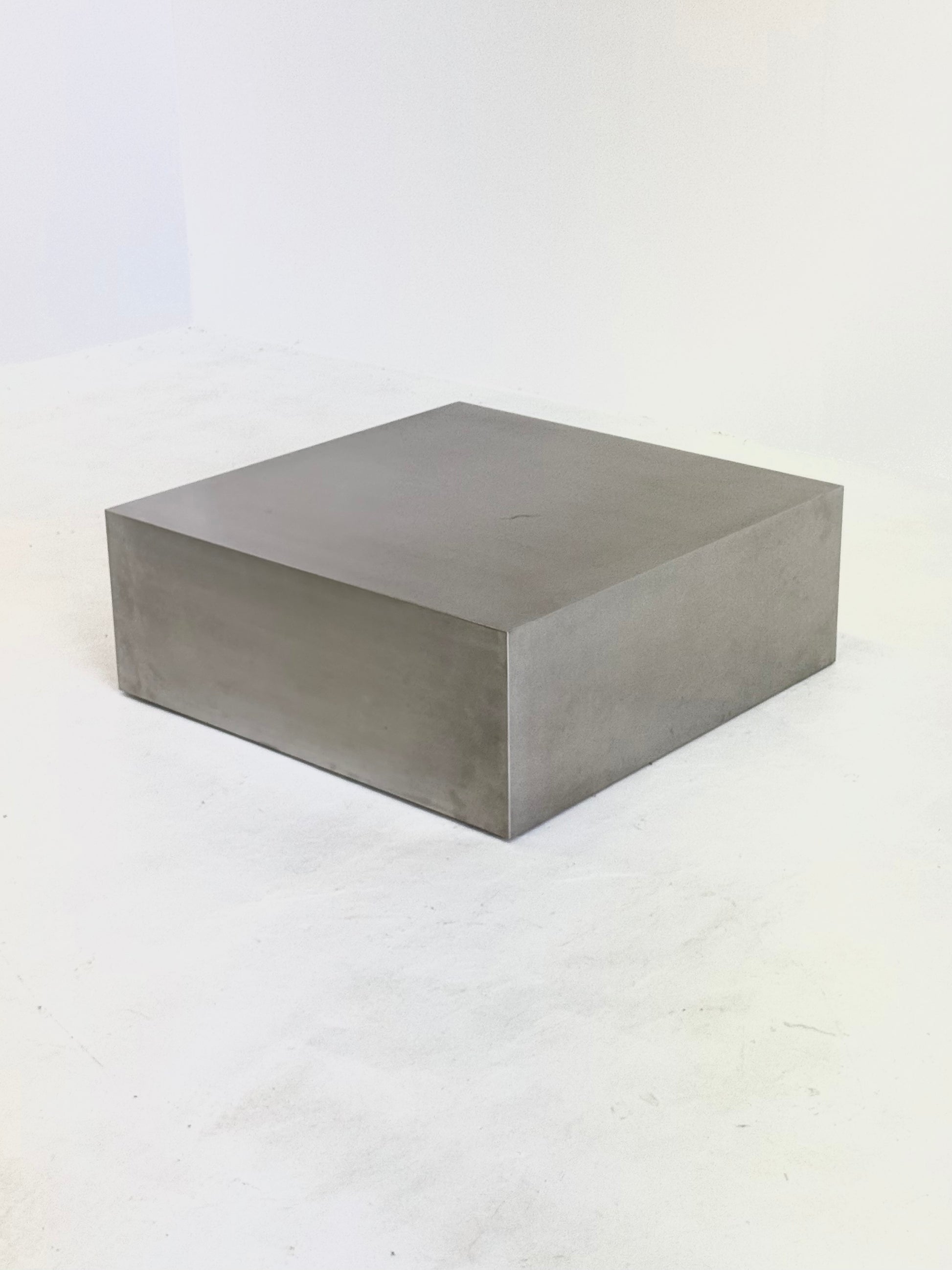 Deze vierkante salontafel is een strakke en moderne blok tafel gemaakt van roestvrij staal (RVS). Het minimalistische ontwerp benadrukt de robuuste en industriële uitstraling van het materiaal.