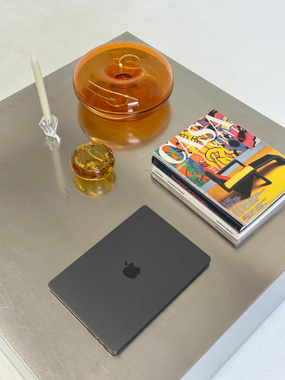 Het stevige structuur van het RVS maken de tafel niet alleen functioneel, maar ook een opvallend designobject.