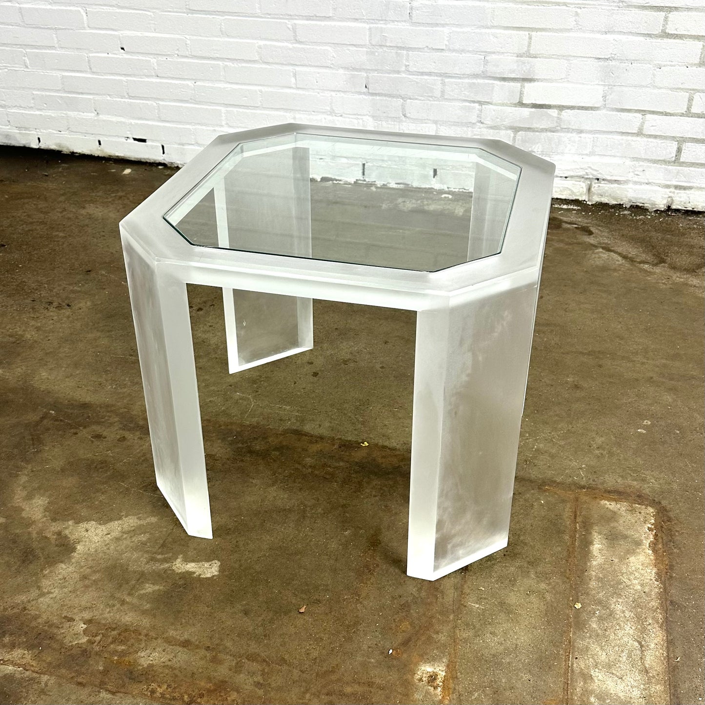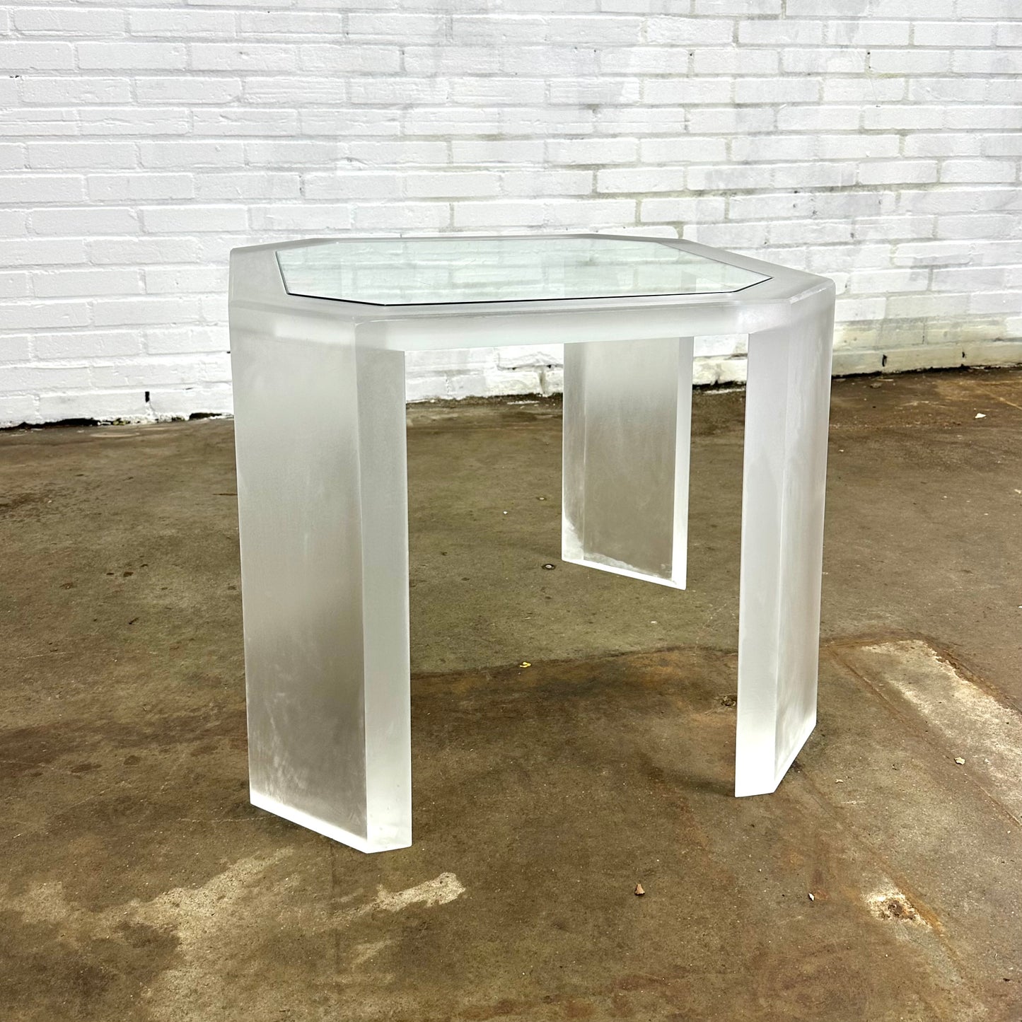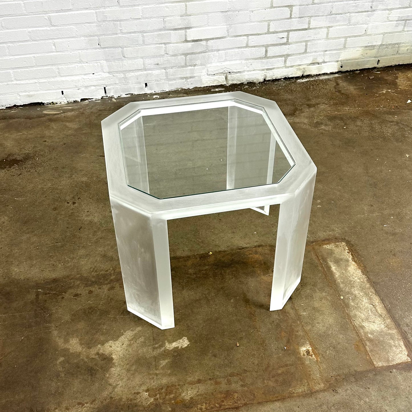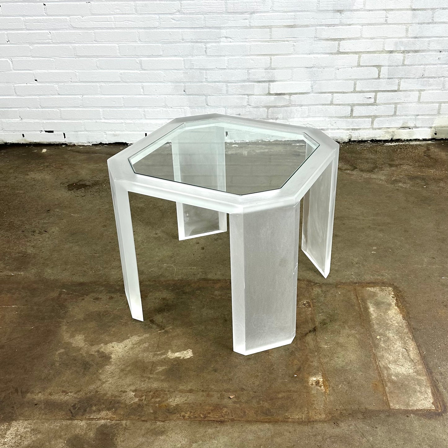 Omschrijving: Vintage acryl salontafel / bijzettafel in glam rock stijl. De tafel lijkt op een model van David Lange