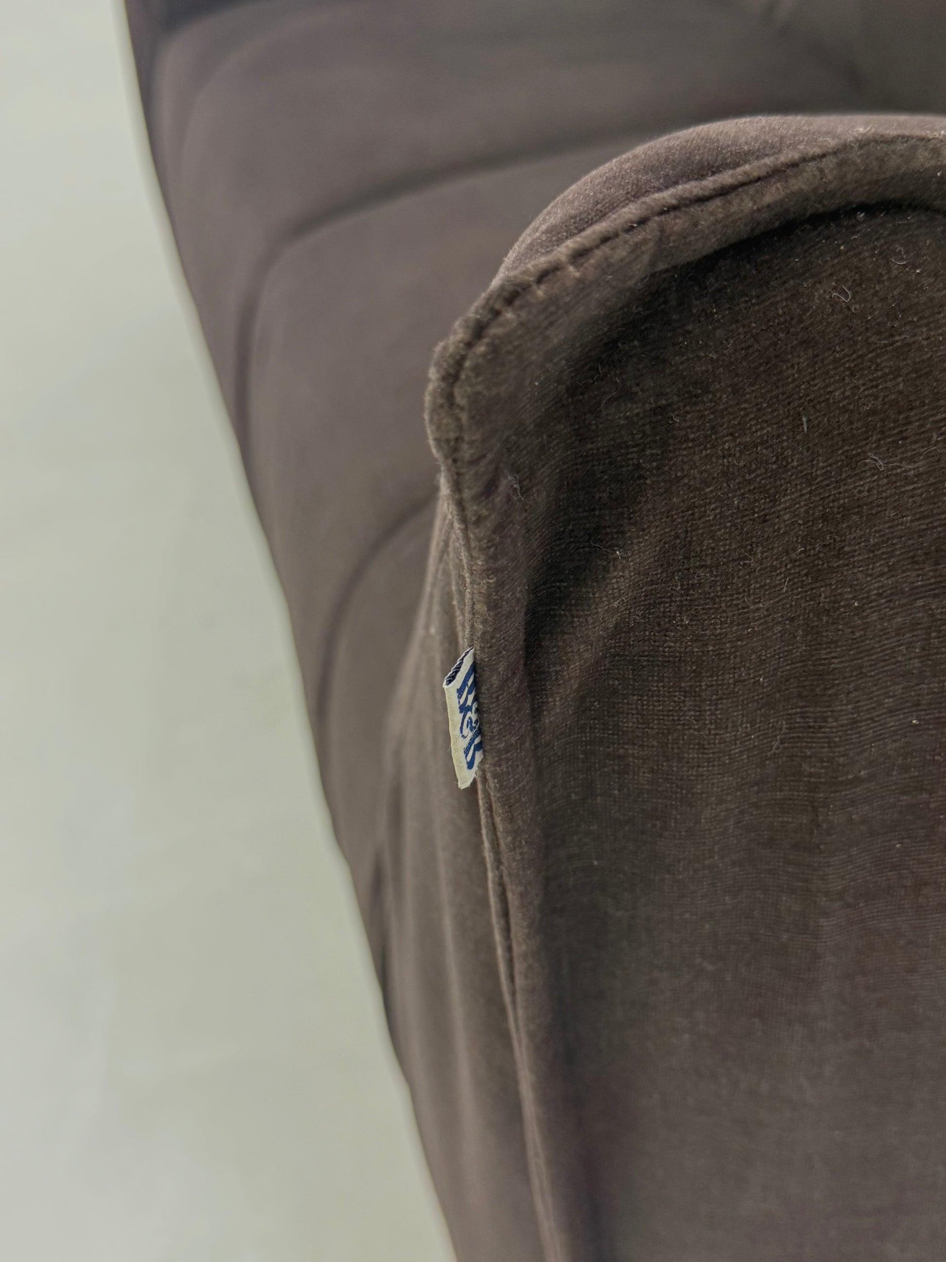 De bank is opnieuw gestoffeerd met donkerbruin velvet stof. Dankzij de vorm uit één stuk oogt het model zowel strak als uitnodigend. Een stijlvolle en tijdloze eyecatcher die elegantie, karakter en klasse toevoegt aan elke ruimte.