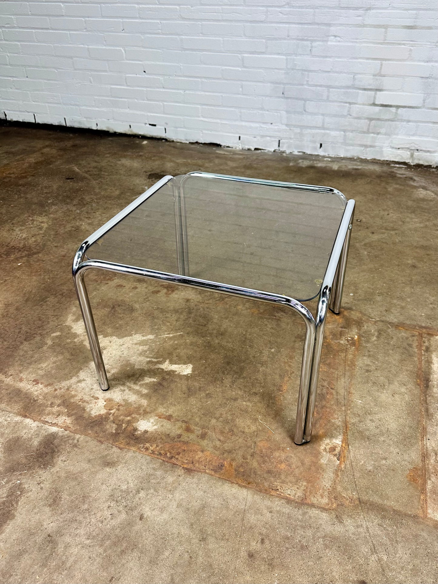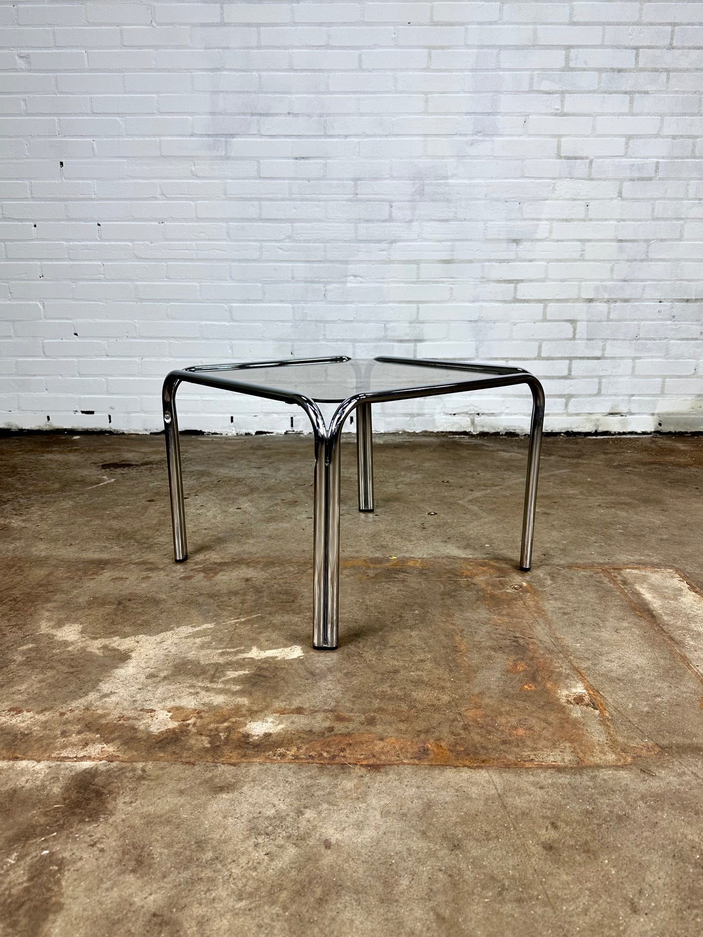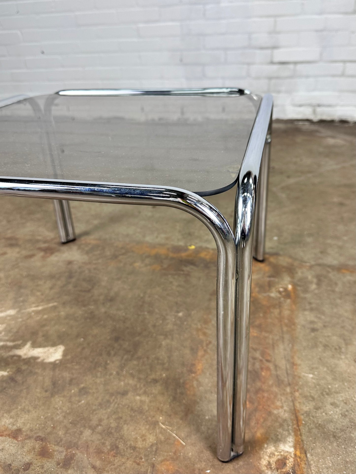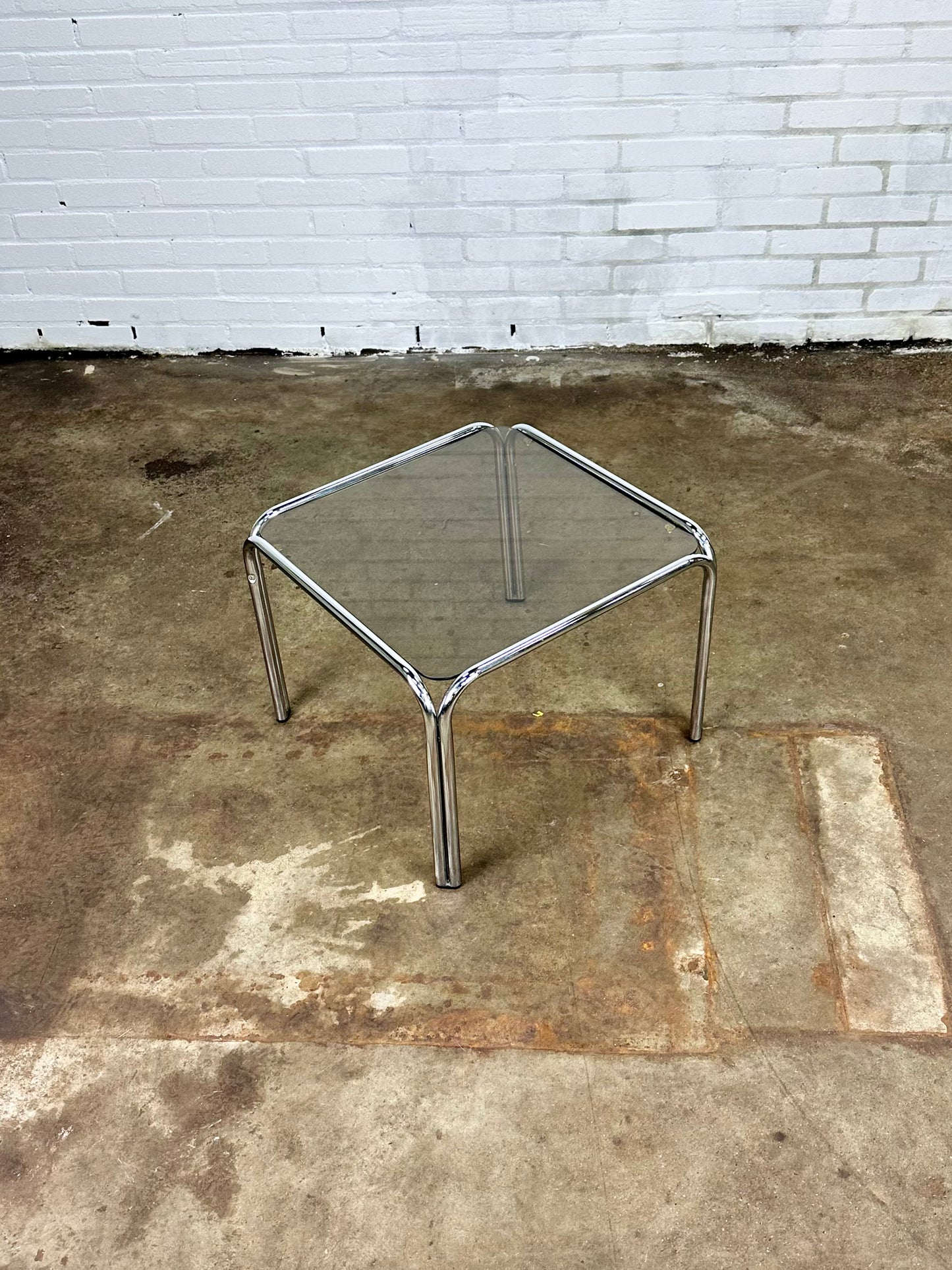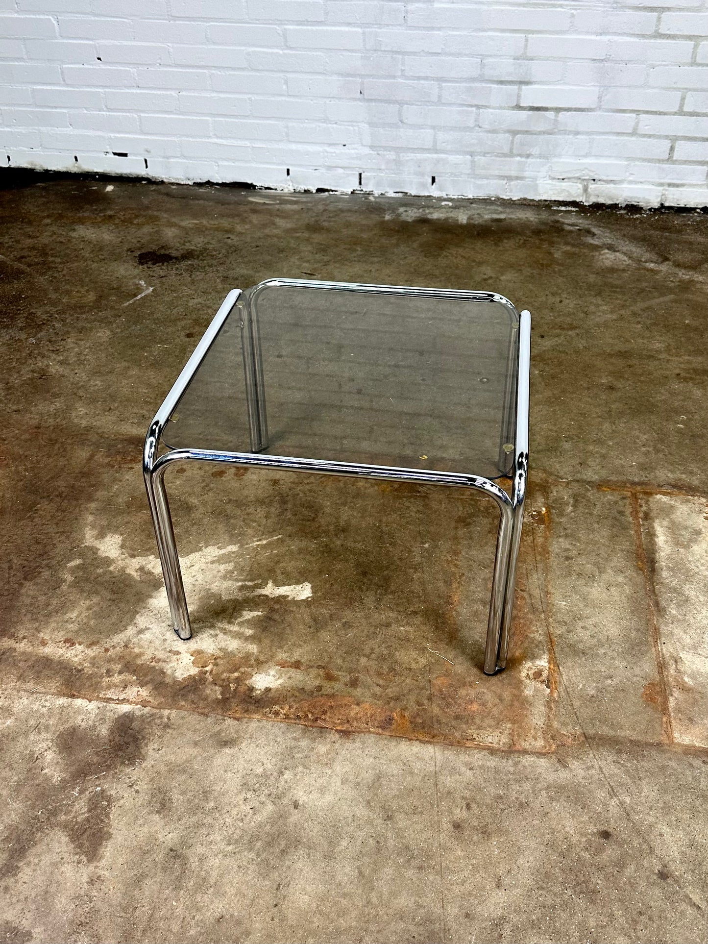 Omschrijving: Vintage salontafel in verchroomd metaal en rookglas.