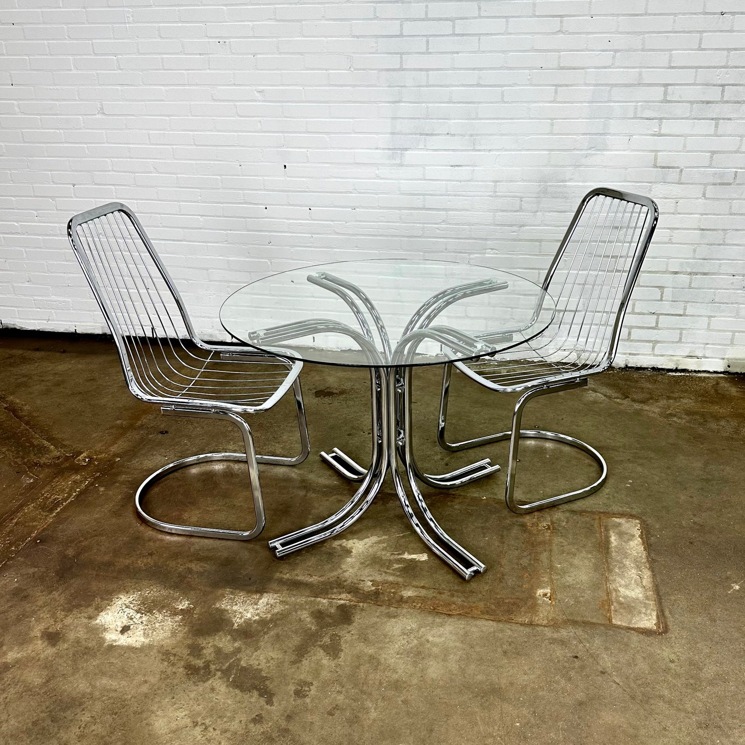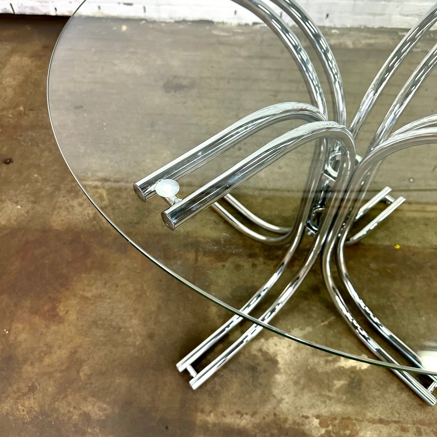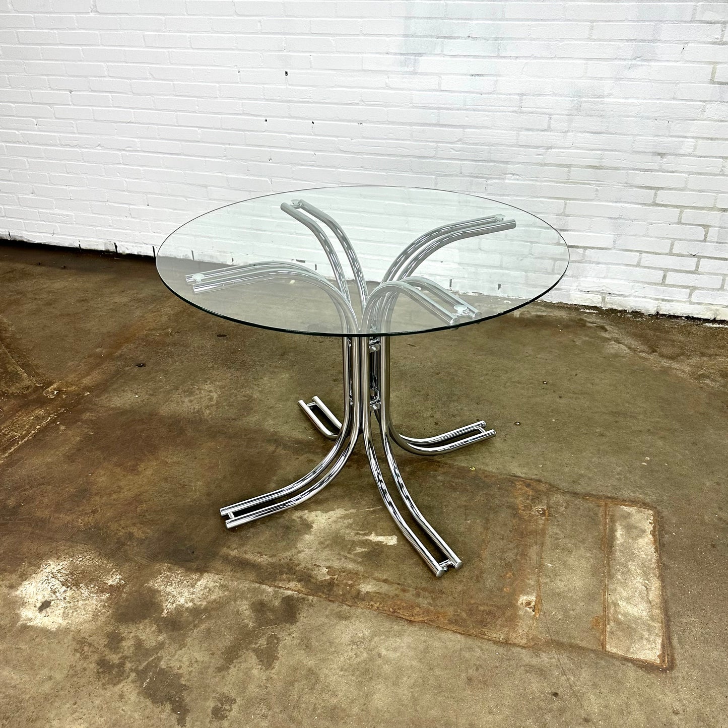 Omschrijving: Italiaanse ronde vintage eettafel met glazen blad en buisframe onderstel