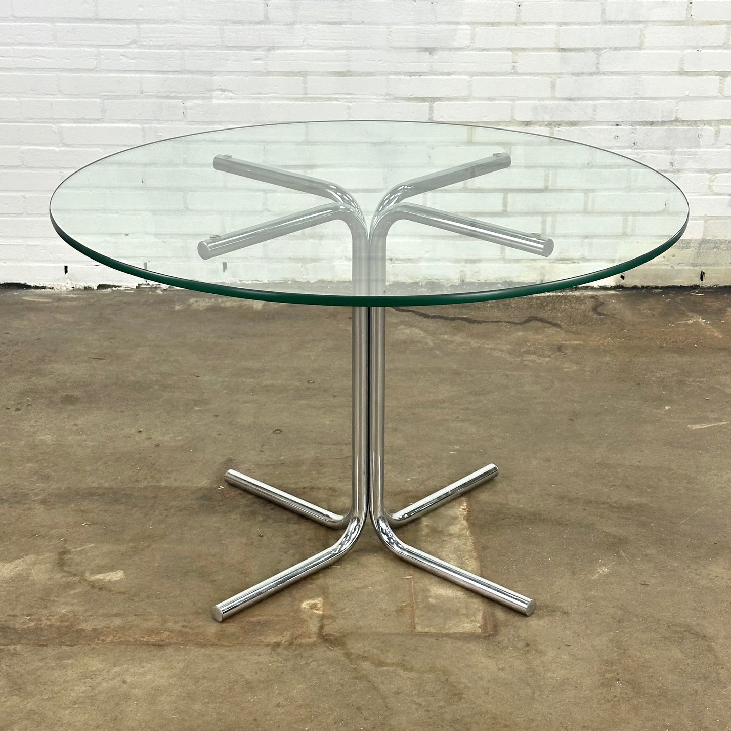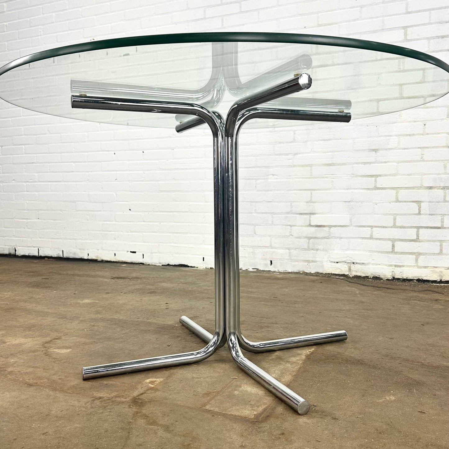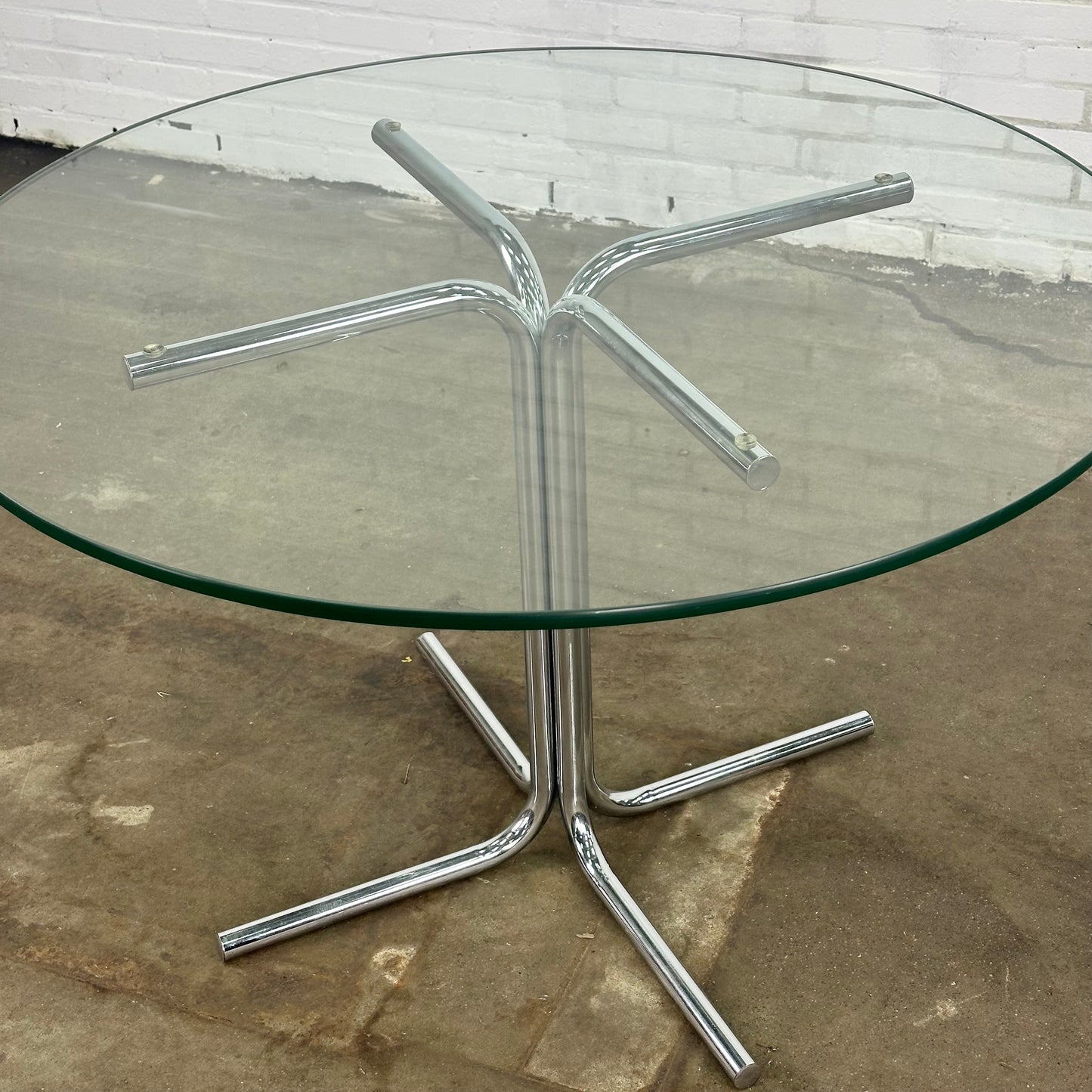 Omschrijving: Italiaanse ronde vintage eettafel met glazen blad en buisframe onderstel